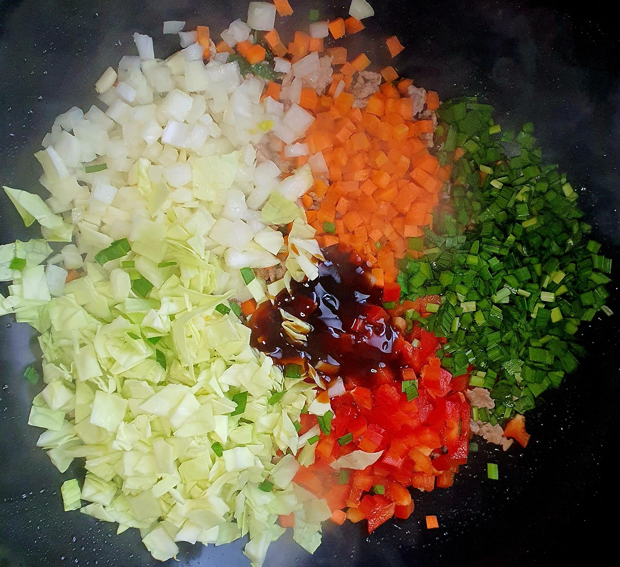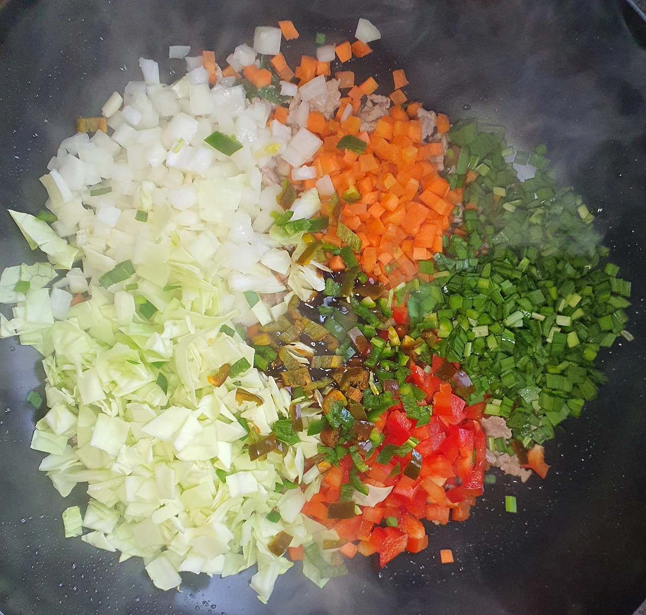 • 고기가 색이 변할 정도로 볶아지면 준비한 야채를 모두 넣어주고, 굴소스. 데리야끼소스. 참치액을 넣고 볶아준다.