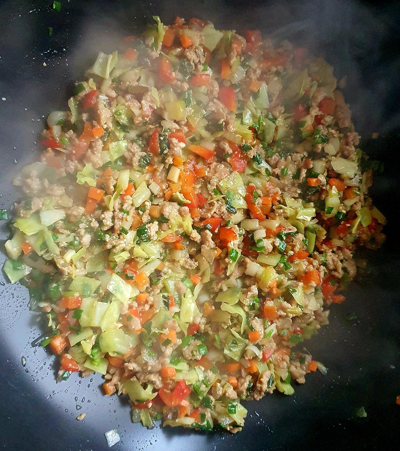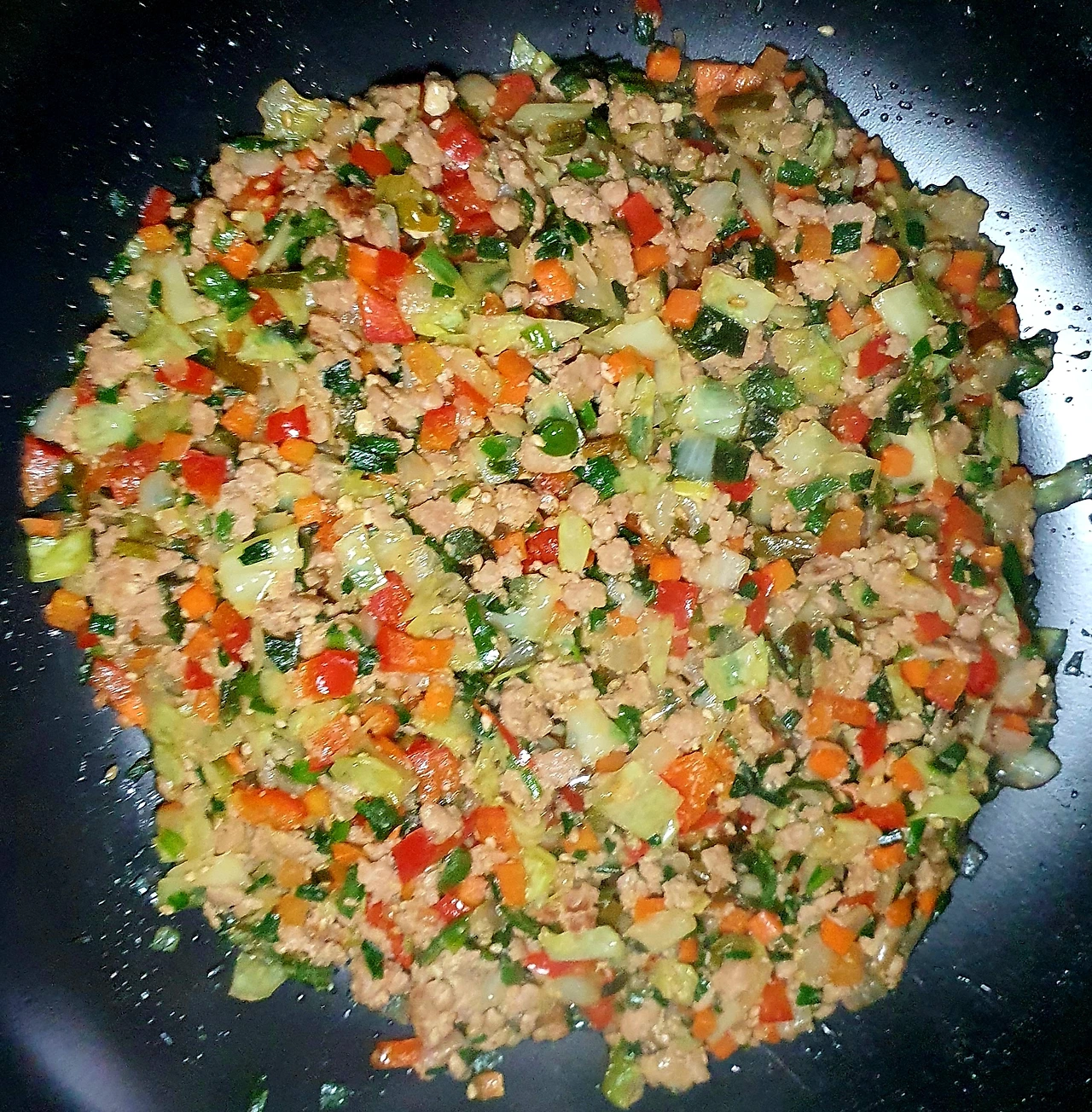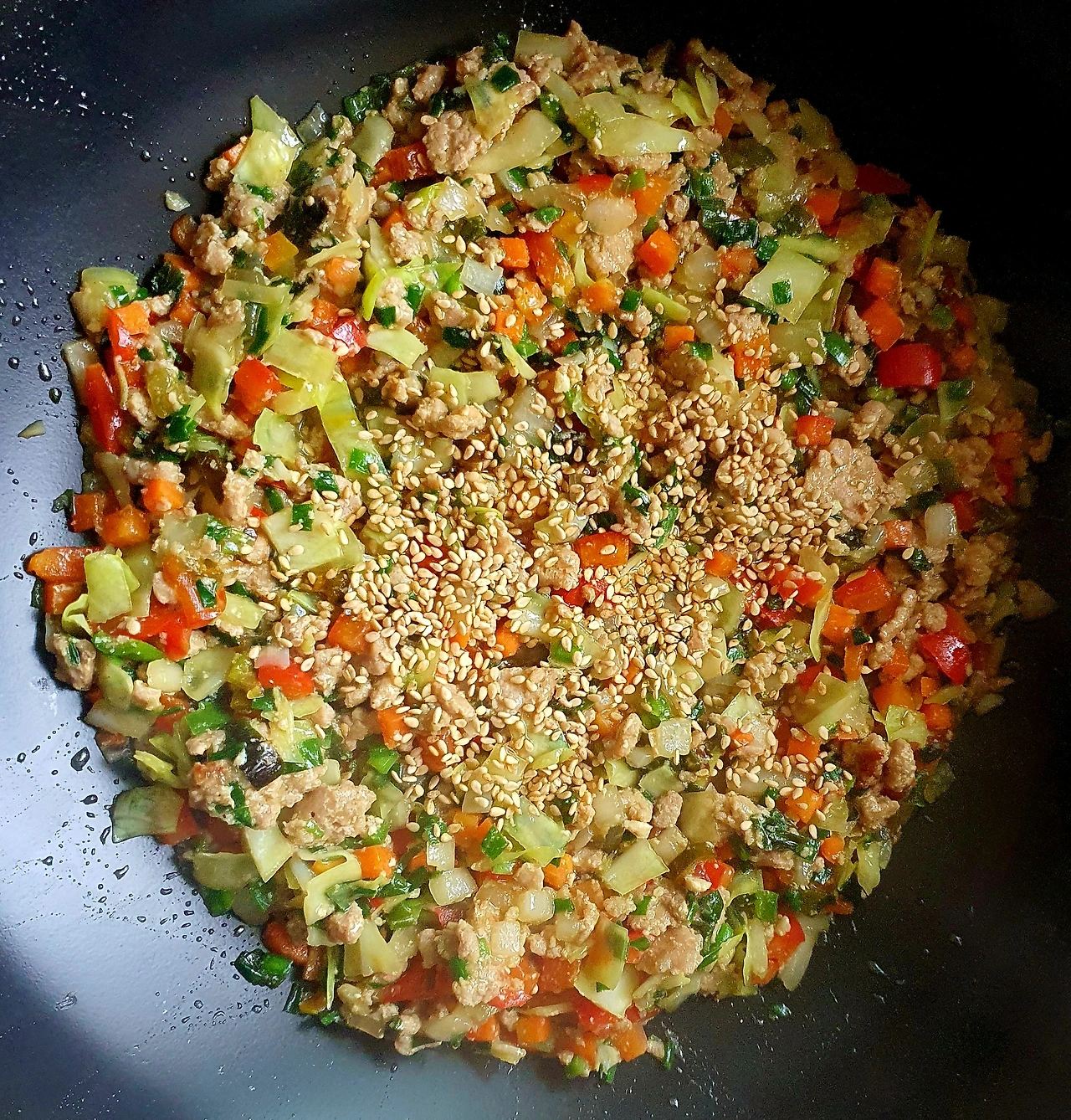 • 야채가 다 익으면 불을 끄고 참기름과 통깨를 넣고 섞어주면 딤섬 소 준비 완성.
