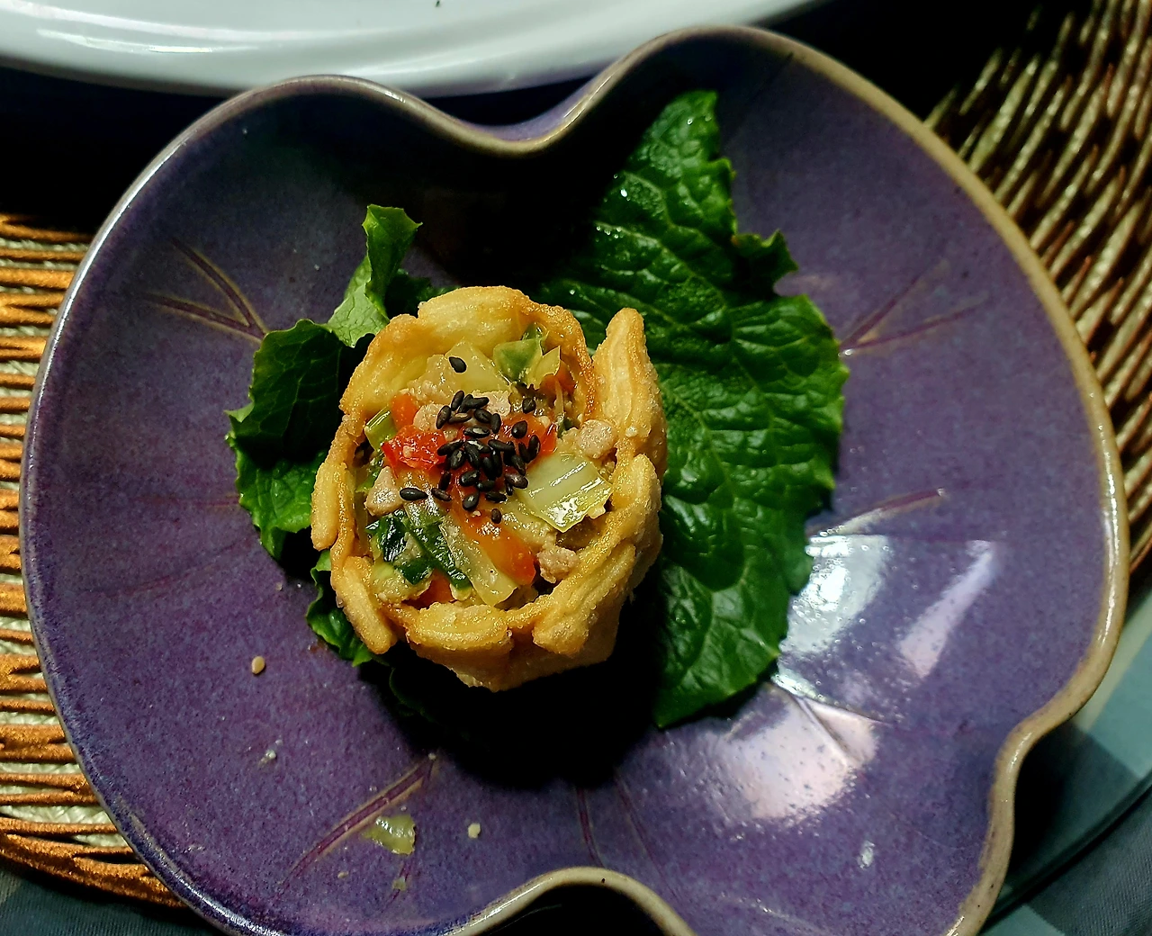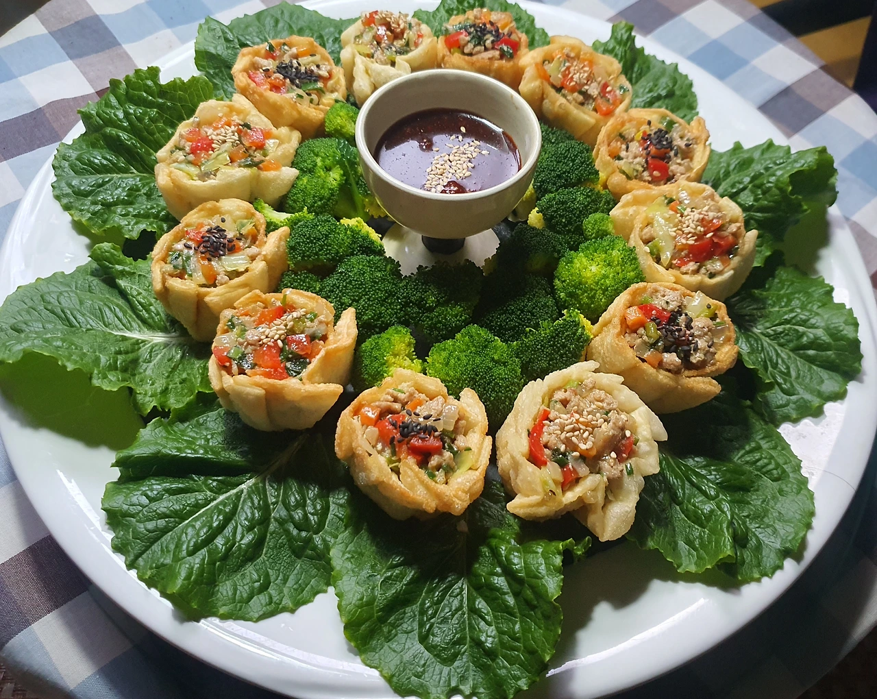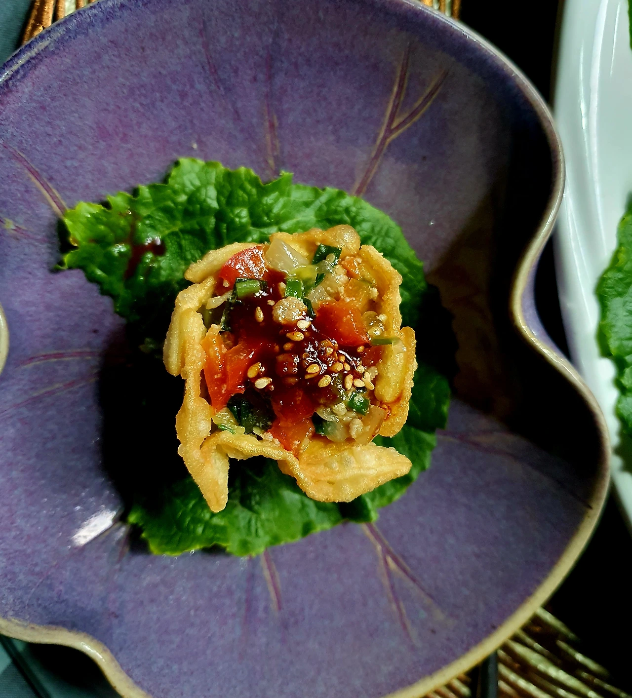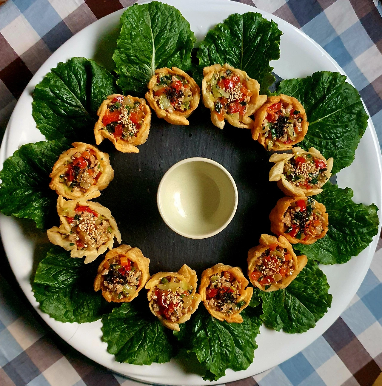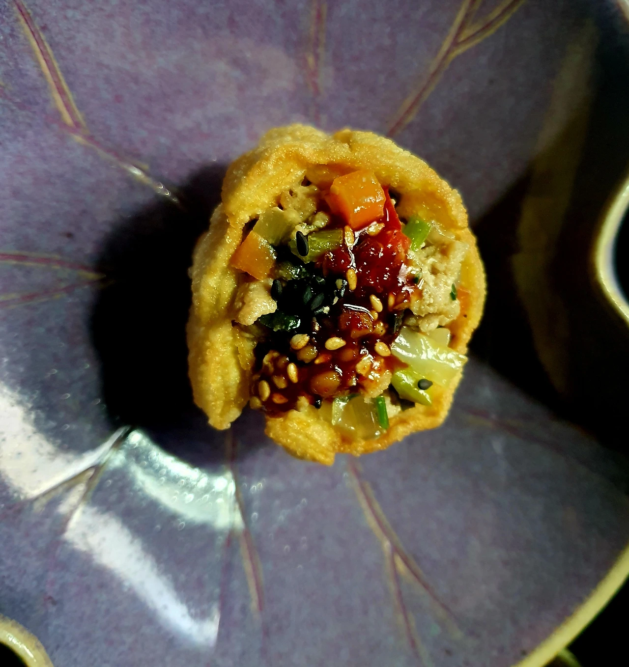 • 튀겨진 딤섬피에 미리 볶아두었던 소를 가득 담아서 완성 접시에 담아주면 요리헌터식 딤섬 완성.