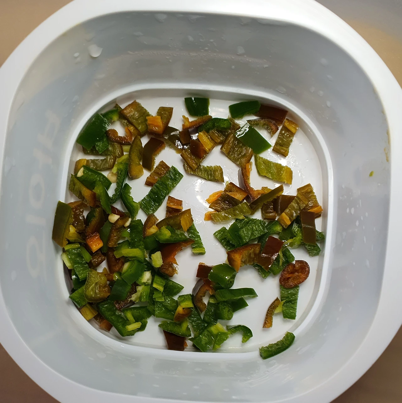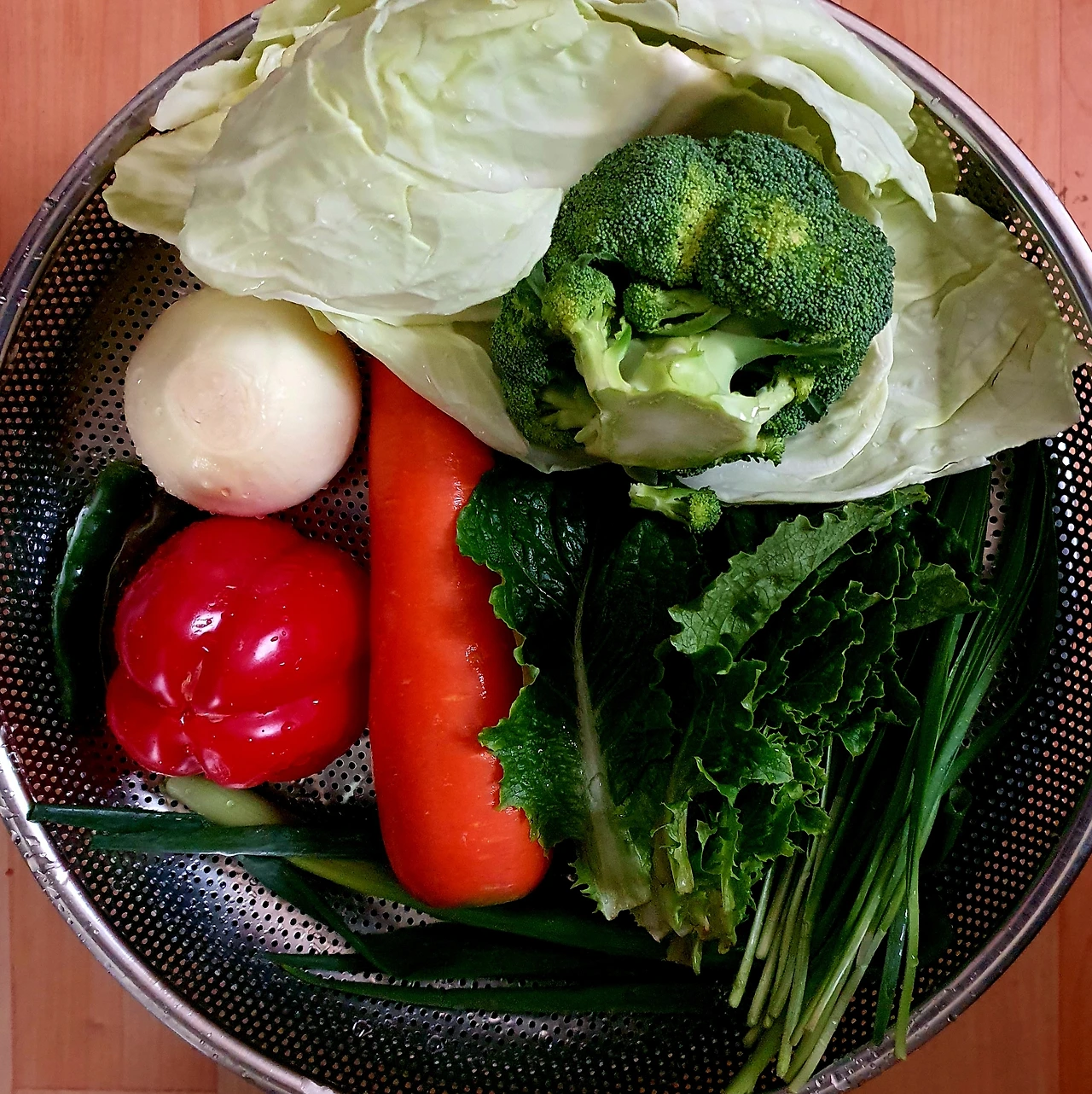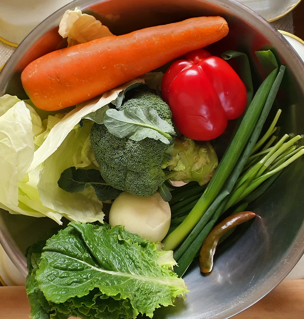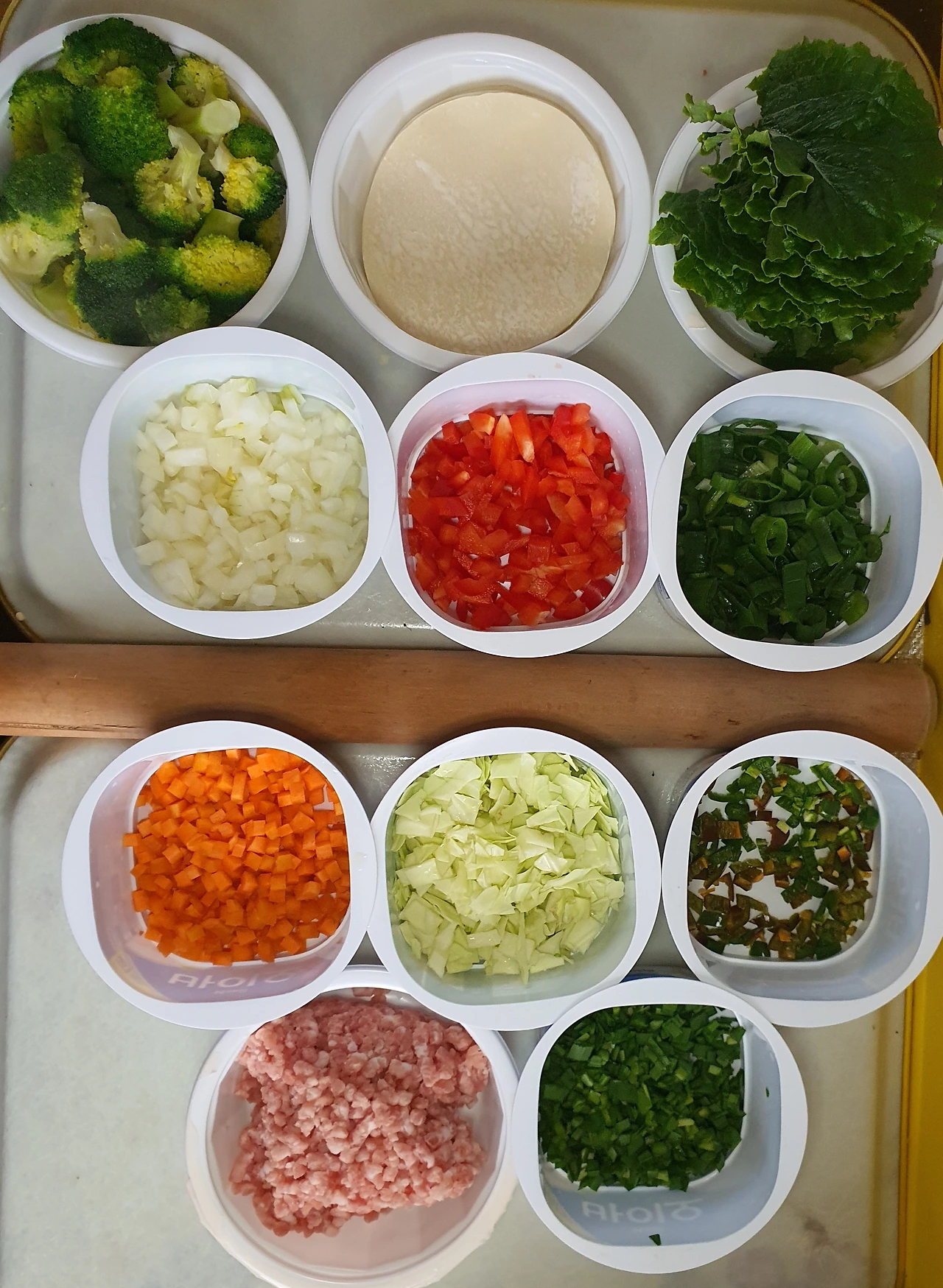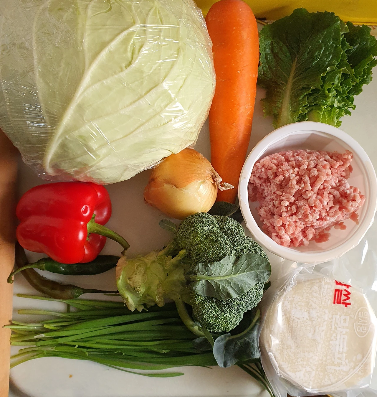 ■ 재료 : 간 돼지고기 ½컵. 대파 ⅓대. 파프리카 ⅓개. 양파 ¼개. 당근 ¼개. 양배추 ½컵. 부추 조금. 청양고추 2개. 만두피 15장. 브로콜리 ⅓송이. 상추 몇 장. 식용유