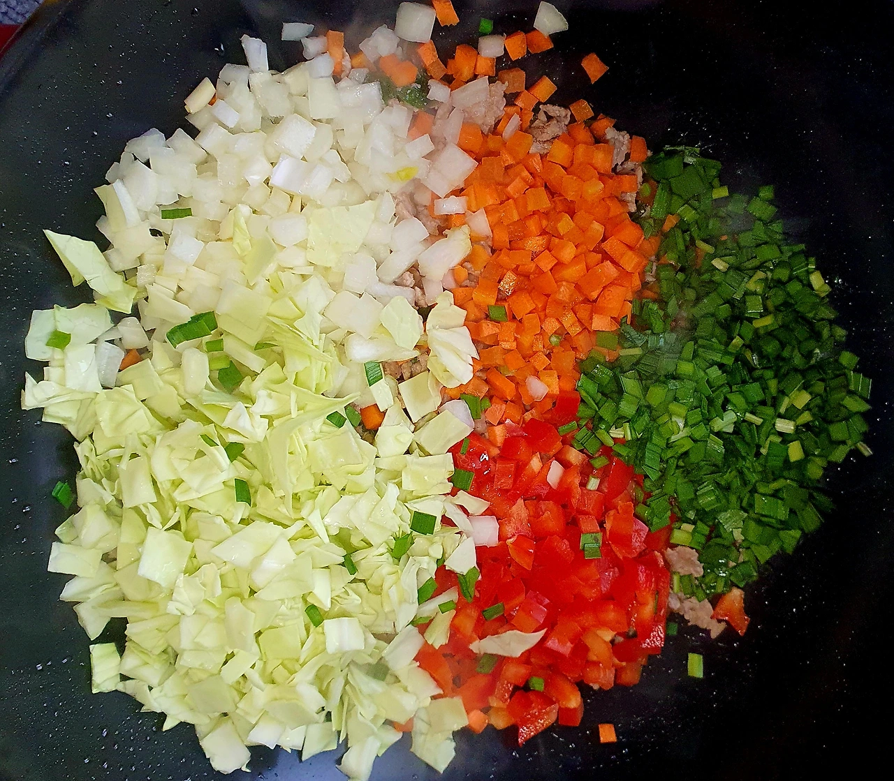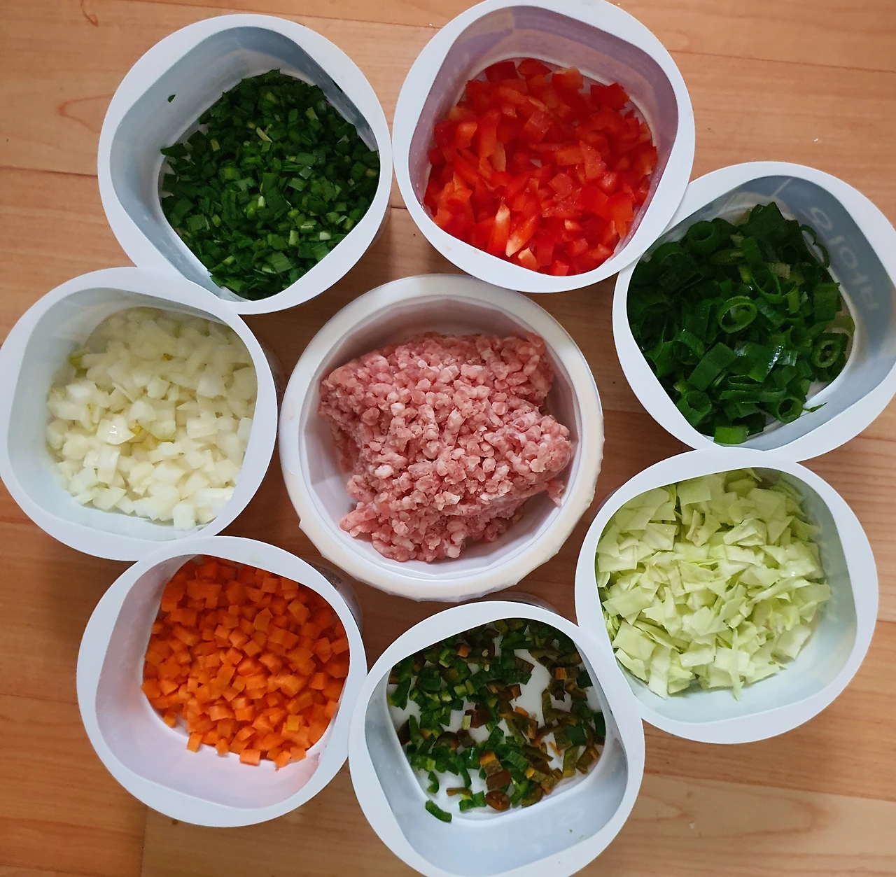 • 돼지고기는 간 것으로 구매해서 준비한다. 파프리카. 양파. 당근. 양배추. 부추. 청양고추도 잘게 다지듯 썰어서 준비한다.