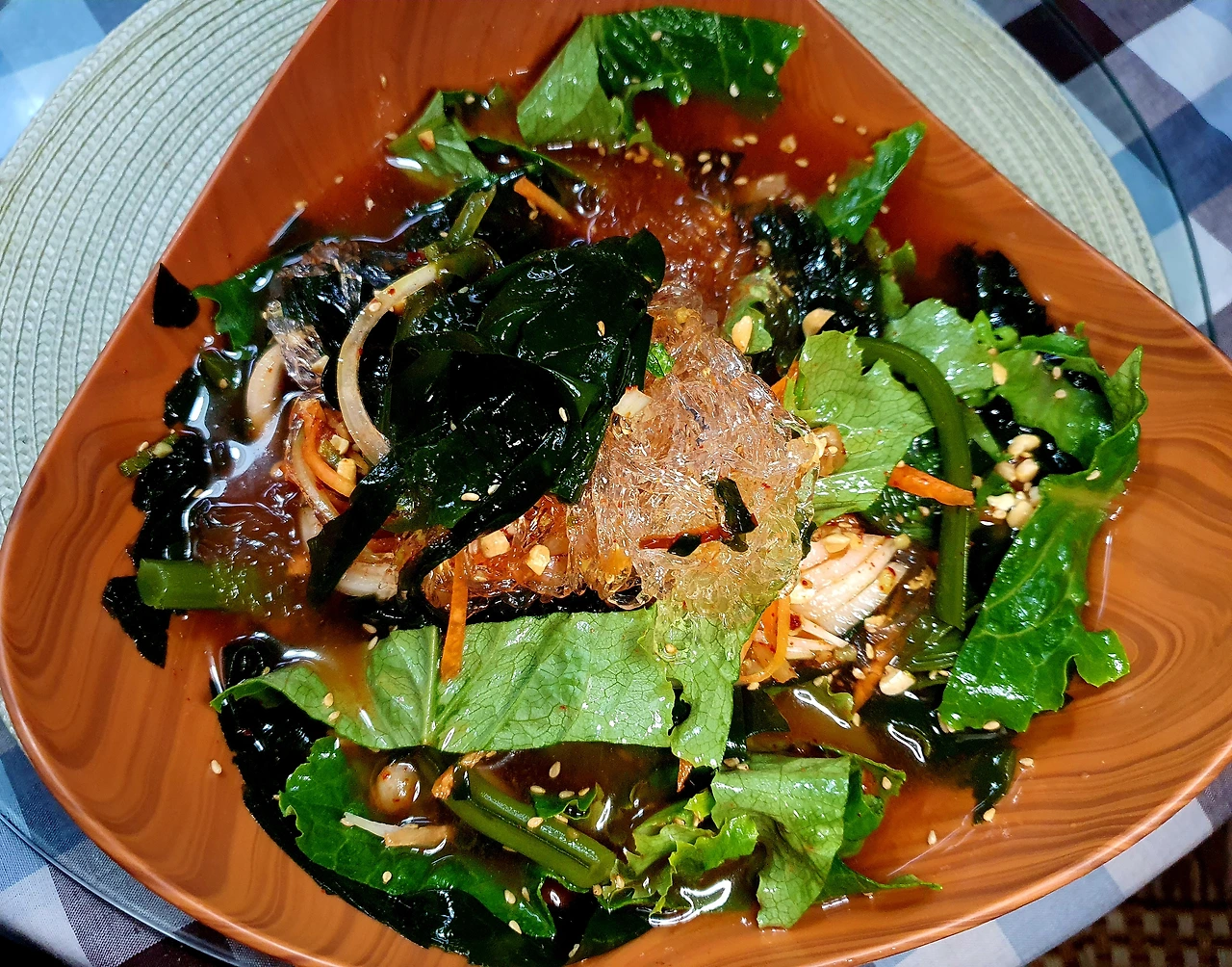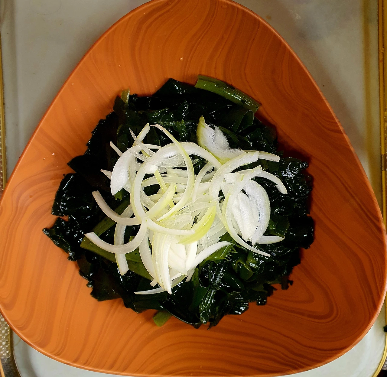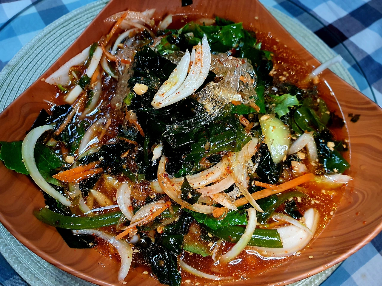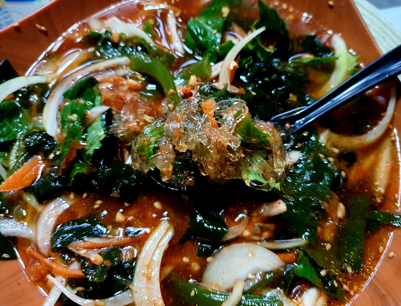 ■ 재료 : 물미역 2컵. 당면화 천사채 2컵. 냉면육수 1개. 양파 ¼개. 청양고추 1개. 당근 조금. 상추 2장. 물 300ml. 땅콩가루 조금. 참기름 1큰술