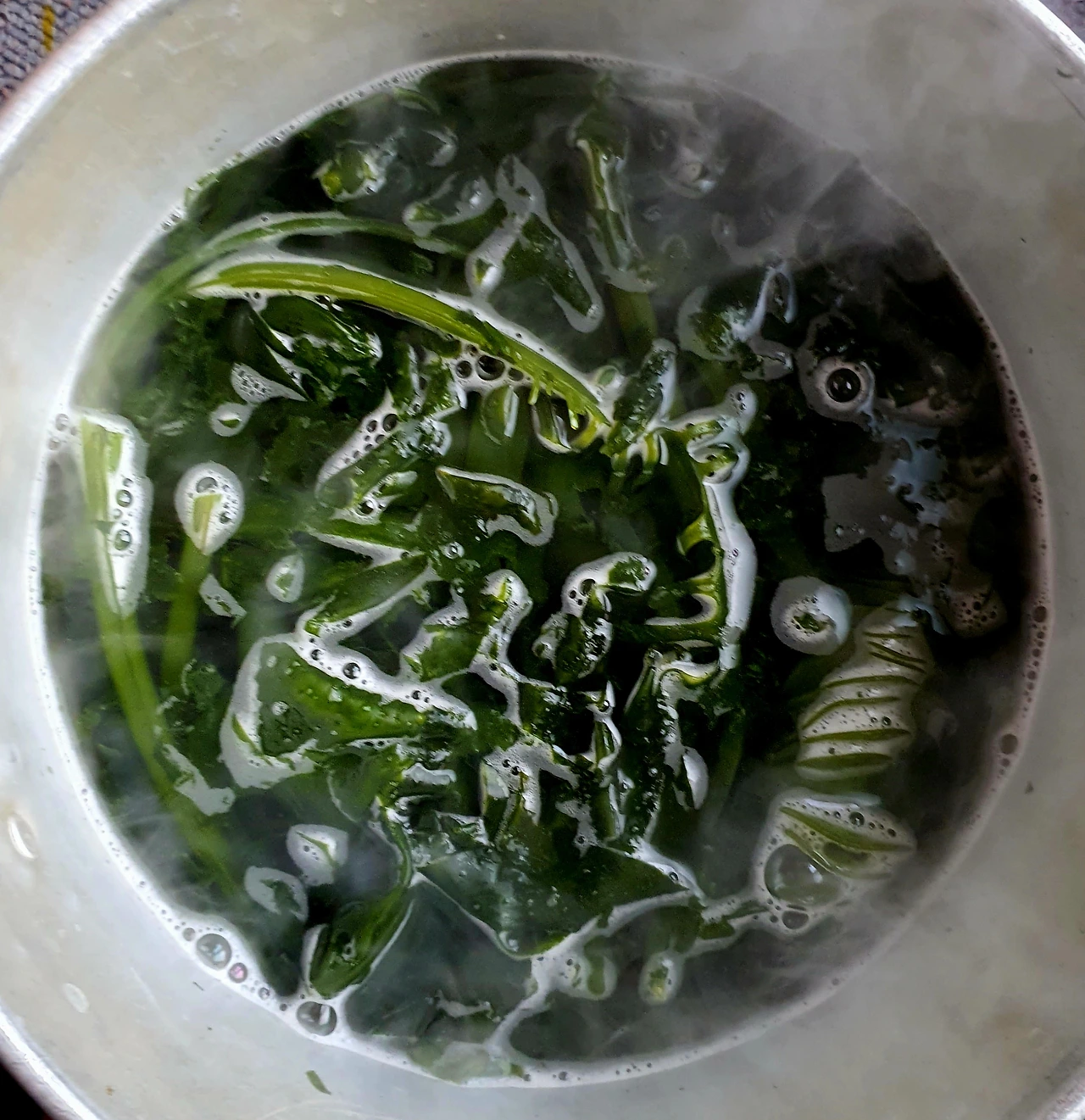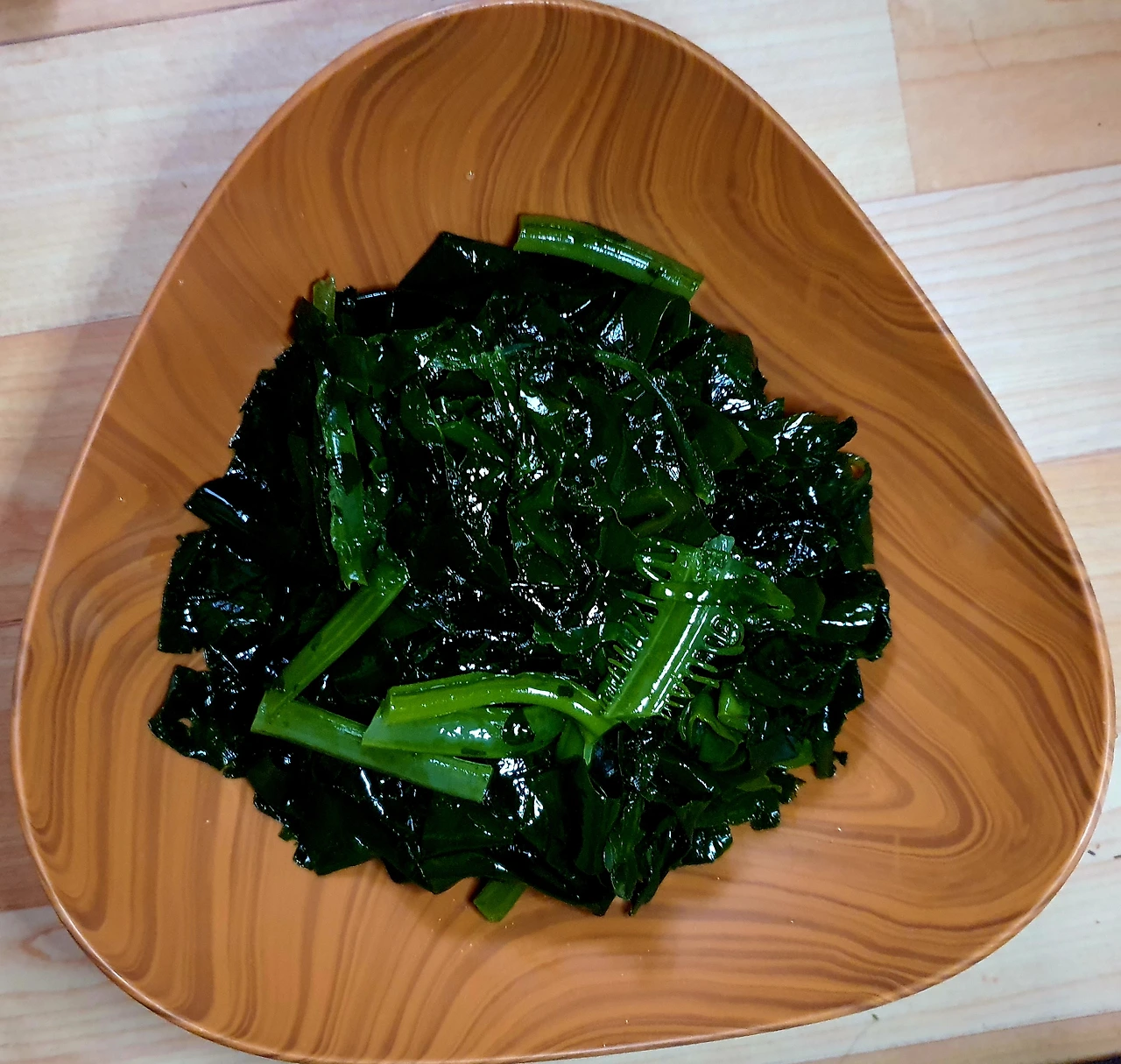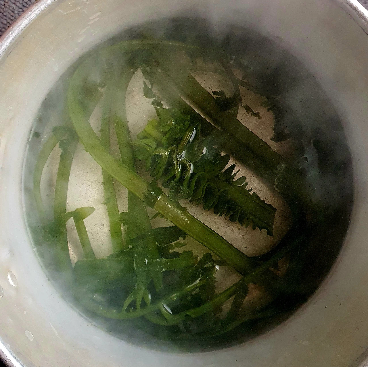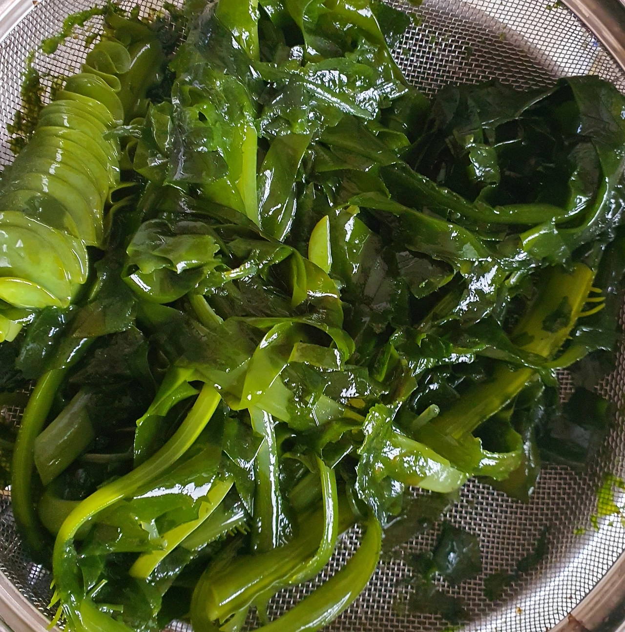 • 물기를 뺀 물미역은 끓는 물에 소금을 넣고 줄기부터 넣어 10 ~ 20초로 짧게 초록색으로 변하면 바로 건져 찬물에 헹군 뒤 물기를 꼭 짜서 먹기 좋게 썰어 채에 받쳐 둔다.