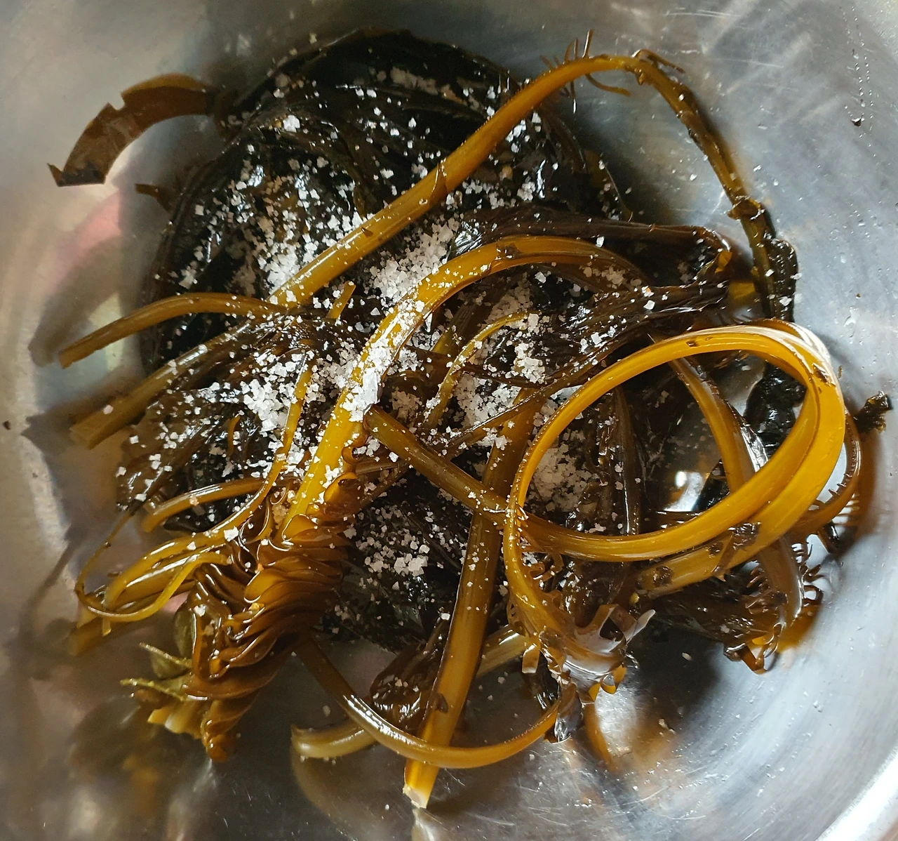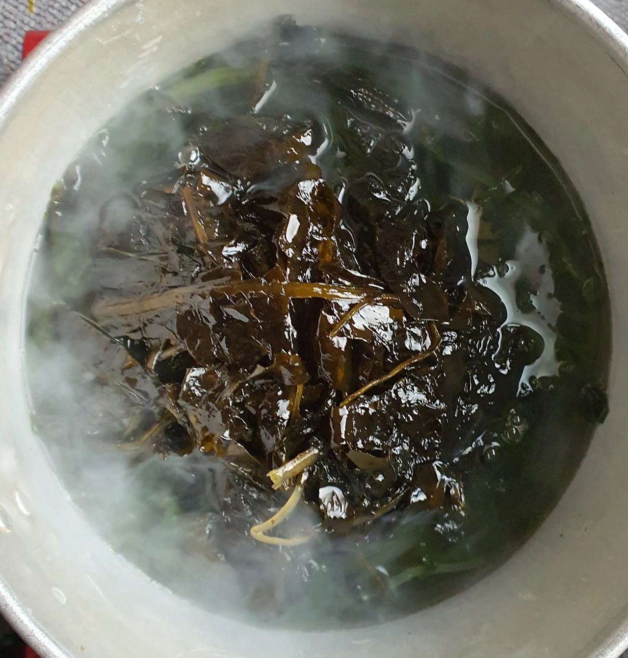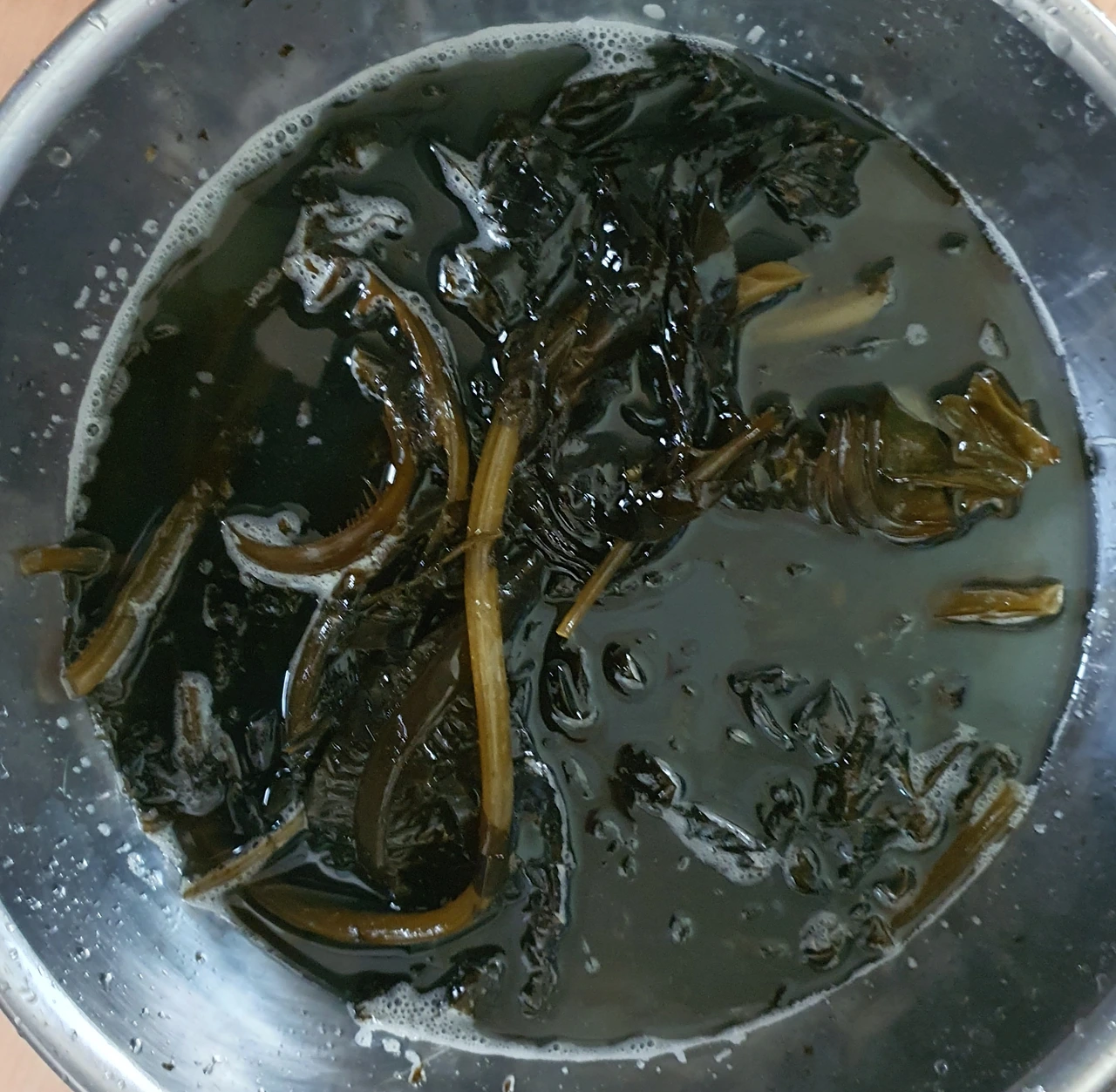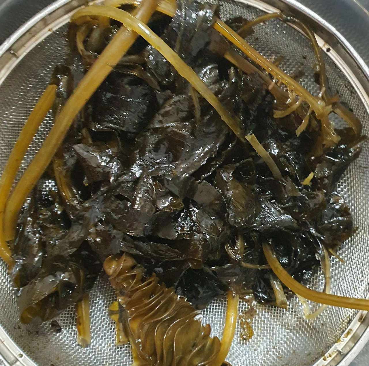 • 물미역은 굵은소금으로 바락바락 문질러 세척하고 맑은 물이 나올 때까지 헹군 뒤 물기를 빼준다.