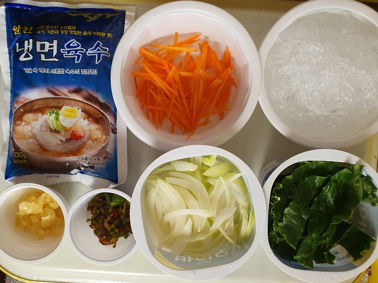 • 시판 냉면육수를 준비하고, 양파와 당근은 채를 썰어 준비하고, 청양고추는 다지듯 썰어 준비한다.
