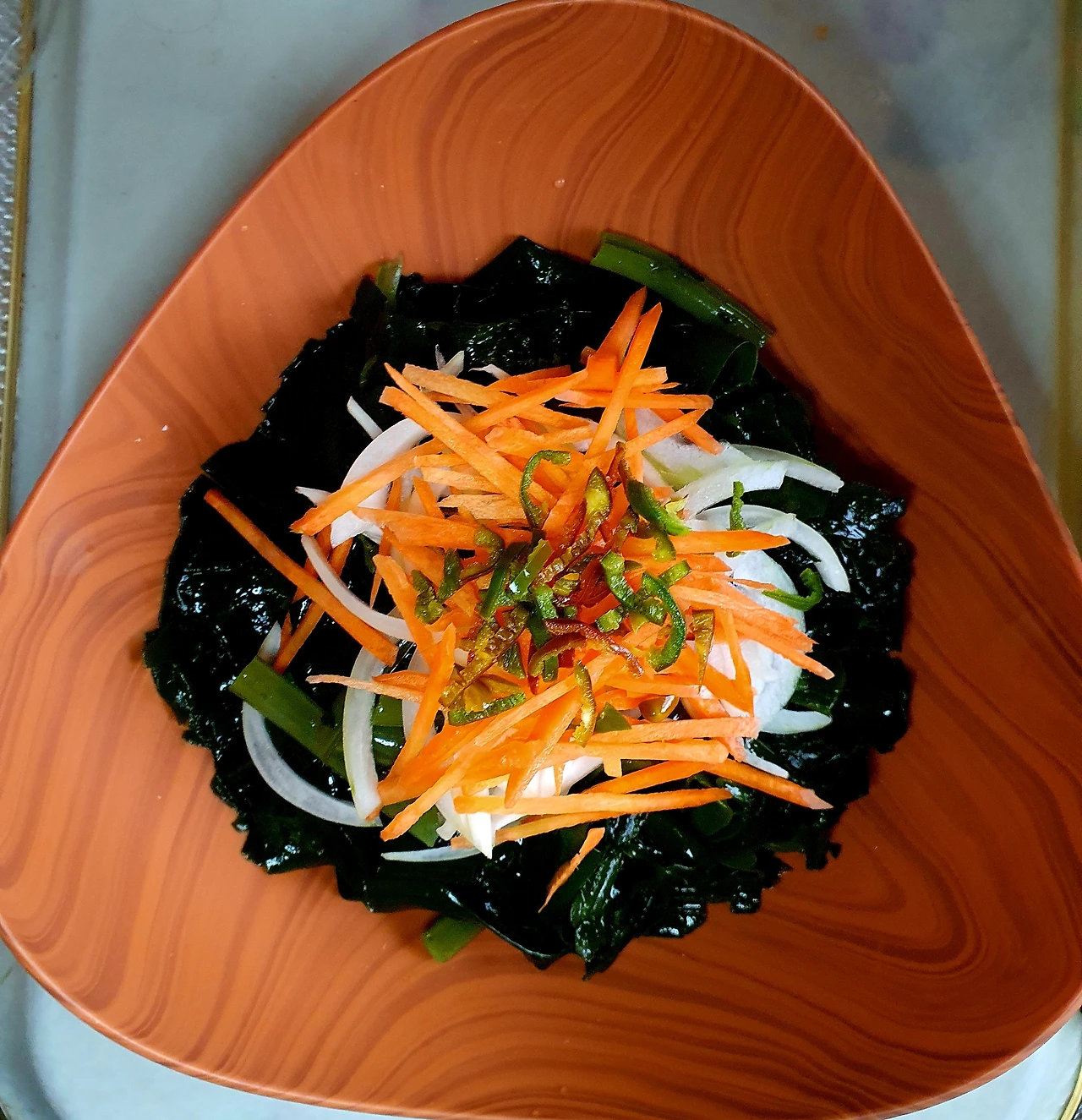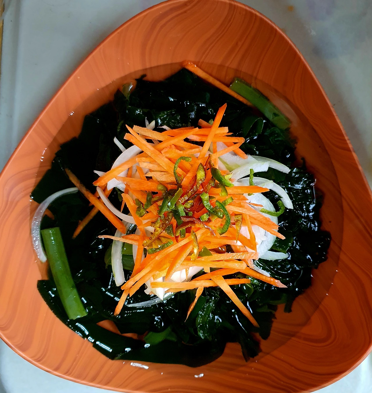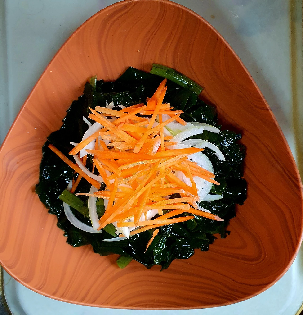 • 완성용기에 천사채와 물미역을 담고, 양파와 청양고추. 당근도 담아준다.