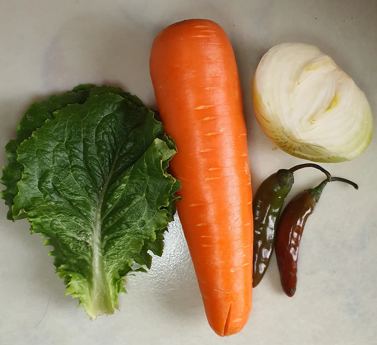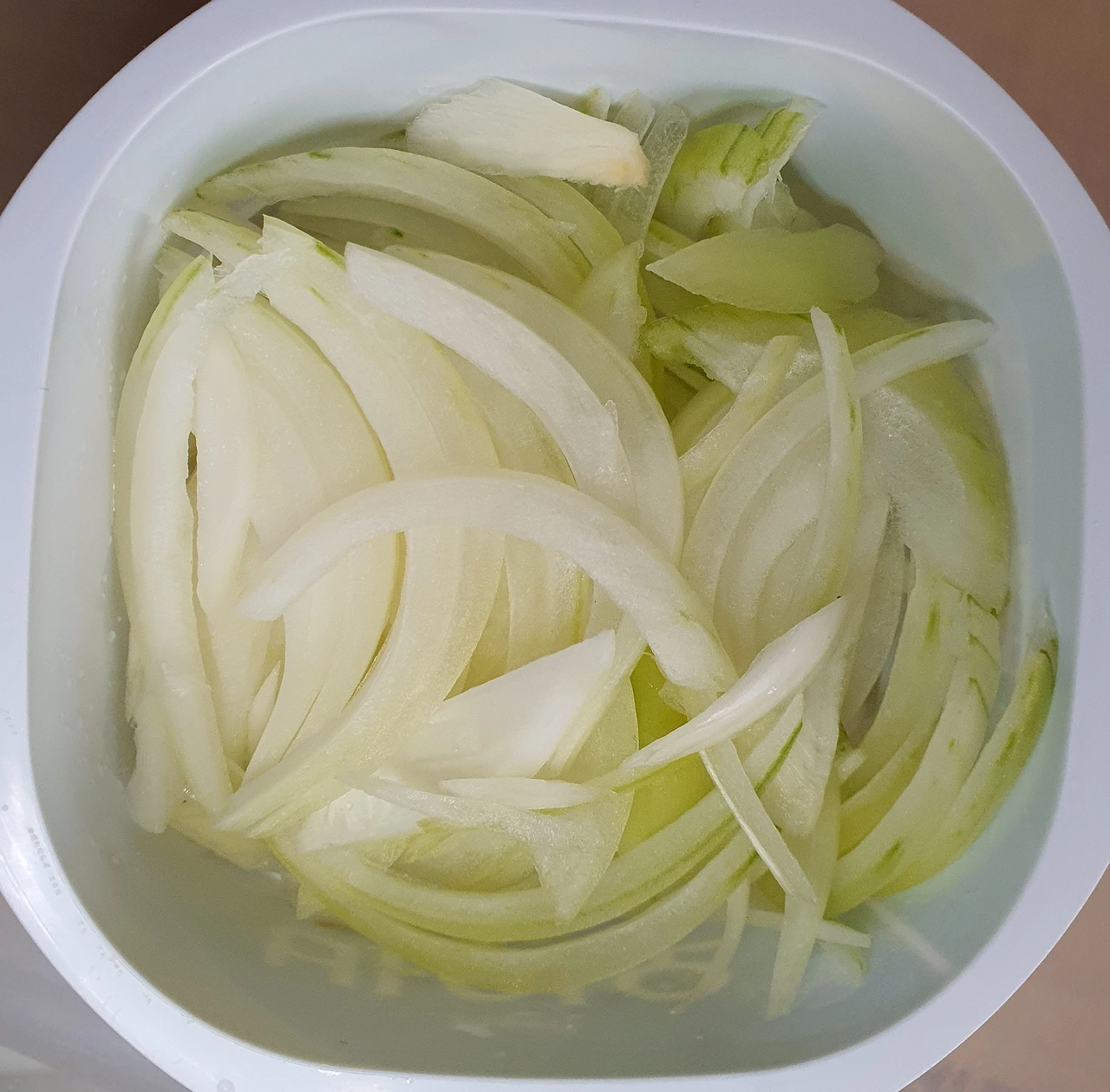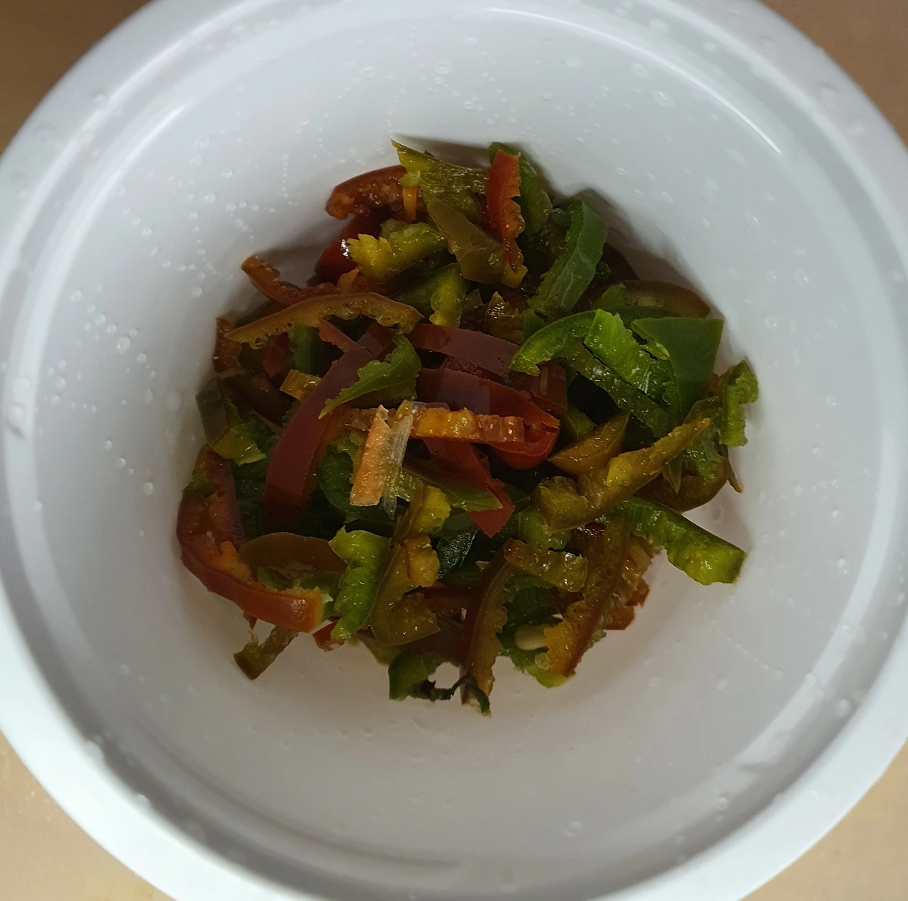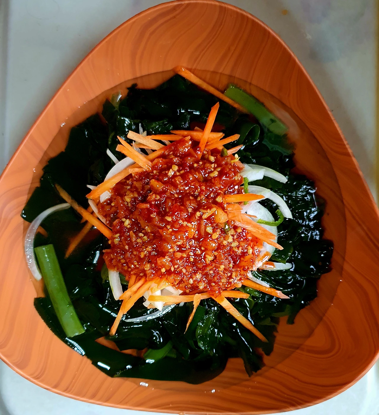 • 완성용기에 천사채와 물미역을 담고, 양파와 청양고추. 당근도 담아준다.