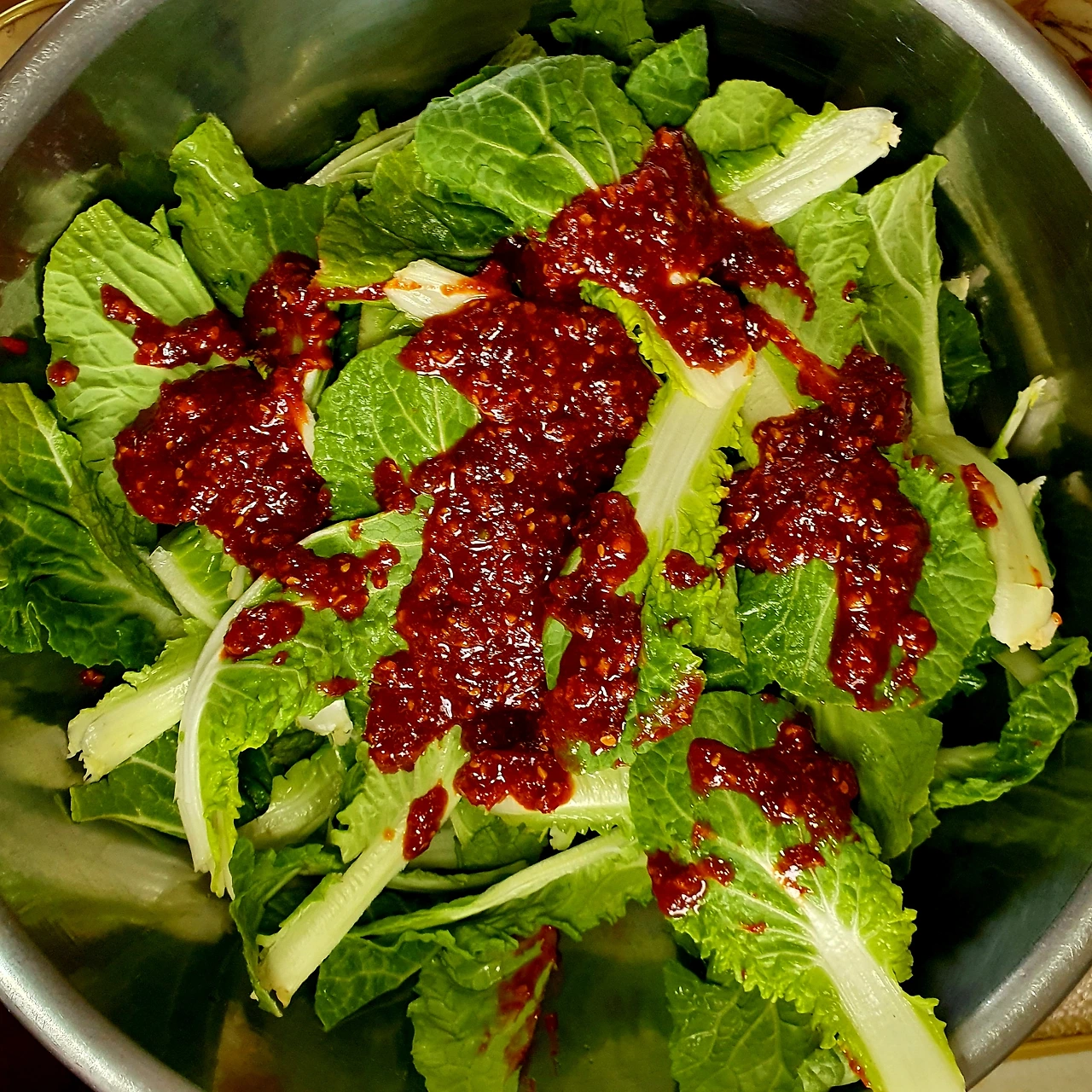 ■ 재료 : 봄동 400g, 청양고추 3개, 다진 마늘 2큰술, 고춧가루 4큰술, 참치액 5큰술, 까나리액젓 3큰술. 맛술 2큰술, 매실청 2큰술, 원당 1큰술, 감식초 2큰술, 참기름 2큰술, 통깨 1큰술. 옥돌콘 1큰술
