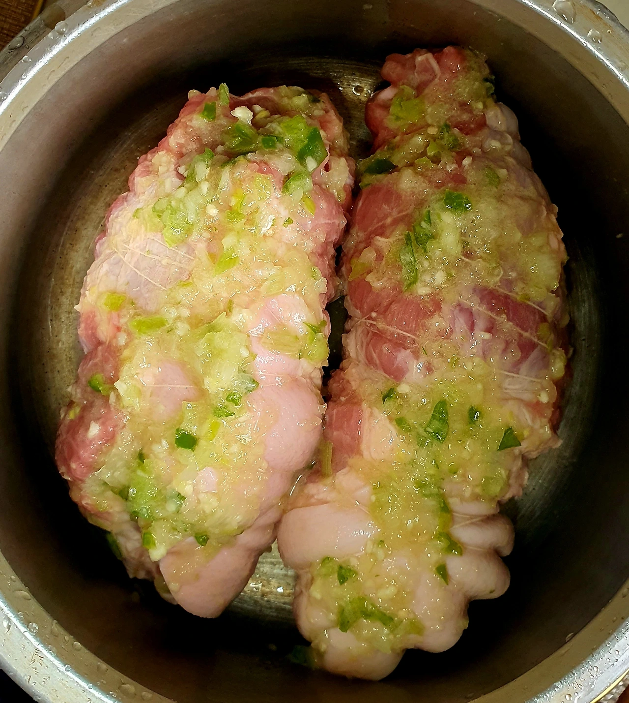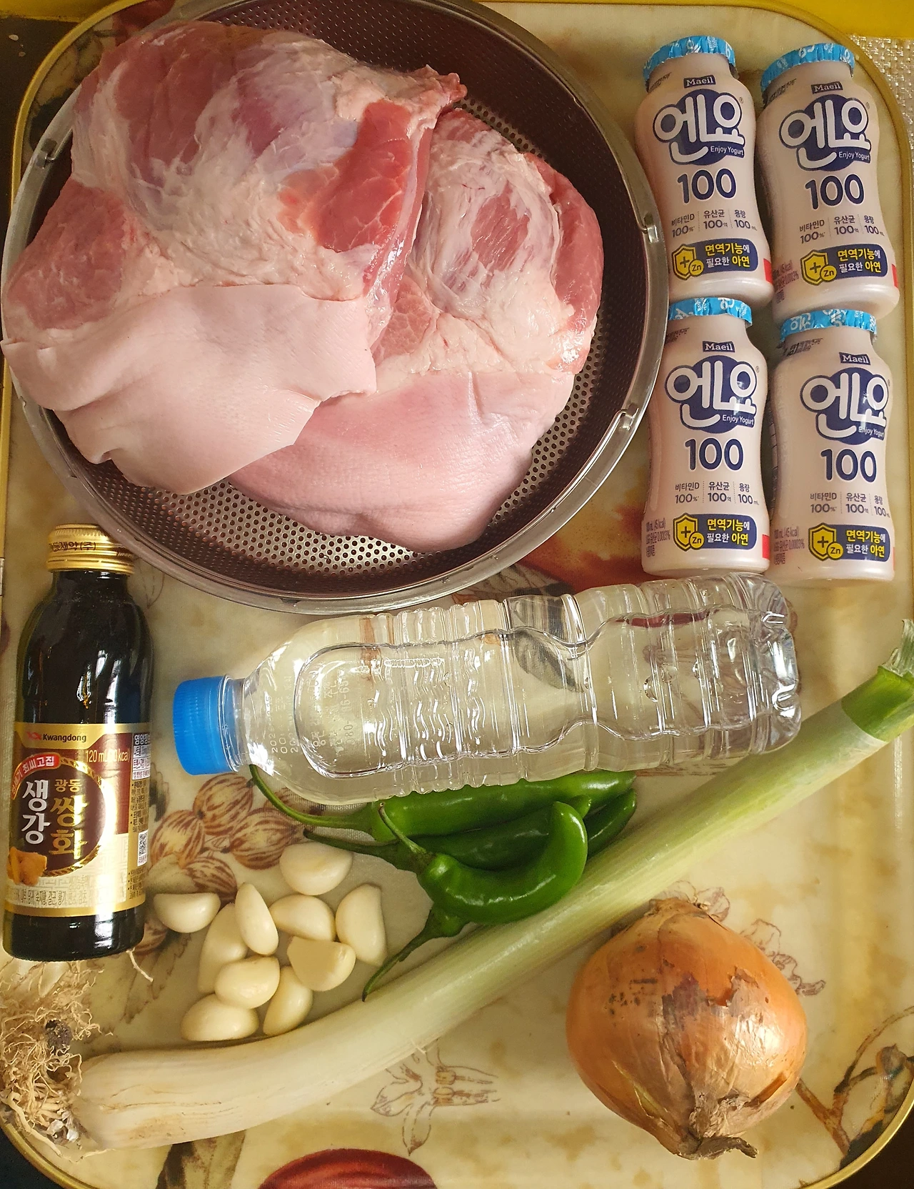 ■ 재료 : 앞다리살 1kg. 요구르트 100ml 4병. 물 200ml. 쌍화탕 1병. 참치액 5큰술. 대파 1대. 양파 1개. 마늘 10톨