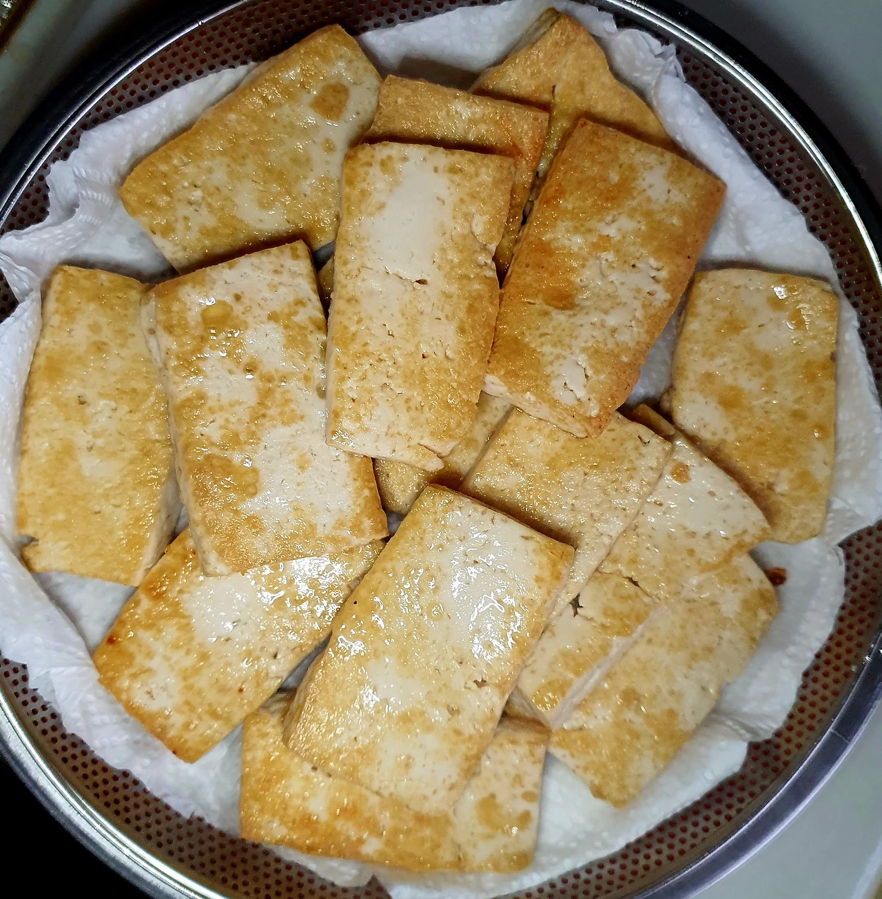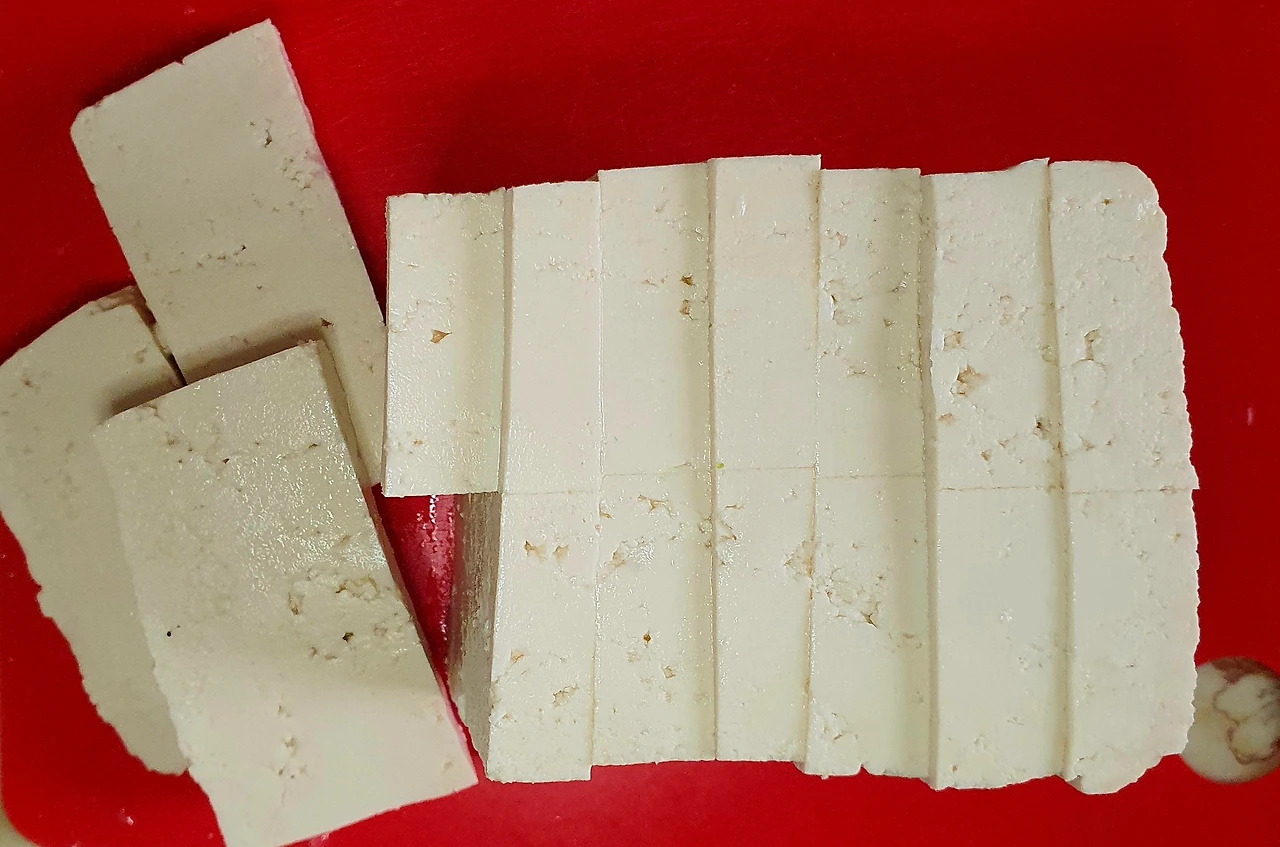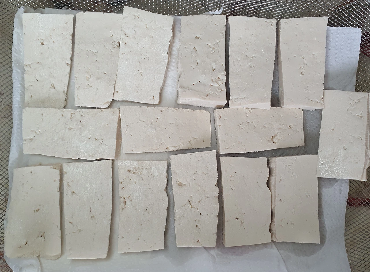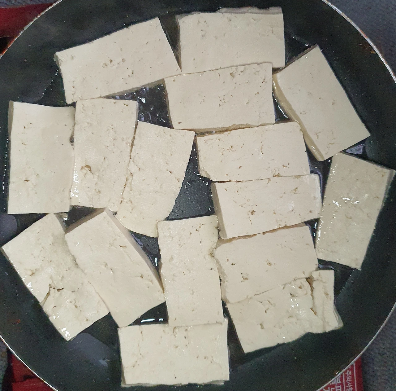 • 두부를 먹기 좋게 썰어 소금을 뿌려 간을 하며 키친타월에 올려 수분을 빼준다.