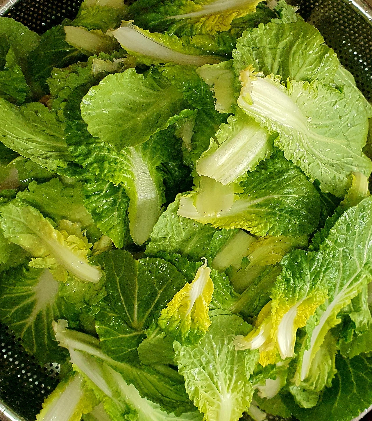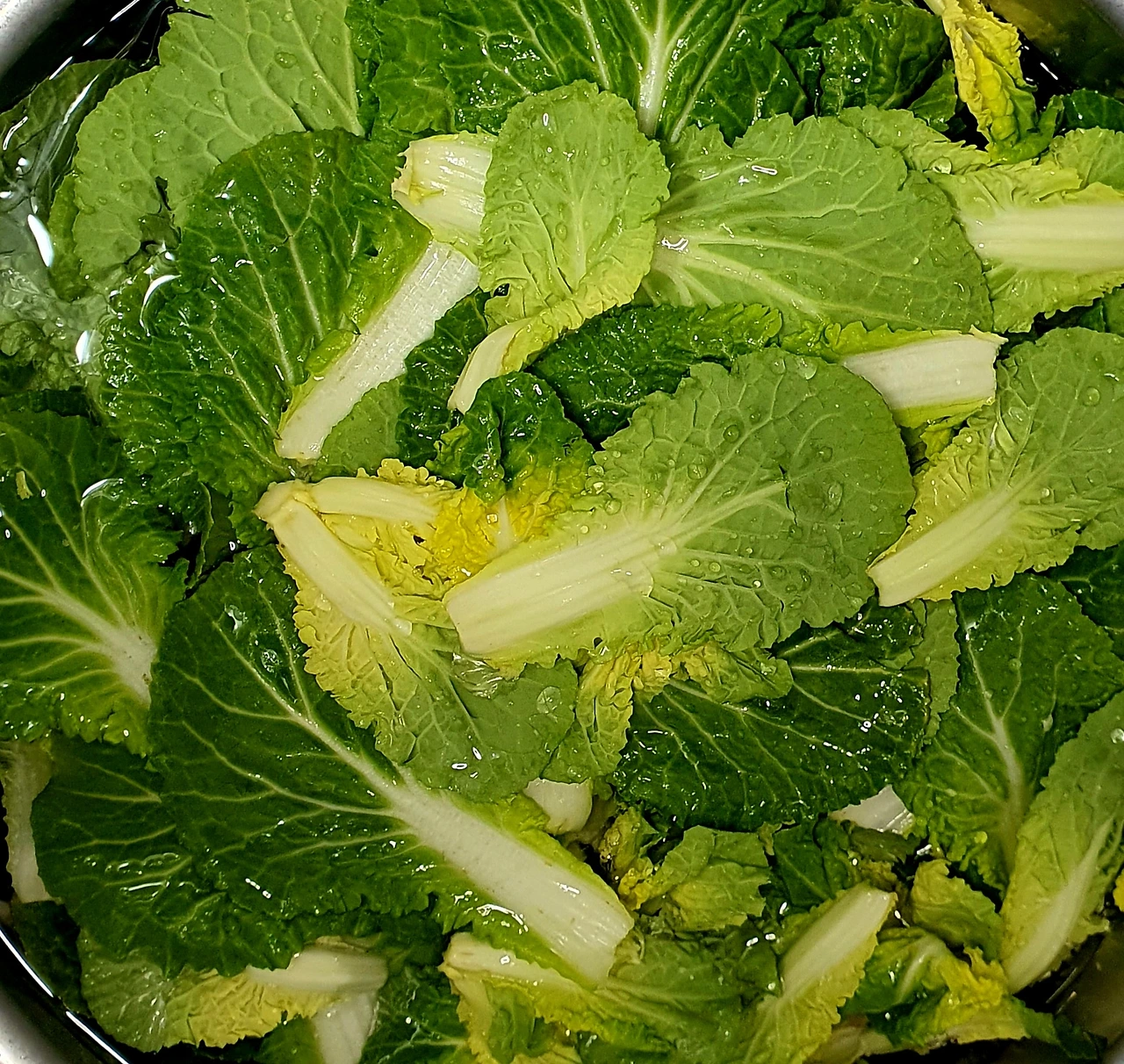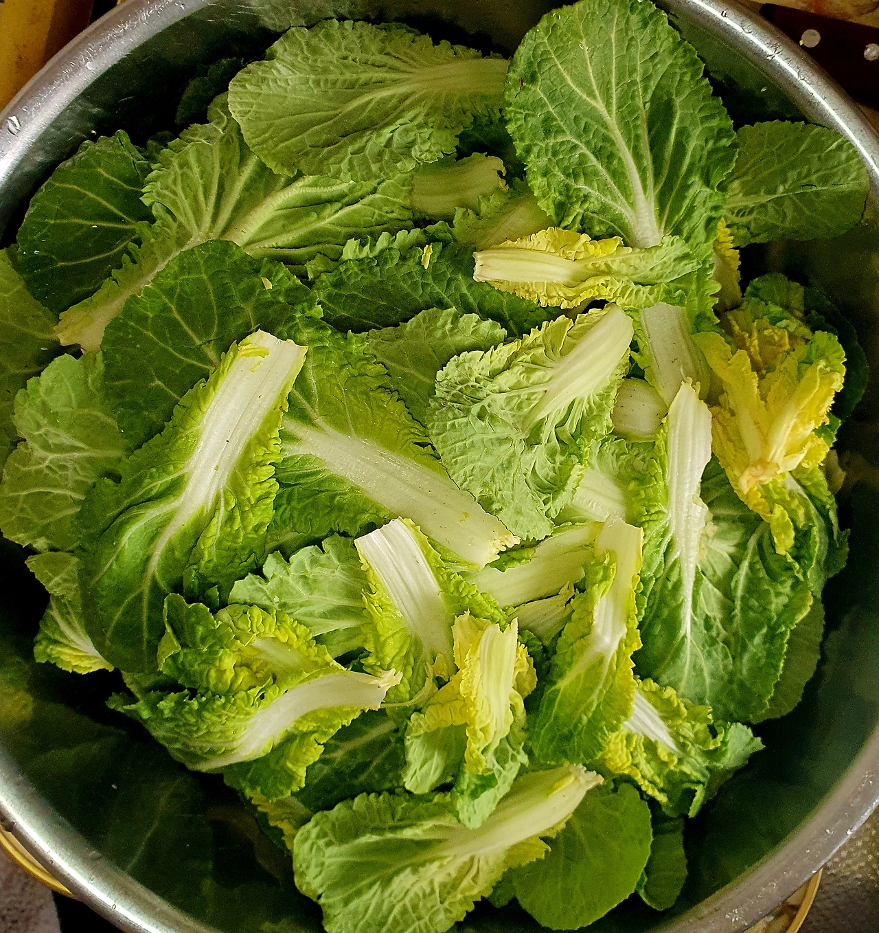 • 물기를 제거한 봄동은 작은 잎은 그대로 두고 큰 잎은 먹기 좋은 크기로 잘라준다. 어린 부분은 별도로 두었다가 샐러드를 만들어 먹을 거임.