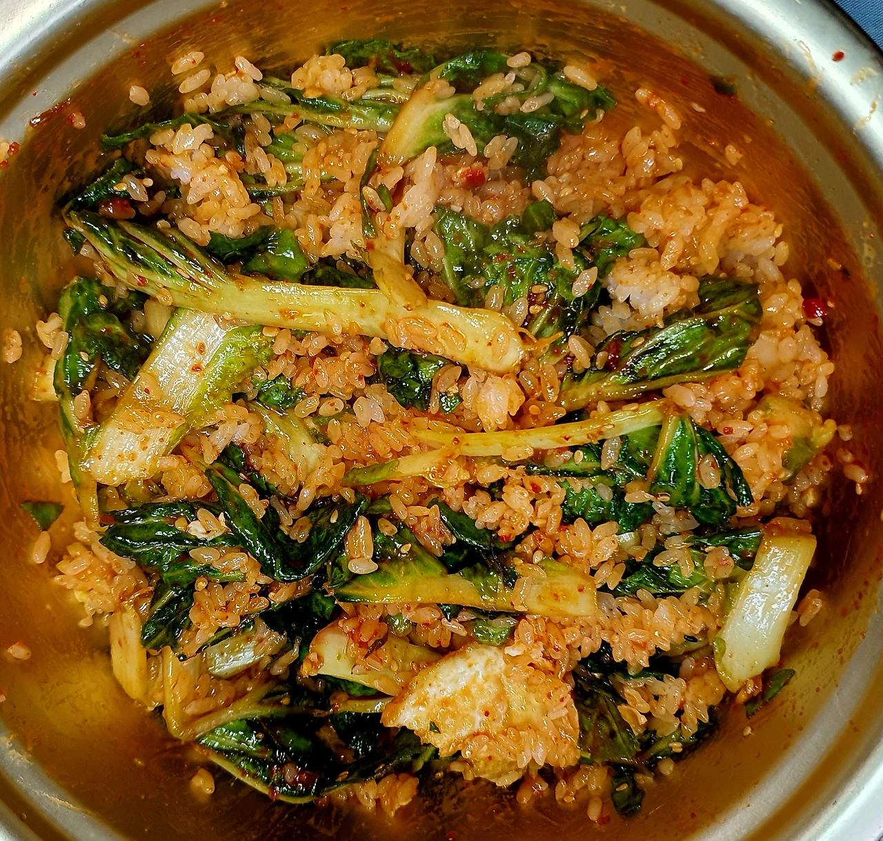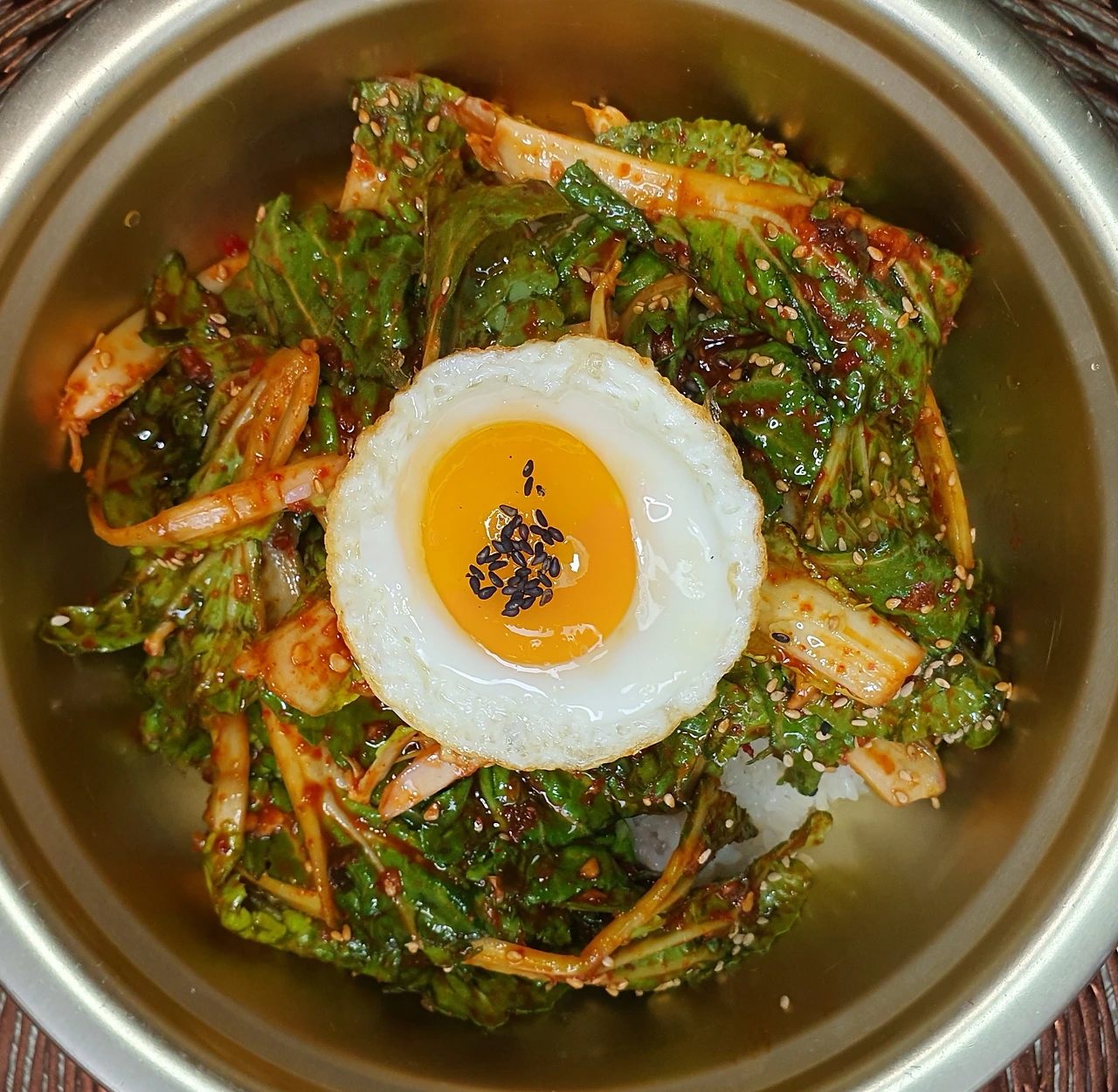 • 땀이 들어 완성된 밥을 양푼에 담고 위에 겉절이를 올려주고, 달걀부침을 올리면 완성