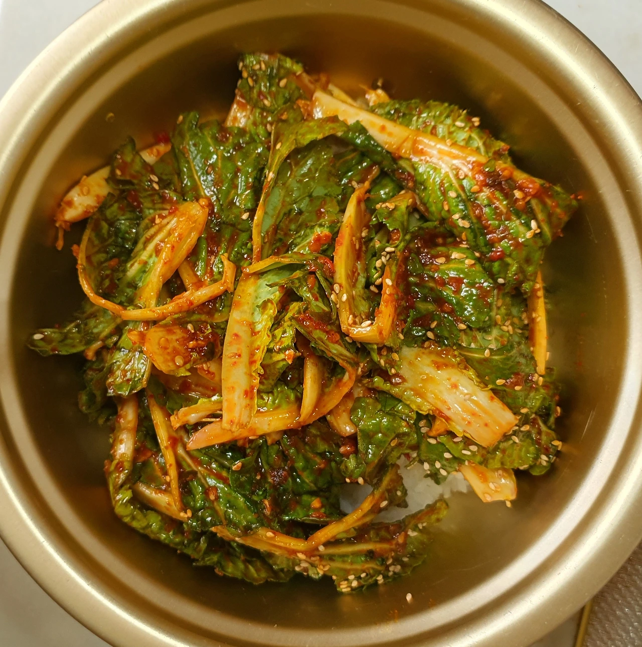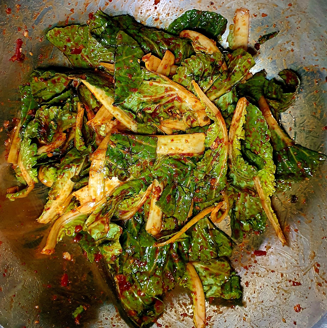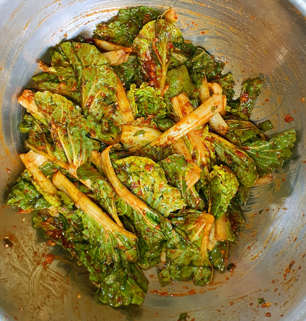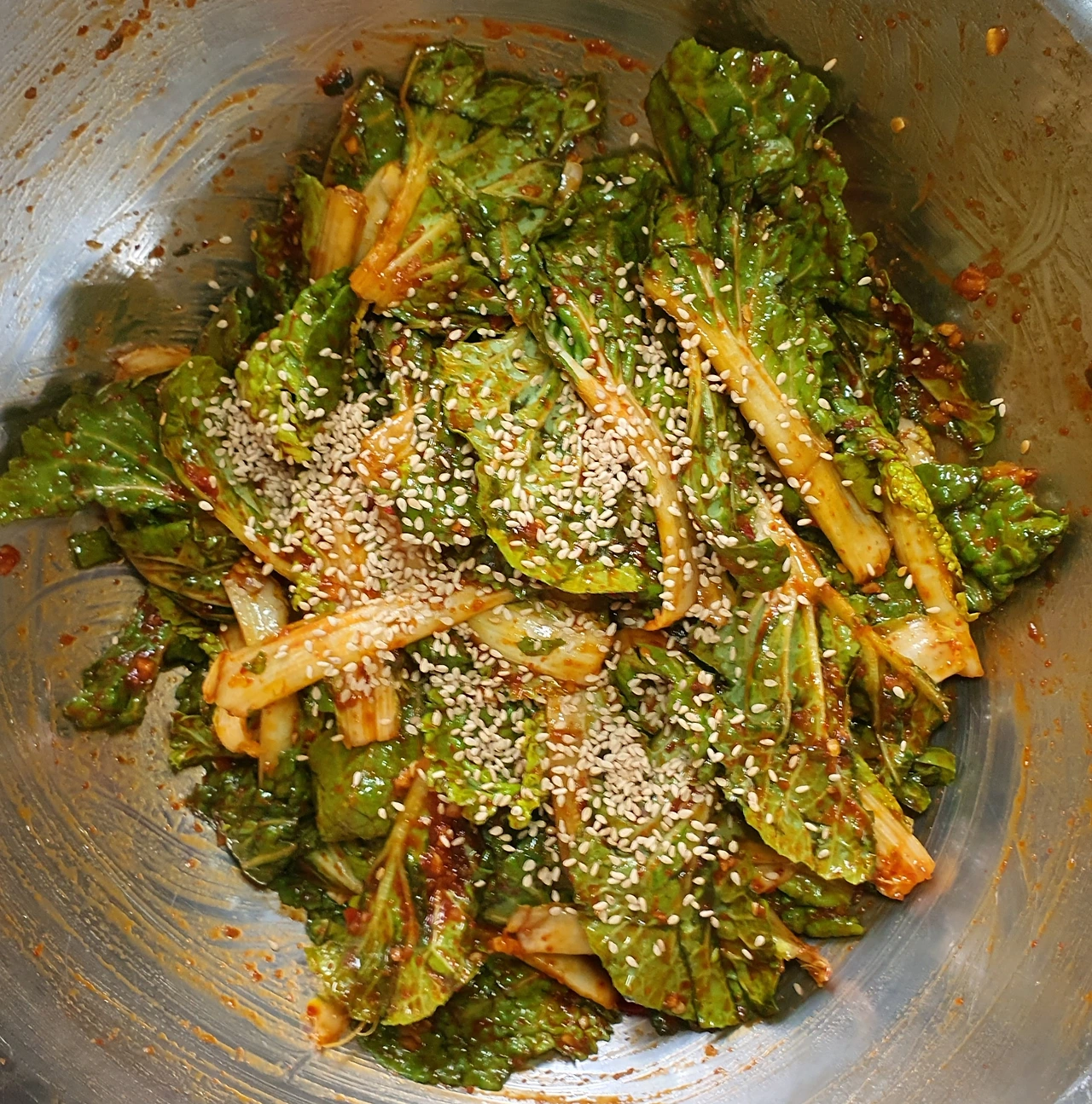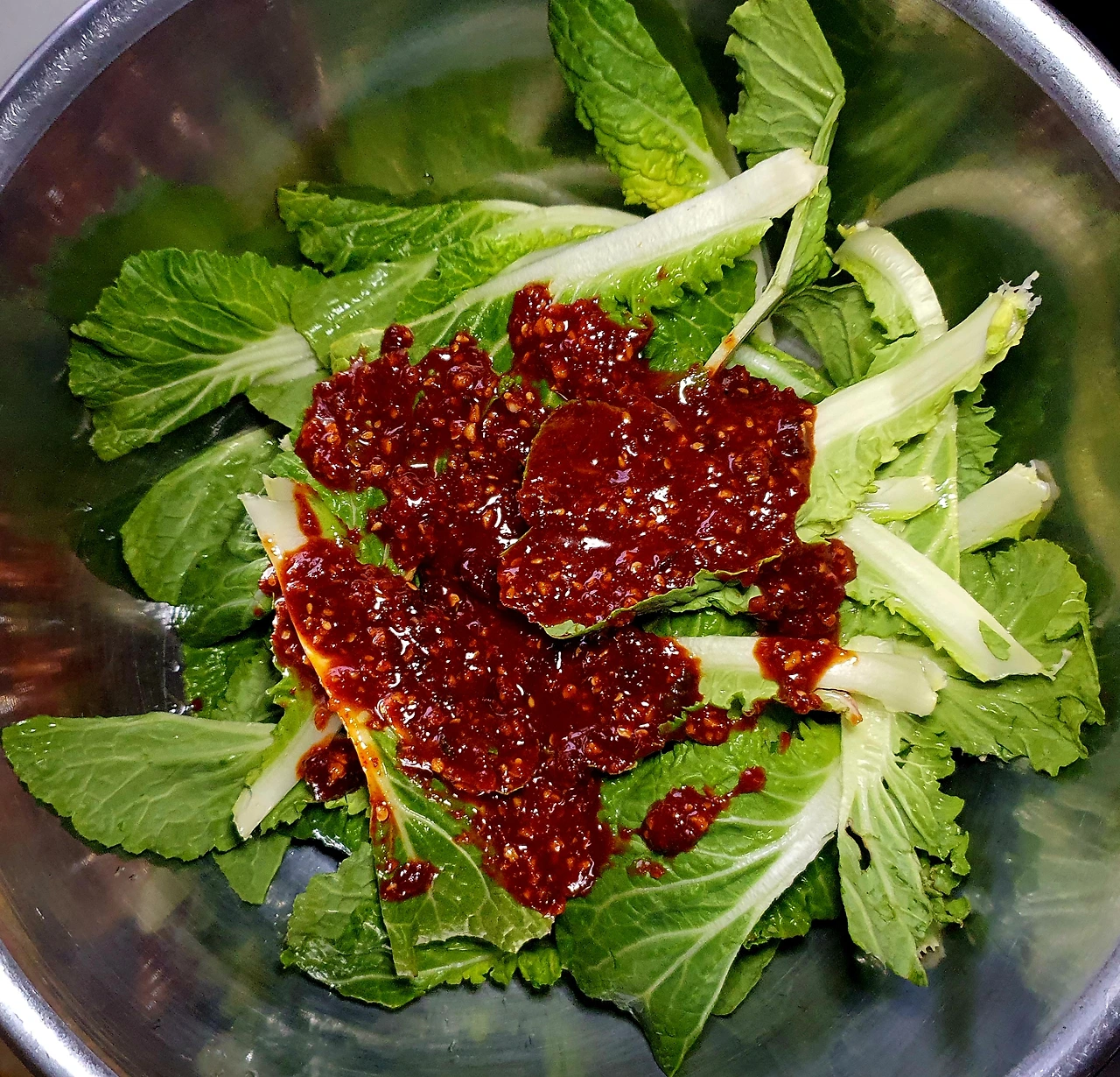 • 볼에 완전 물기를 뺀 봄동을 넣고 양념은 한꺼번에 많이 넣지 말고 조금씩 추가해 살살 버무려 준다.