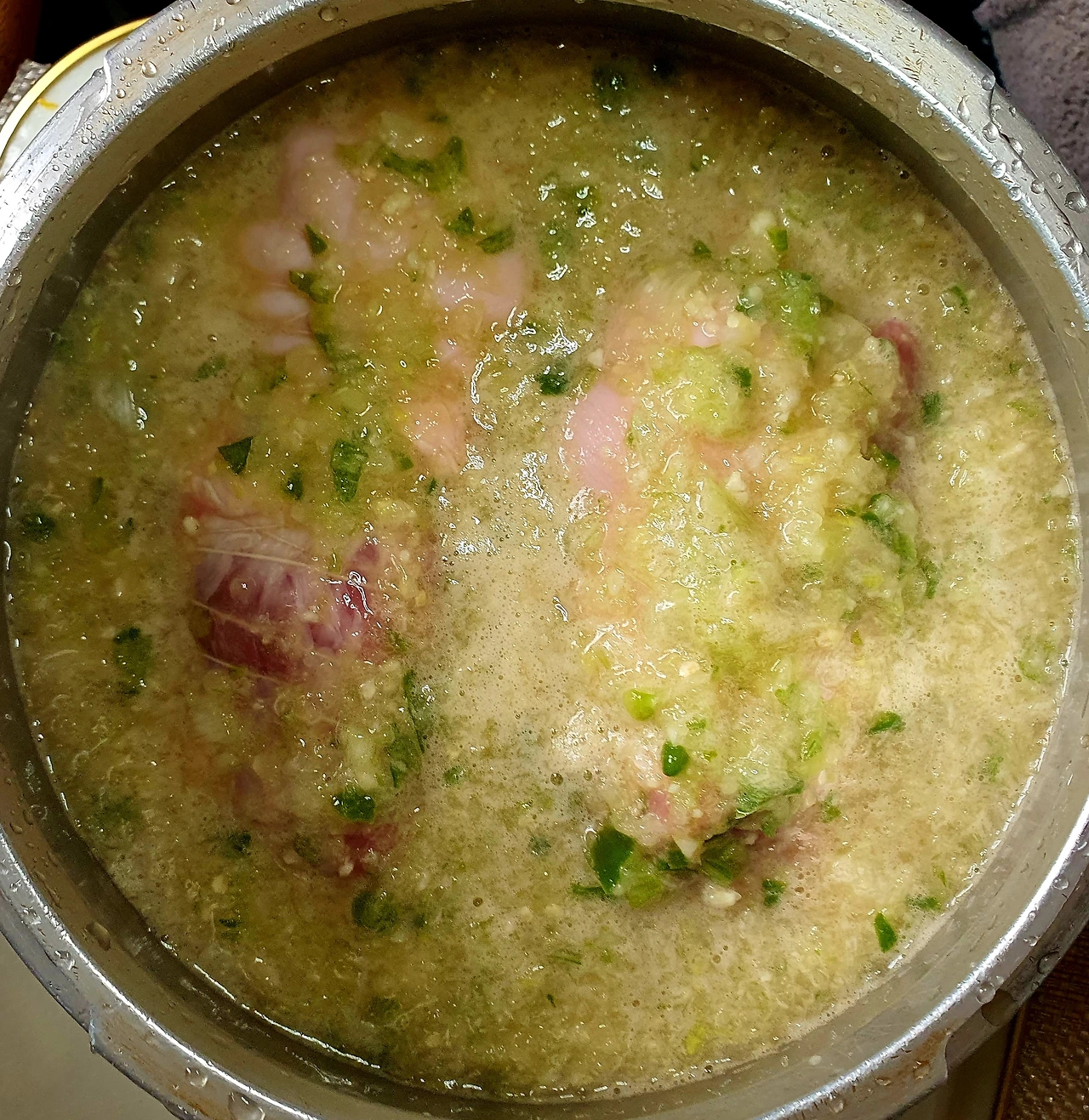 • 압력솥에 고기와 양념재료를 넣고 센 불에서 압력솥에서 김 빠지는 소리가 나고 10분 후에 불을 끄고 자연적으로 김이 빠질 때까지 기다려준다.