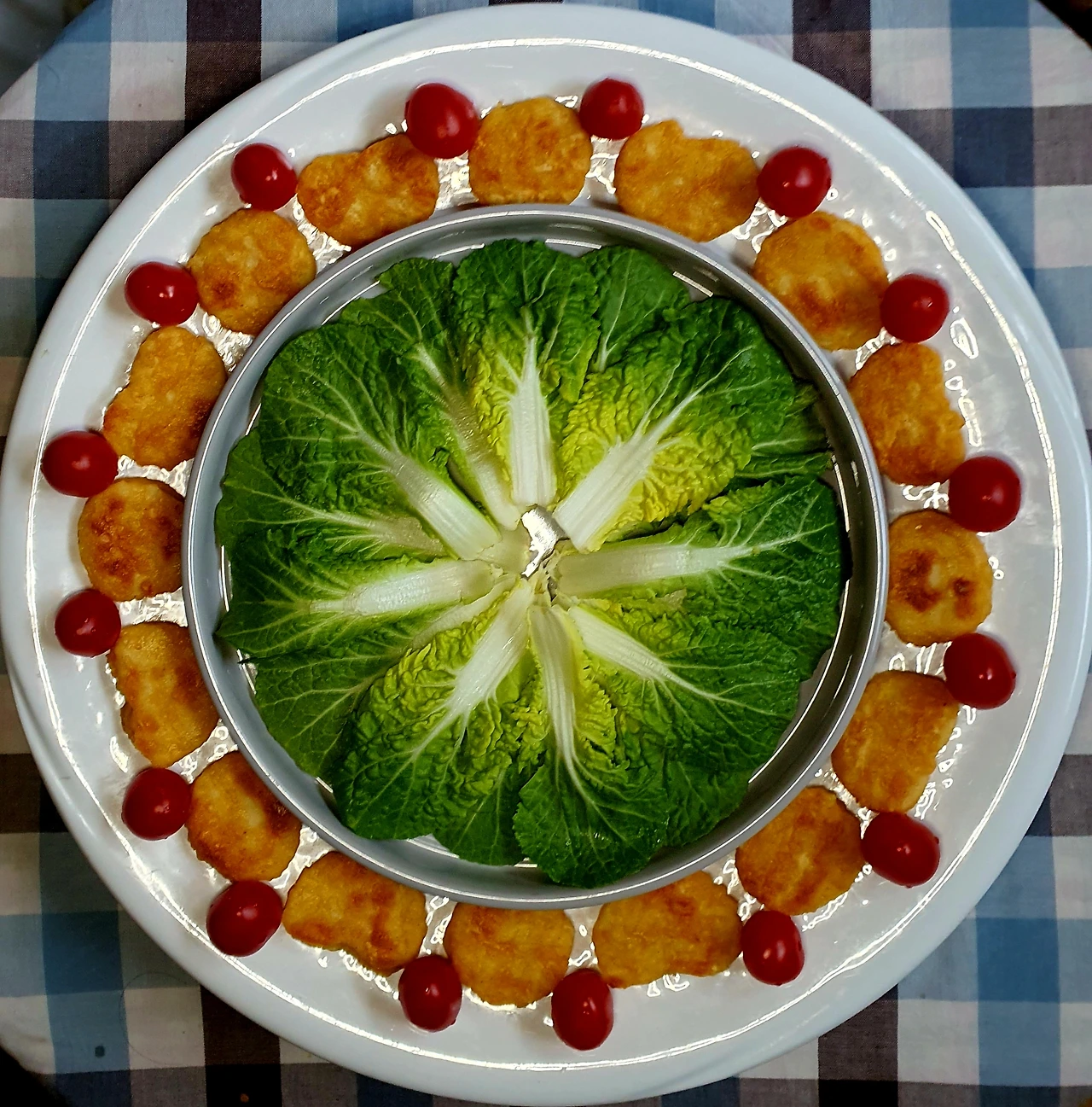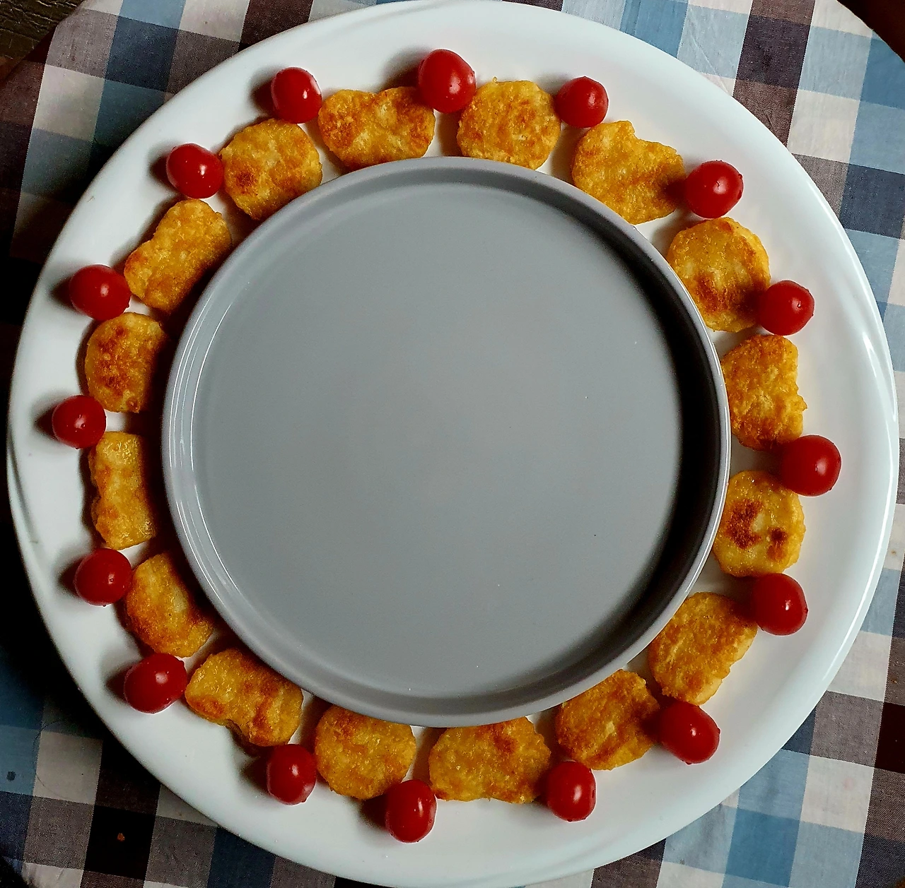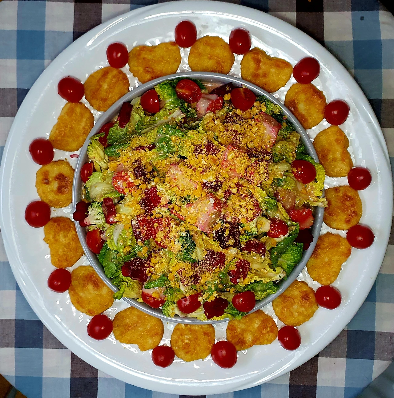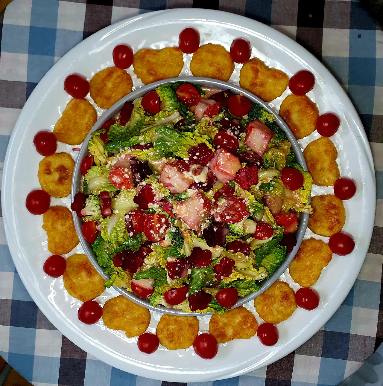 • 완성용기에 샐러드재료를 담고 주위에 치킨너겟과 방울토마토를 둘러 담는다.