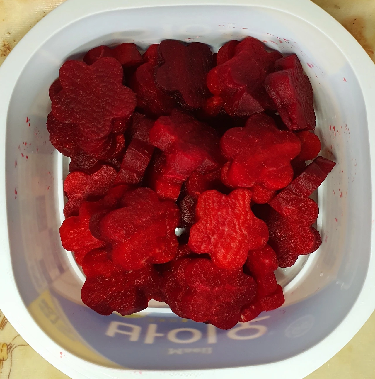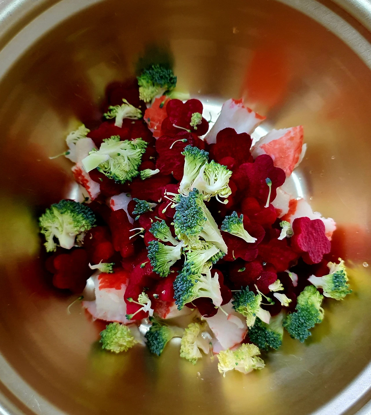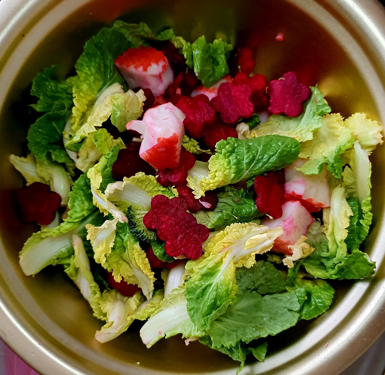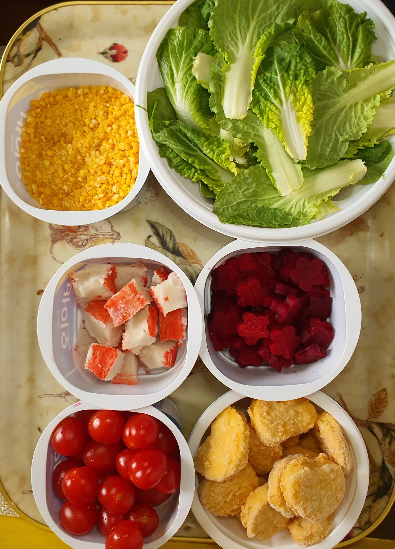 ■ 재료 : 봄동 2컵. 꽃맛살 ⅔컵. 비트 ½컵. 방울토마토 1컵. 치킨너겟 15개. 옥돌콘 2큰술