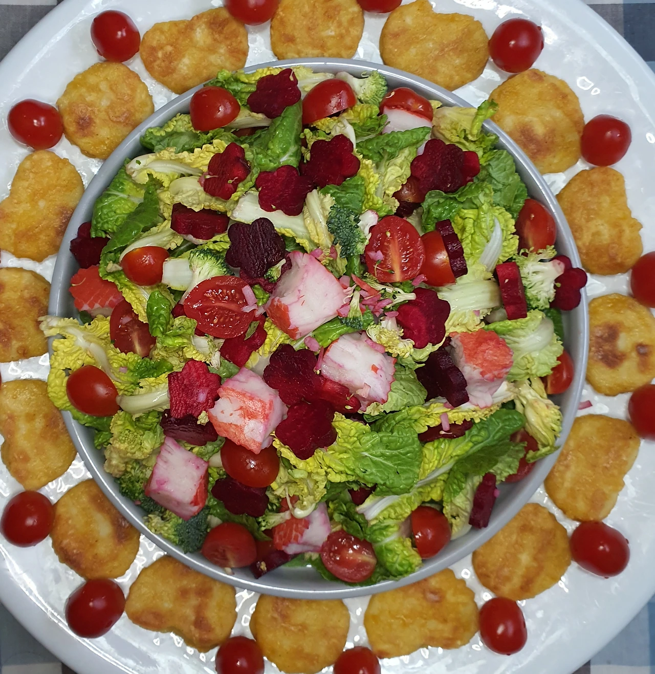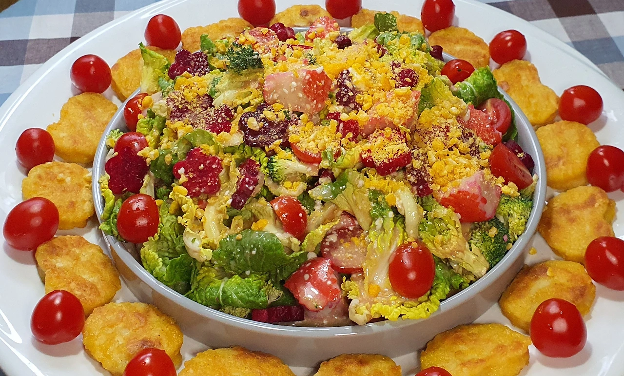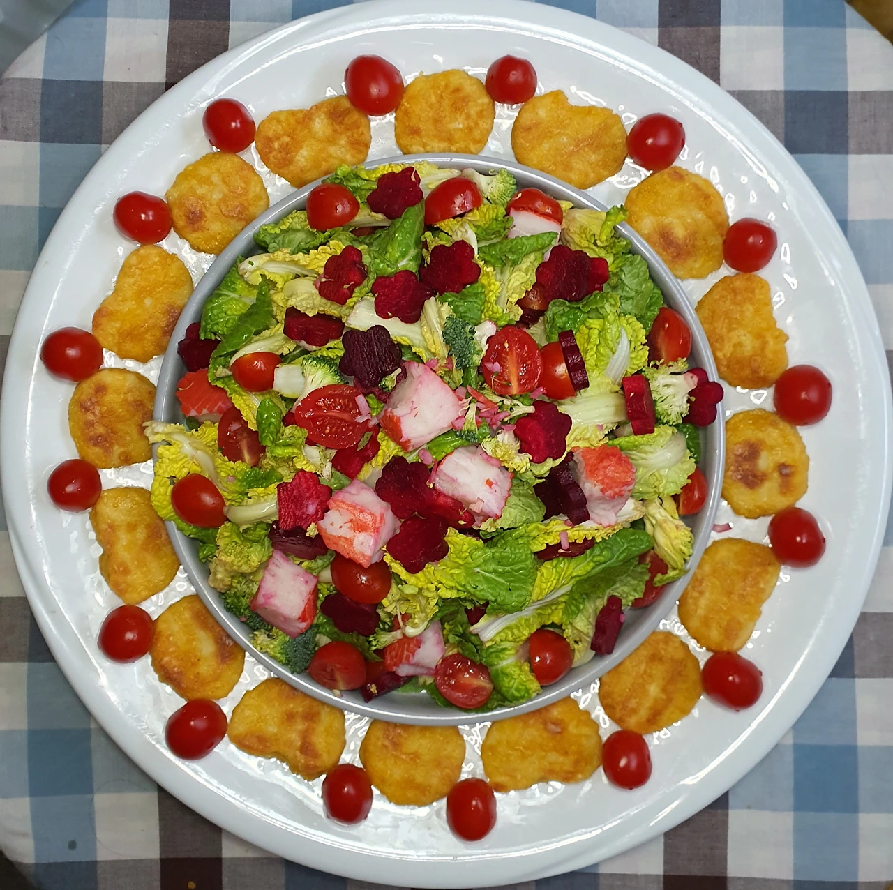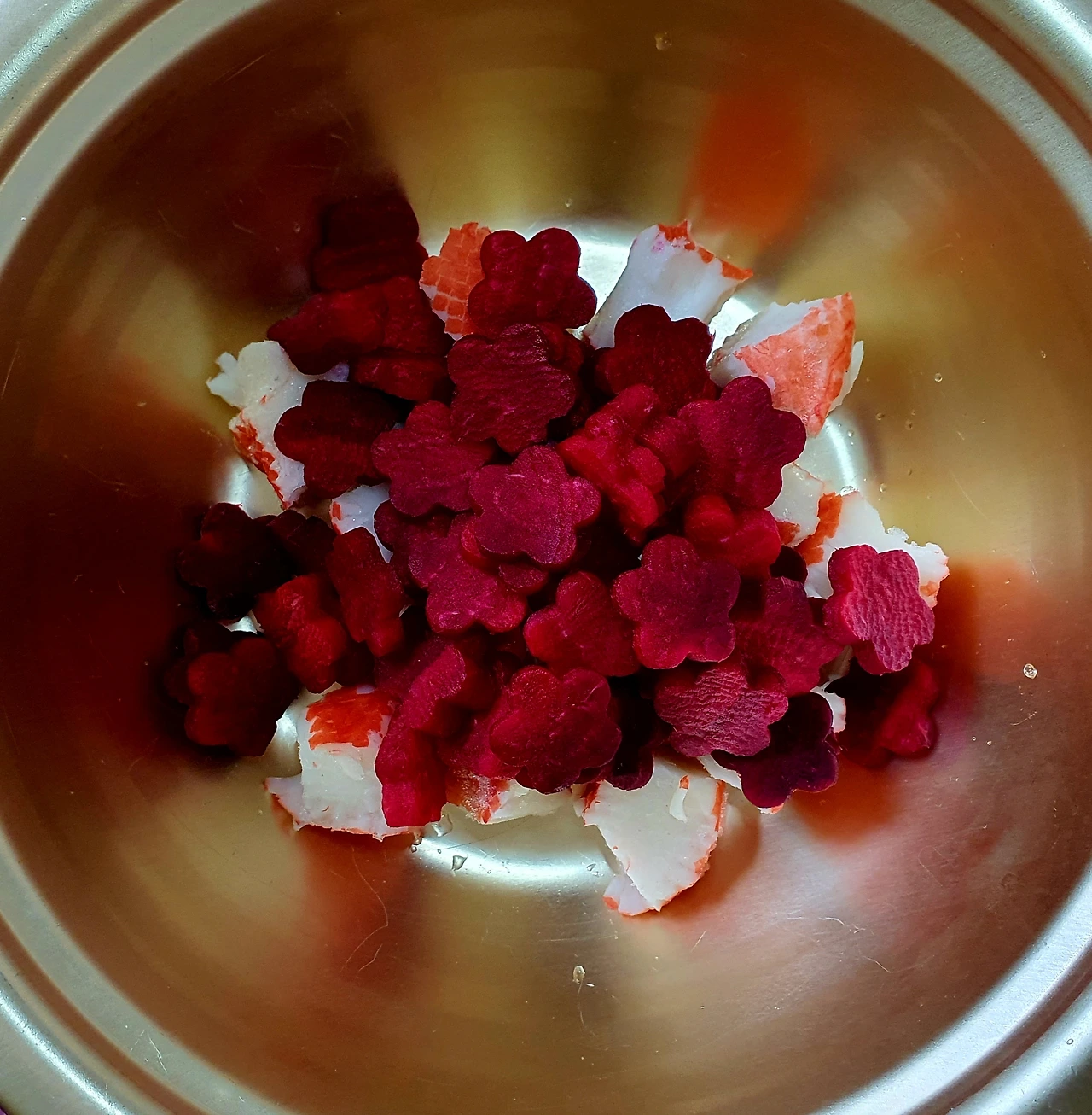■ 재료 : 봄동 2컵. 꽃맛살 ⅔컵. 비트 ½컵. 방울토마토 1컵. 치킨너겟 15개. 옥돌콘 2큰술