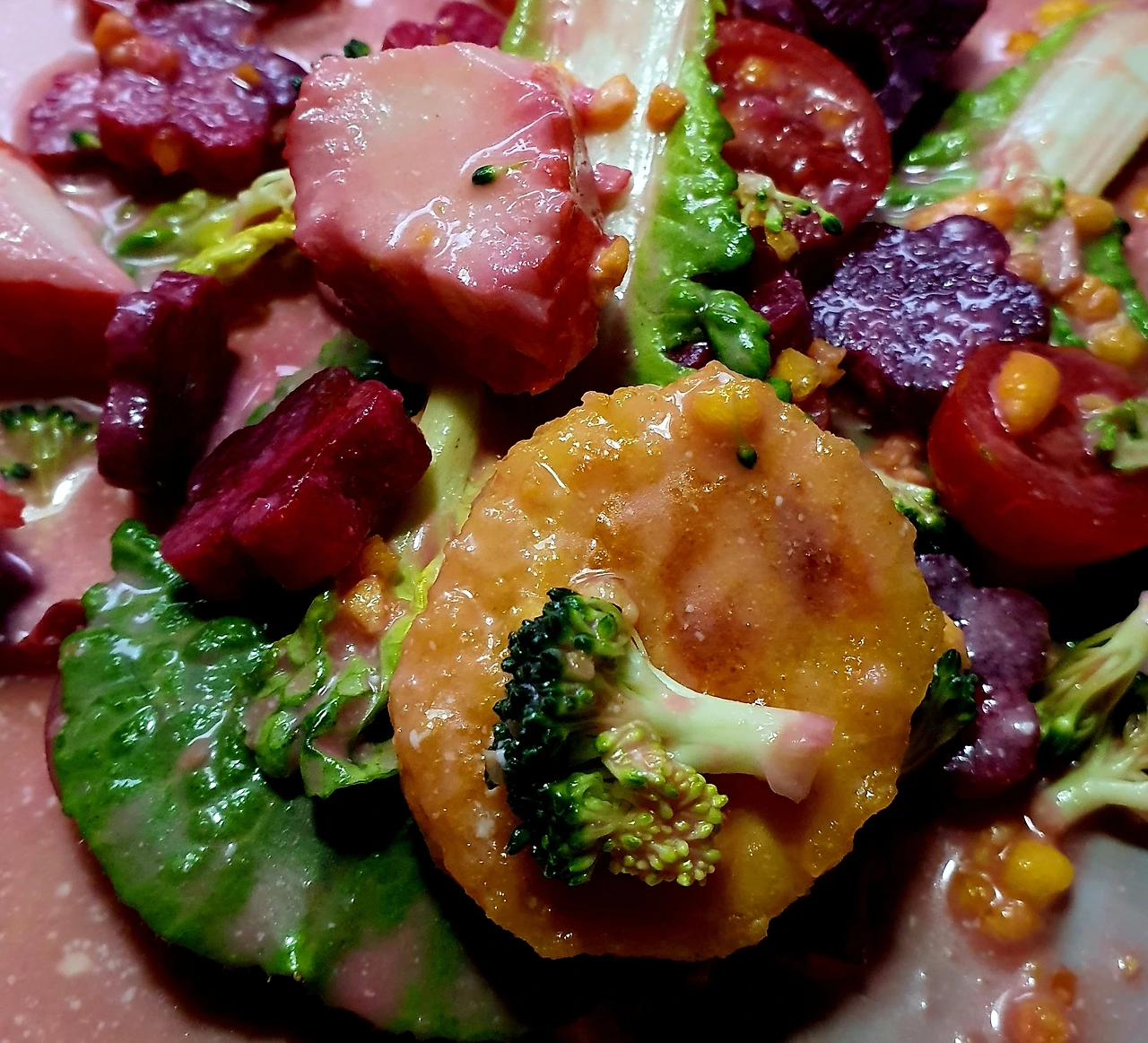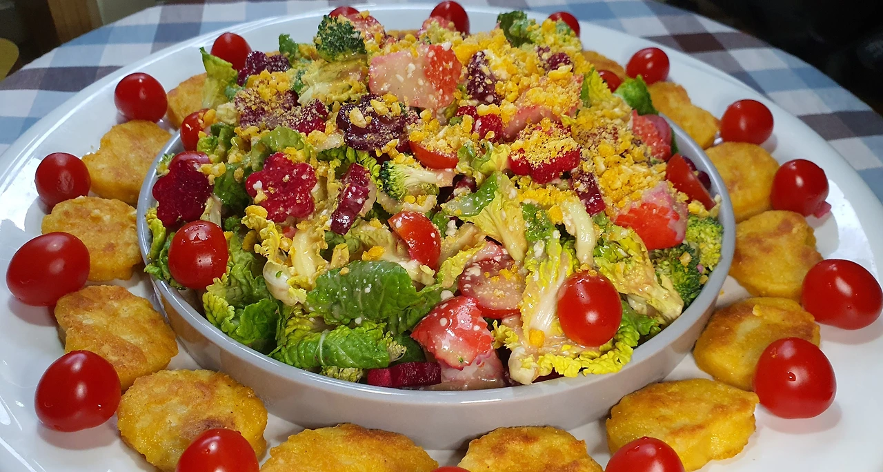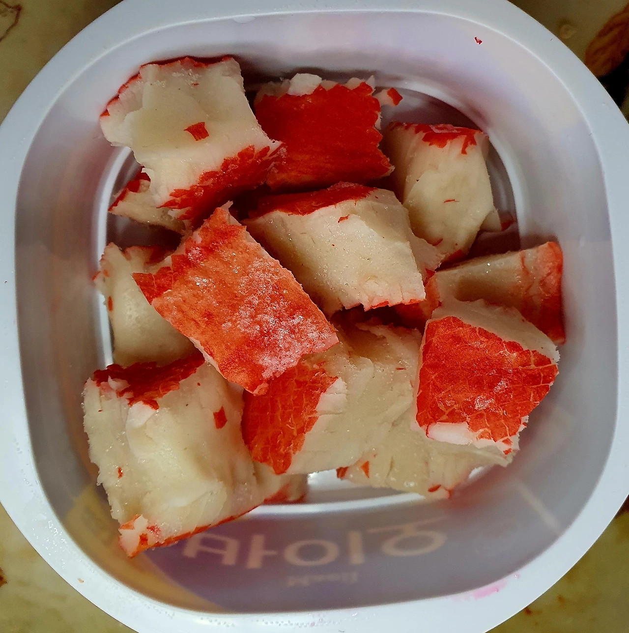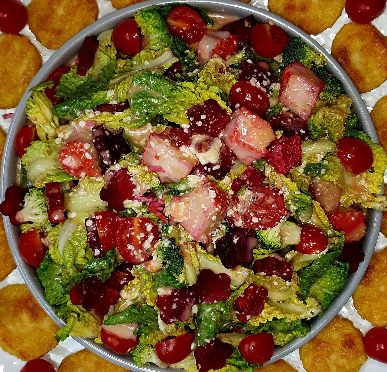 ■ 재료 : 봄동 2컵. 꽃맛살 ⅔컵. 비트 ½컵. 방울토마토 1컵. 치킨너겟 15개. 옥돌콘 2큰술