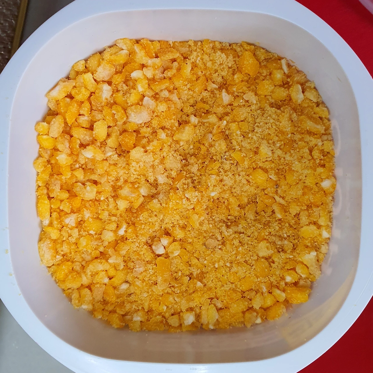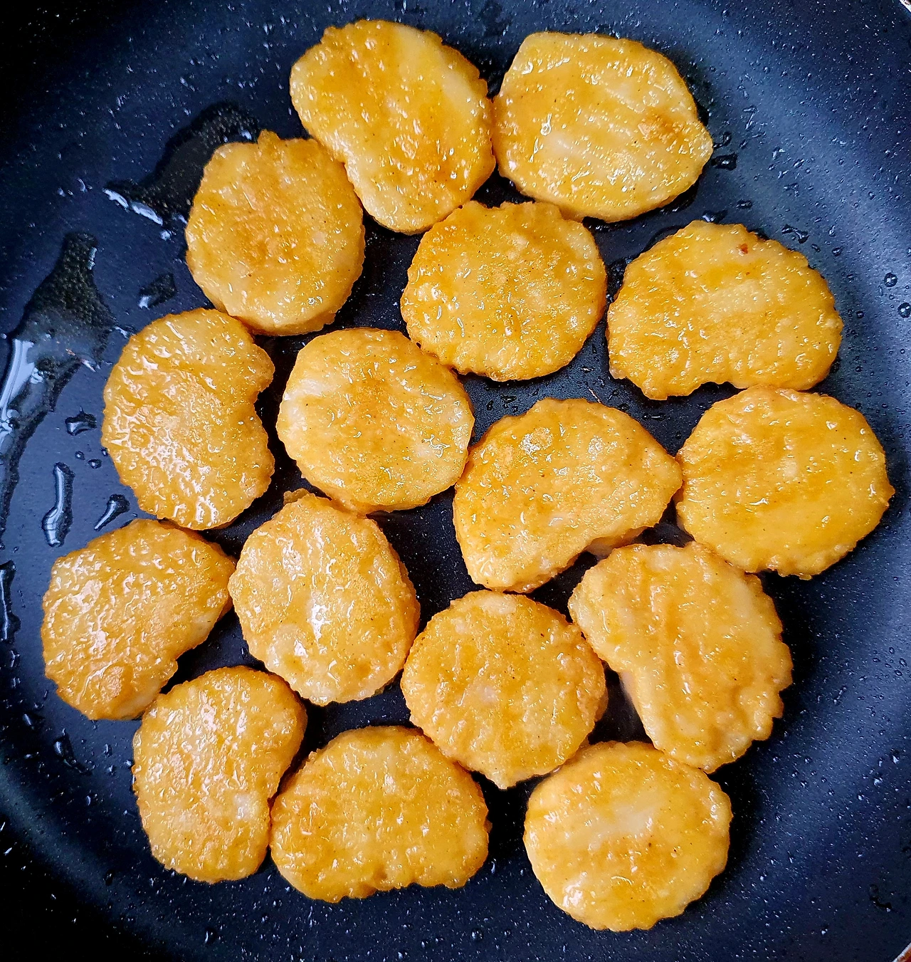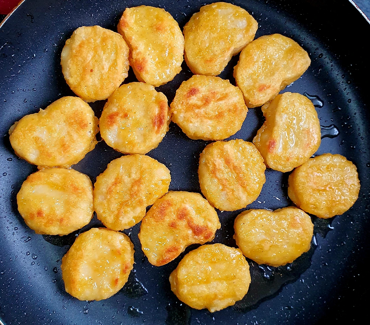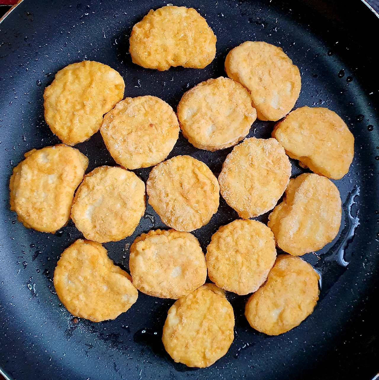 • 치킨너겟은 기름 없이 팬에 구워서 기름기를 빼준다. 옥돌콘은 커터기로 갈아서 준비한다.