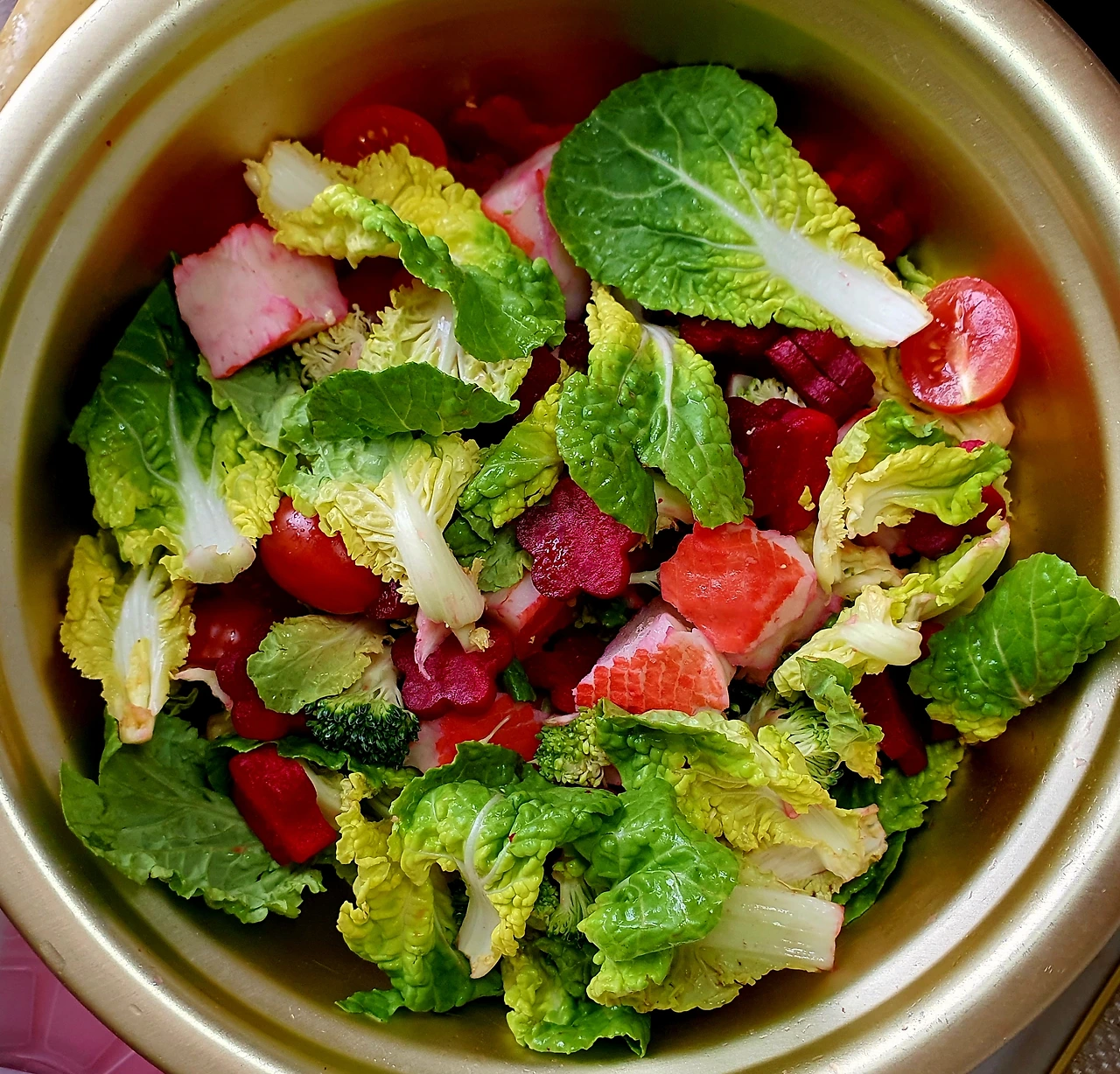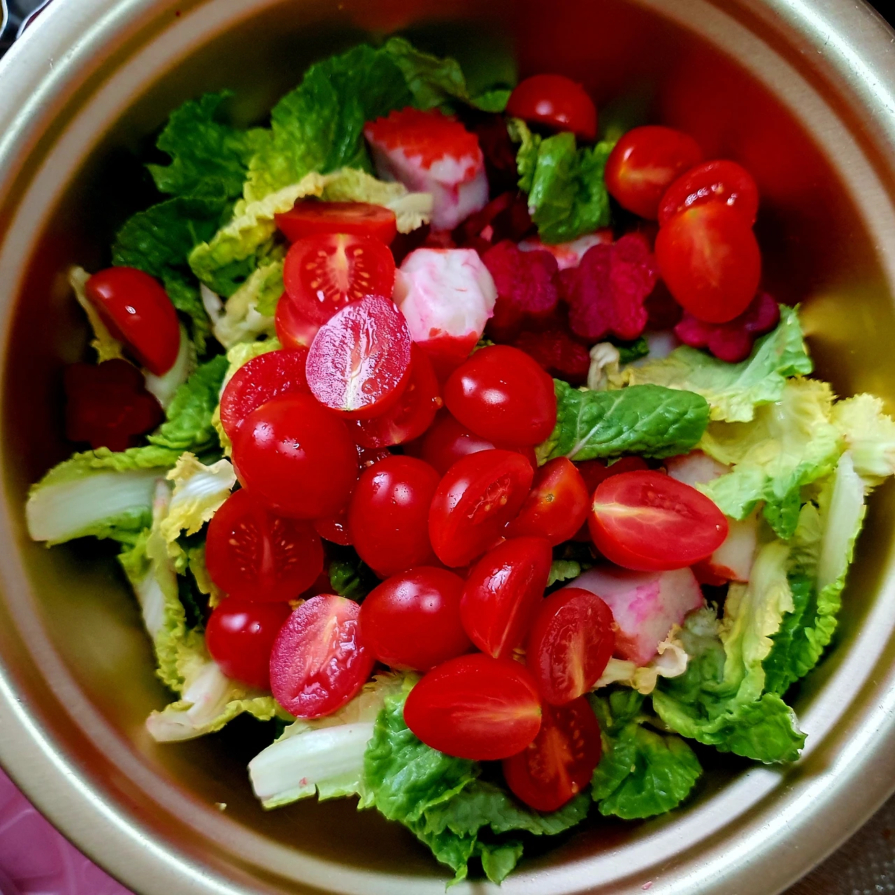 • 볼에 준비한 봄동. 꽃맛살. 비트. 방울토마토를 넣고 잘 섞어준다.