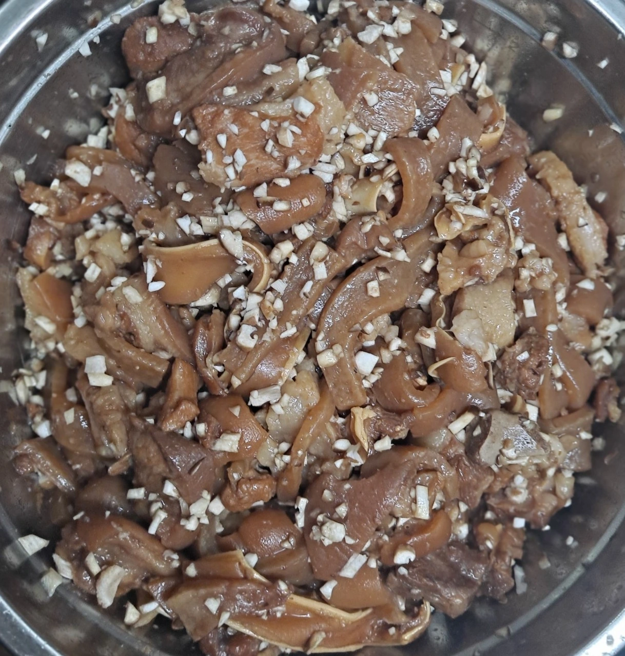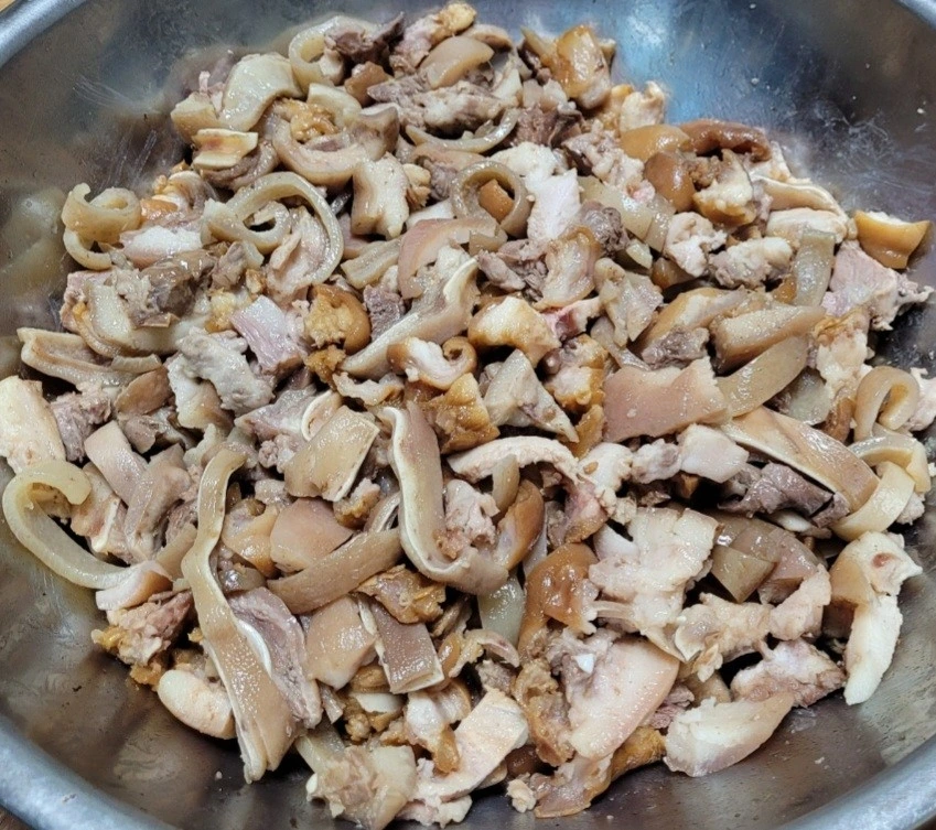 • 초벌삶은 머리 고기는 대충 썰어 준다. 이때 지방 부분은 90% 제거해서 버린다. 지방을 좋아하시면 반정도만 버리시고요. 머리에 목부분에 지방이 너무 많아요. 껍데기는 안쪽 부분을 칼로 긁어내고 밀가루로 씻어 완벽하게 돼지냄새를 없애준뒤 손가락 크기로 잘게 썰어 준비해도 되고 넓적하게 그대로 준비해도 된다.