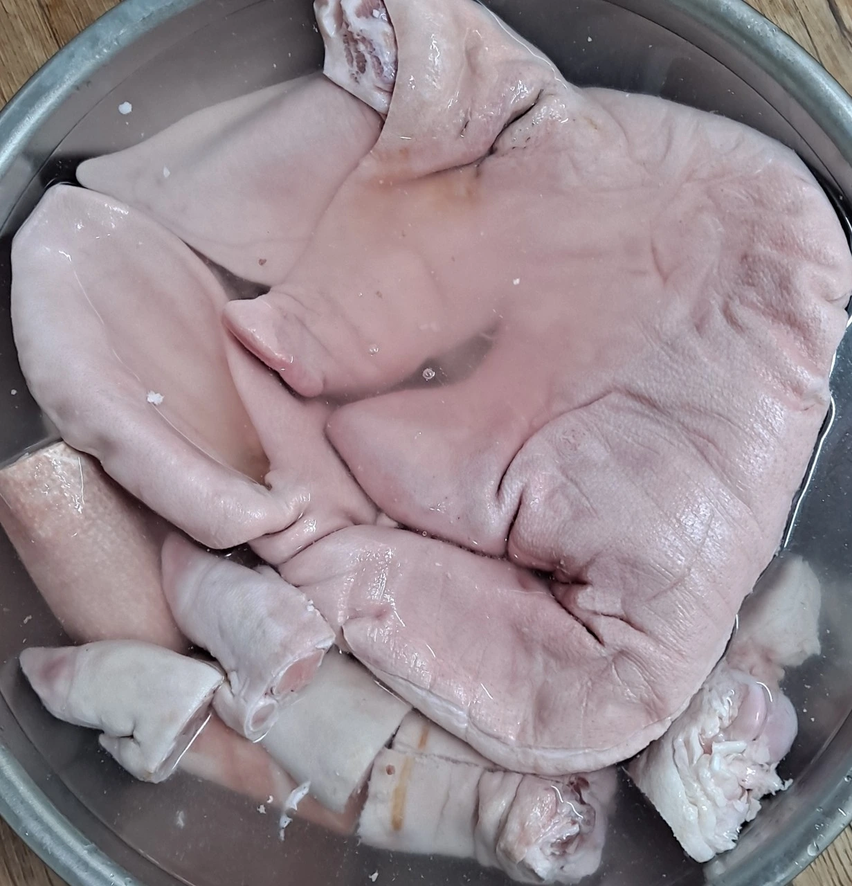 • 족발은 설탕물에 1시간 이상 담가 핏물을 빼준뒤 끓는 물에 소금 2줌을 넣고 후춧가루도 넣고 머리 고기와 껍데기와 같이 넣고 10분 정도 삶아 준다. 돼지머리와 껍데기는 7:3 정도의 비율로 준비한다. 족발은 1벌!