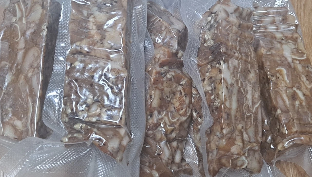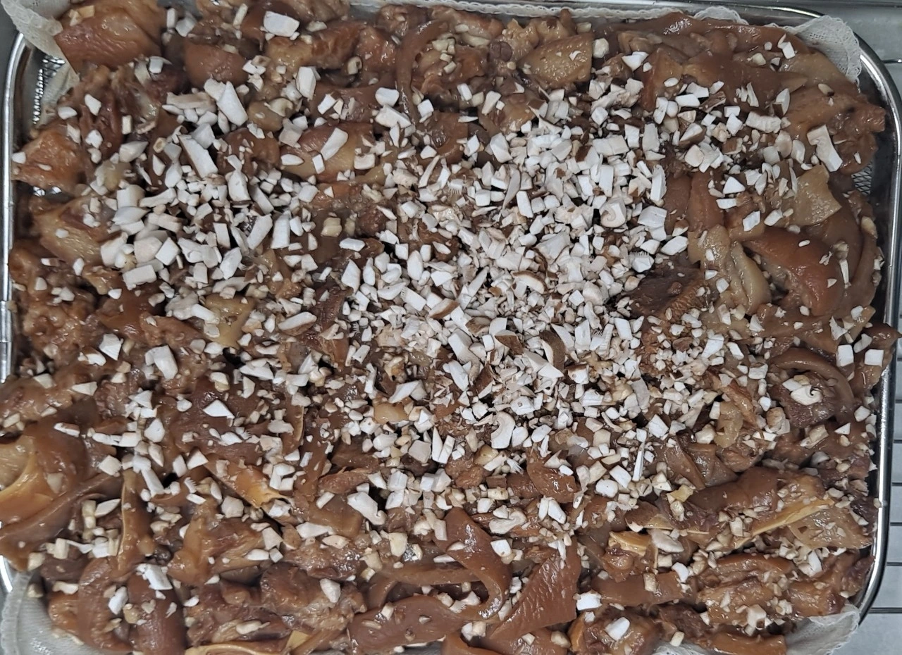 면포 속에 삶아진 고기를 꺼내 머리 고기는 깍둑썰기를 해주고 껍데기도 잘게 썰어 준비하고, 족발은 뼈와 살을 발라서 준비한다. 준비한 머리 고기, 족발, 껍데기를 압력솥에 모두 넣고 남은 고기삶은 물을 모두 넣고 30분 정도 삶아준다.