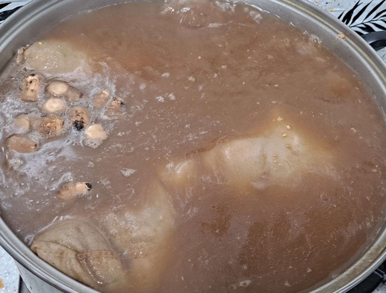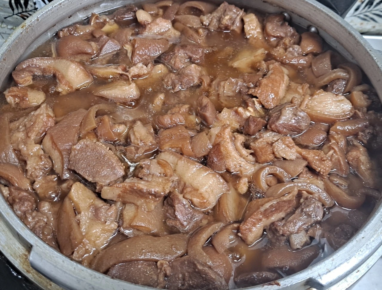 • 준비한 머리 고기와 껍데기. 족발을 면포에 넣어 준비하고, 삶기 재료인 한약재와 가시오가피2줌. 무우½개. 양파2개. 대파3대. 마늘1줌. 생강1개. 고추씨1줌. 월계수잎3장. 통후추1큰술. 땅콩1줌을 넣고 1시간 정도 삶아 육수를 뺀다음 건더기를 모두 건져 내고 머리 고기와 껍데기. 족발을 넣고 소주1병. 된장1국자. 커피1큰술. 매실청3큰술. 콜라½병. 간장4컵. 황설탕1컵. 요쿠르트5병. 액젓½컵을 넣고 60분 삶아준다.