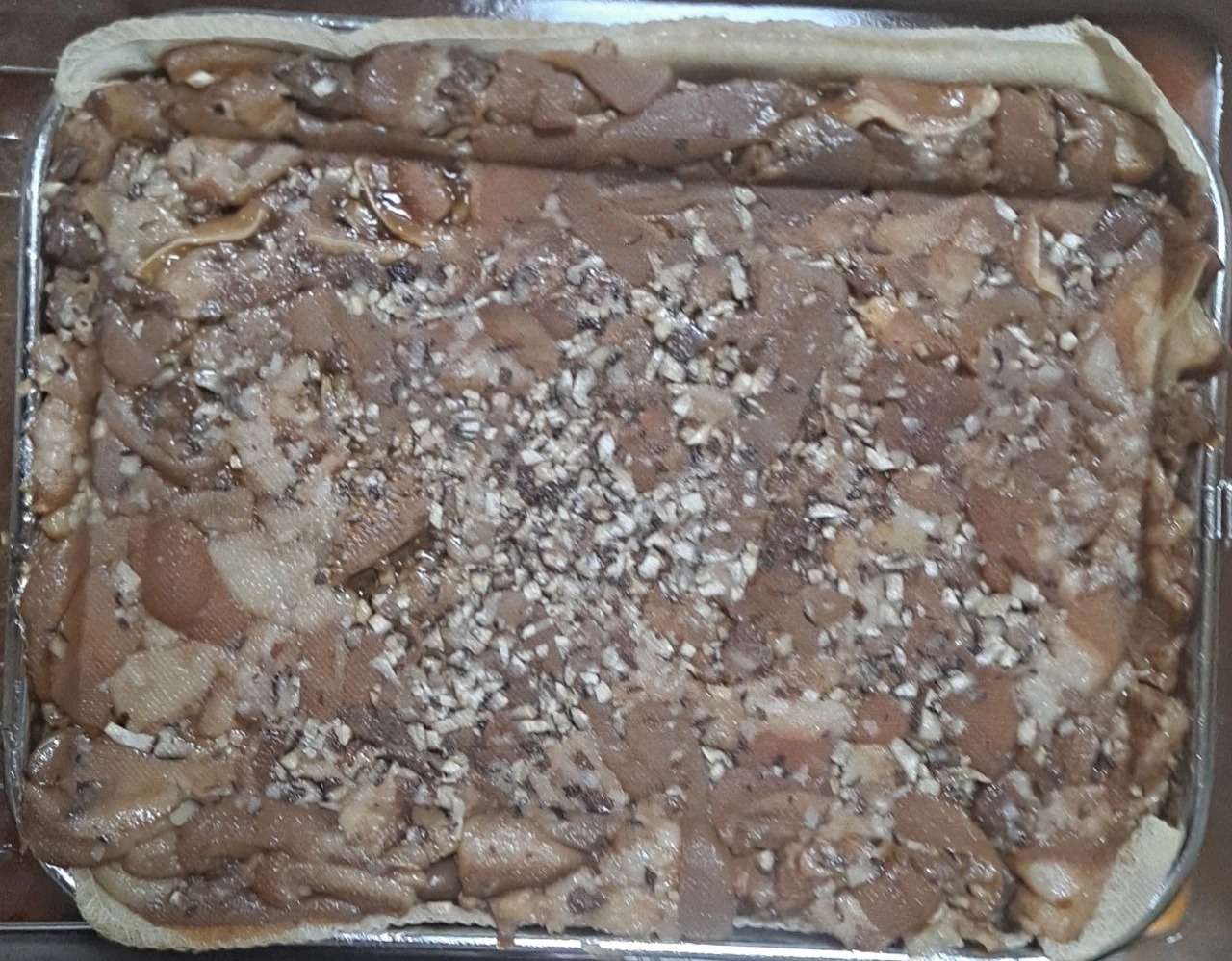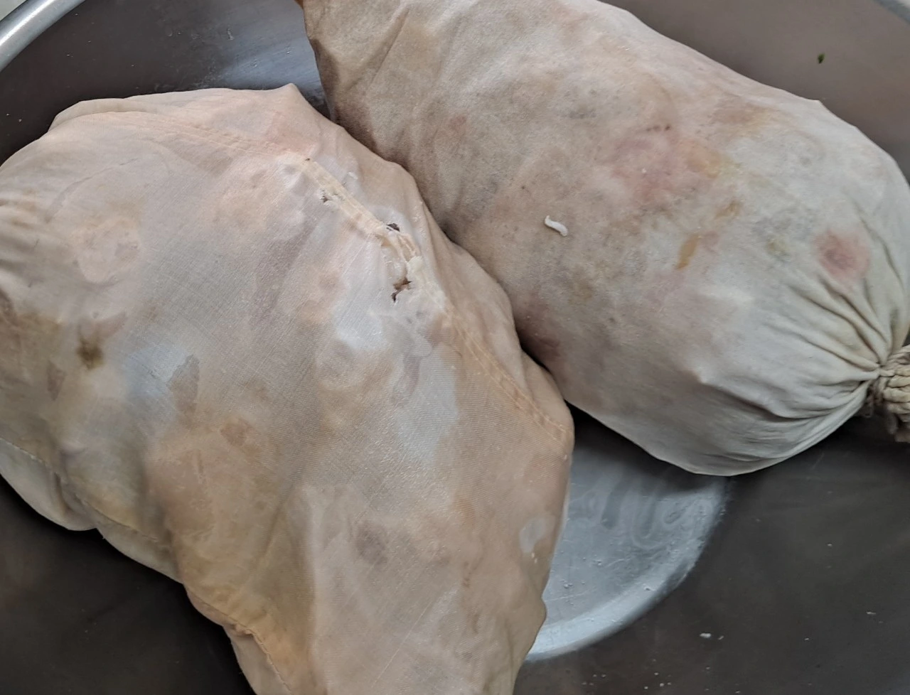 • 삶아진 고기재료와 표고버섯을 같이 양푼에 담아 새우젓2큰술과 같이 골고루 잘 섞어준 다음 채반에 올려 무거운 것을 올려 눌러준다. 난 차량용 요소수2박스를 올렸어요...ㅋㅋ 하루정도 눌러 굳혀준 뒤 얄팍하게 썰어 먹음 완성.
