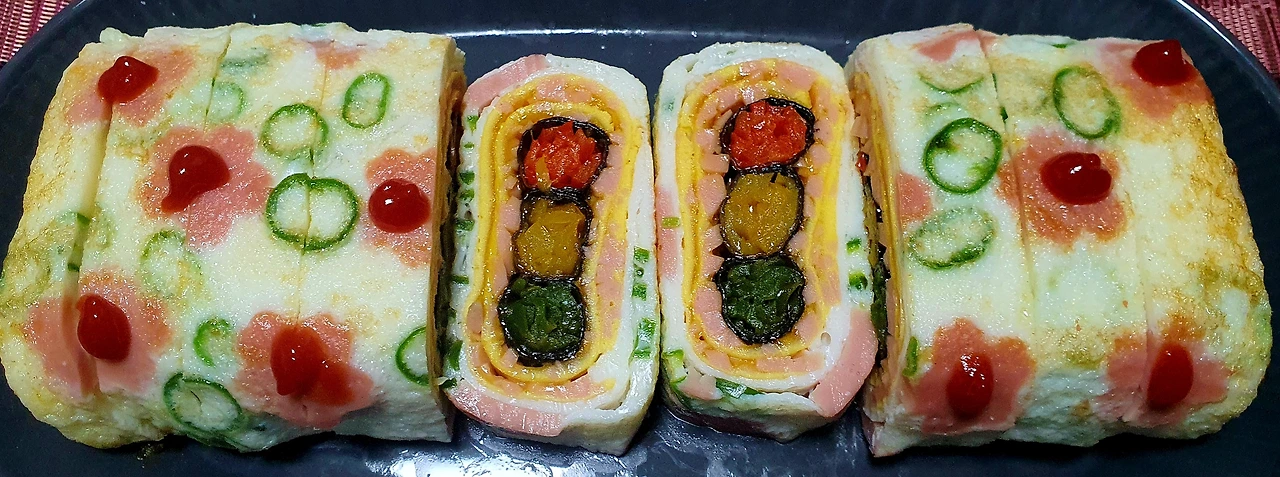 ▪︎먹기좋은 크기로 썰어서 완성접시에 올리면 완성. 이때 분홍 소시지위에 빨간 케첩을 콕콕 찍어주면 더 예쁜 달걀말이가 된다.