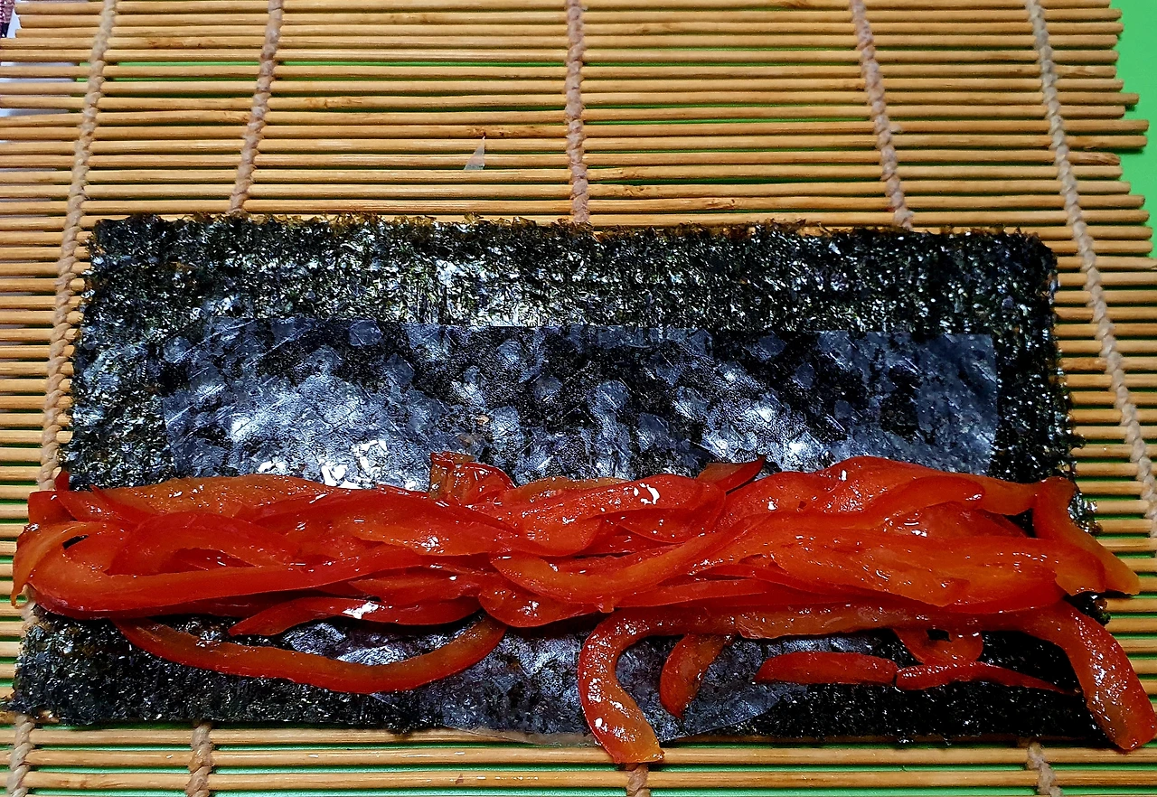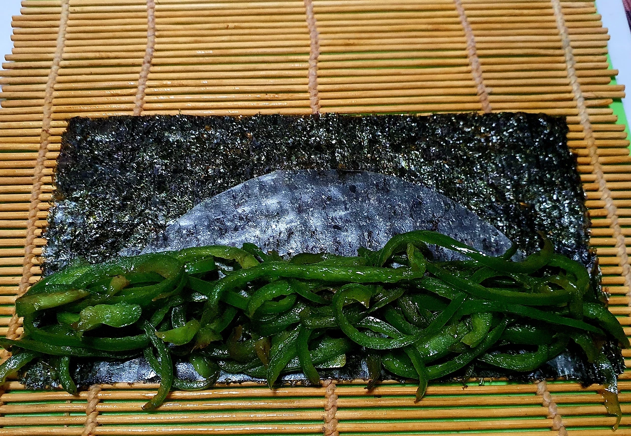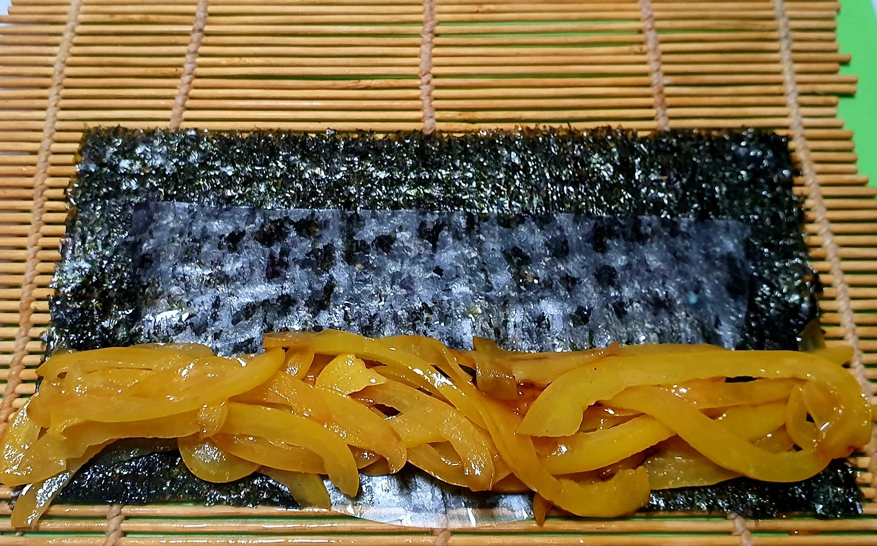 ▪︎김을 반으로 잘라 바닥에 깔고 라이스페이퍼도 반으로 잘라 물에 담갔다가 김위에 올리고 그위에 볶아둔 빨강. 노랑. 초록 야채를 각각 넣고 돌돌 말아 준다. (라이스페이퍼가 없으면 야채들이 김과 함께 잘 말리지가 않는다)