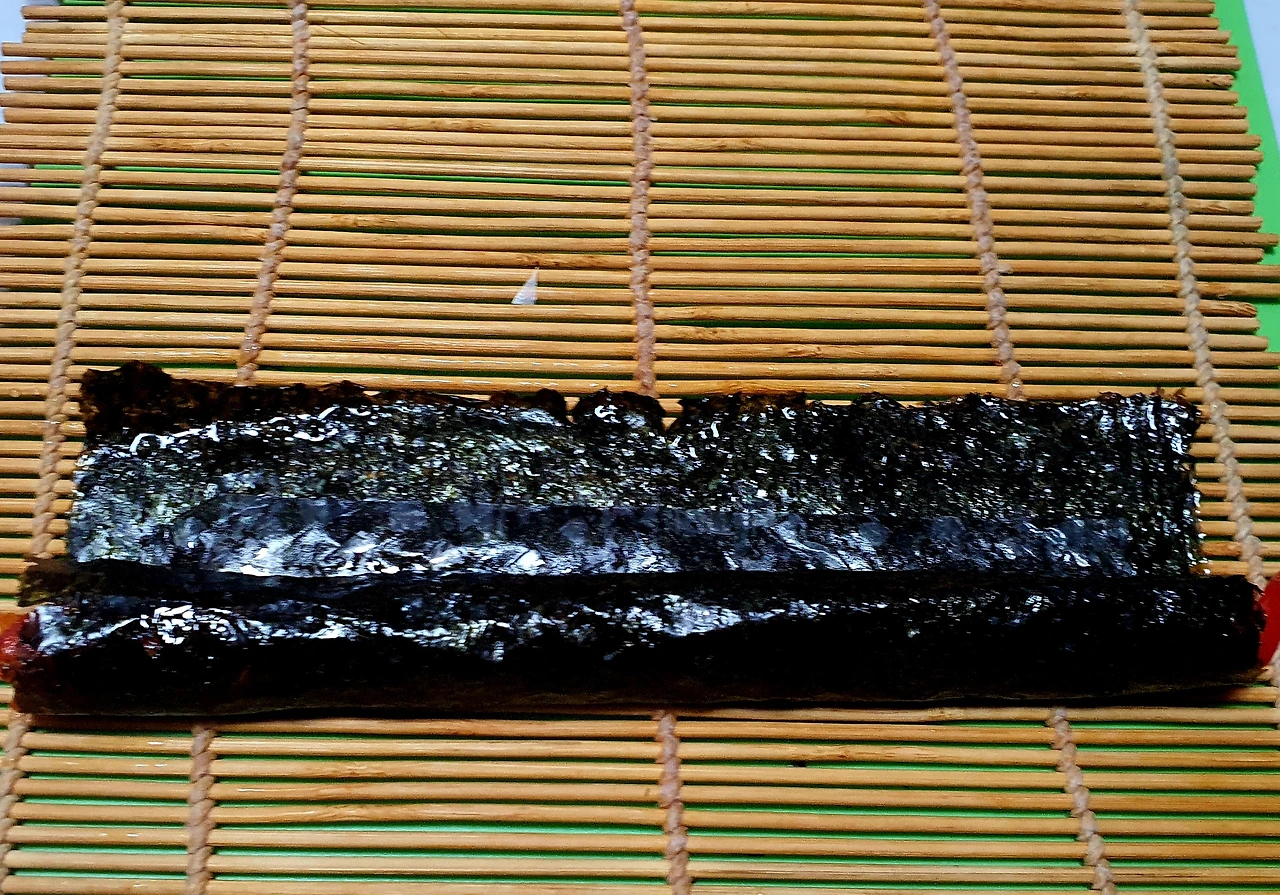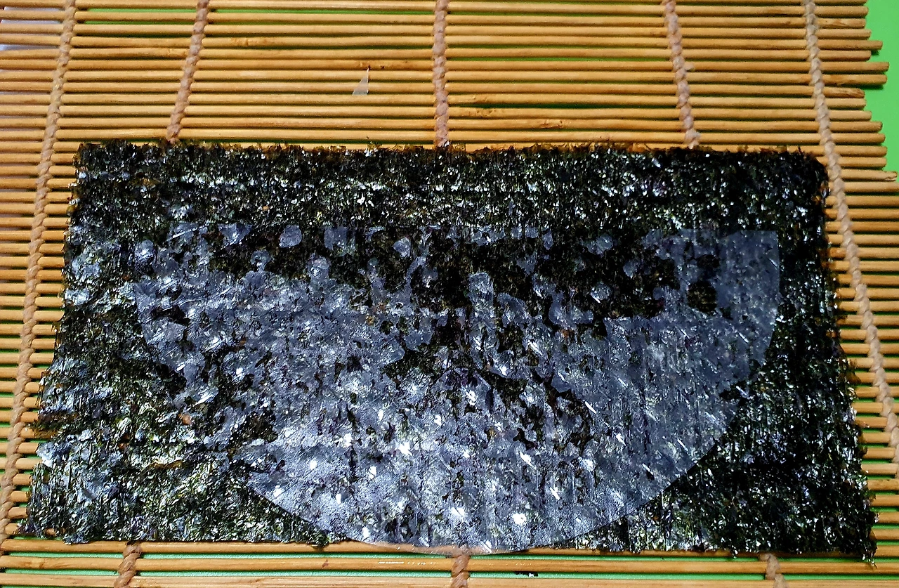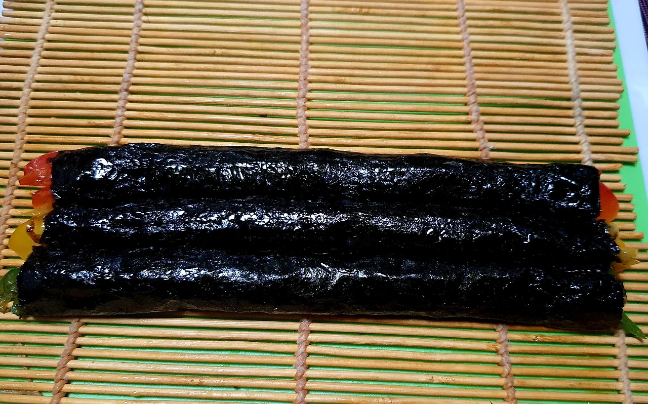▪︎김을 반으로 잘라 바닥에 깔고 라이스페이퍼도 반으로 잘라 물에 담갔다가 김위에 올리고 그위에 볶아둔 빨강. 노랑. 초록 야채를 각각 넣고 돌돌 말아 준다. (라이스페이퍼가 없으면 야채들이 김과 함께 잘 말리지가 않는다)