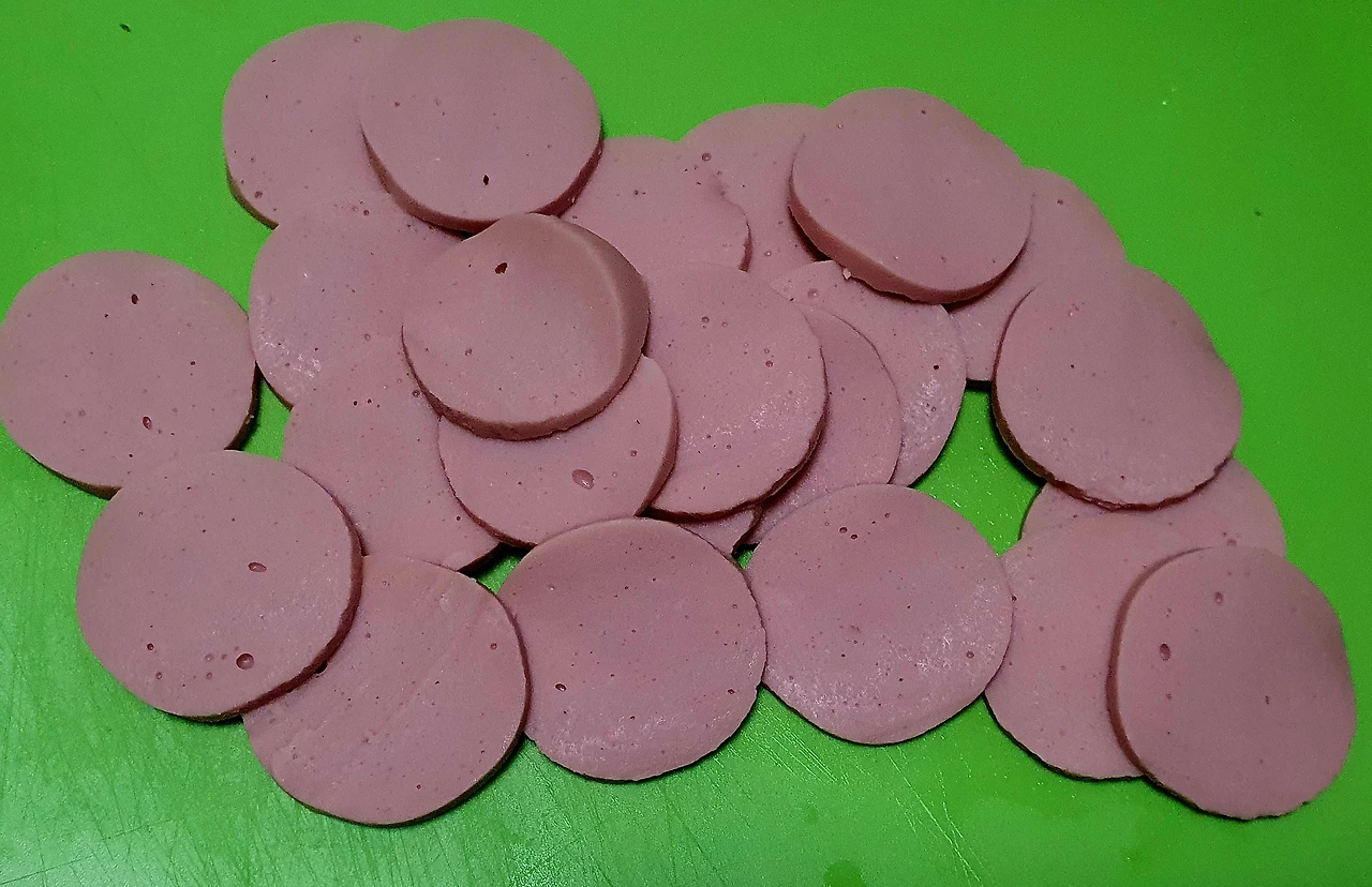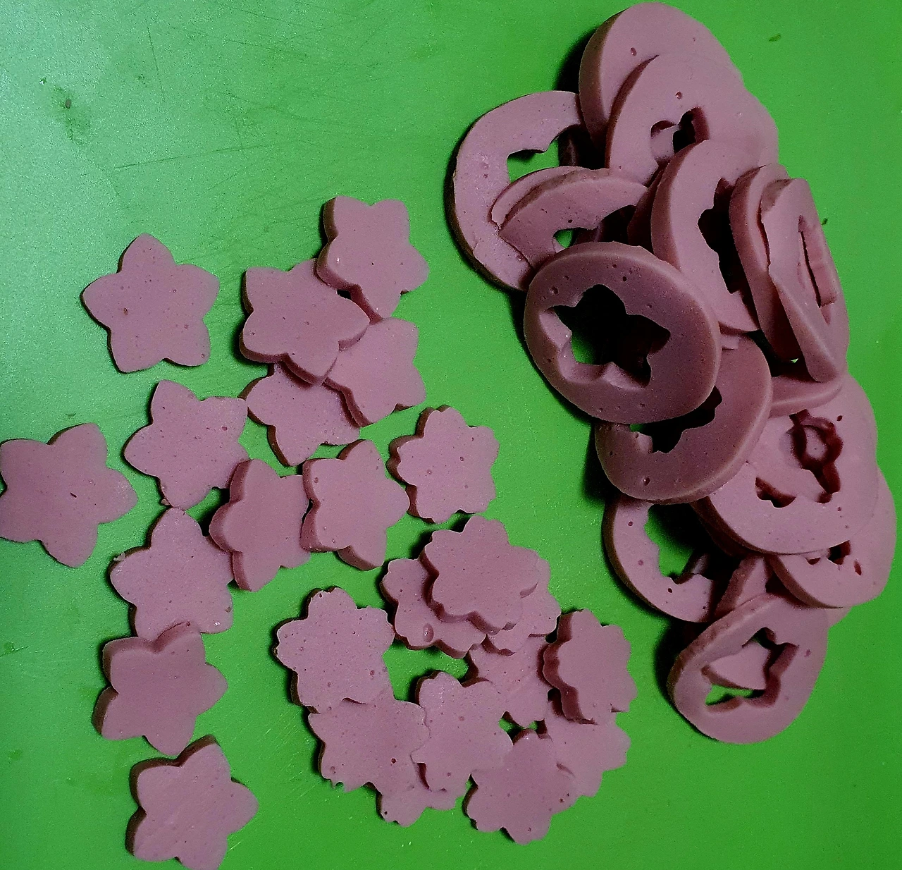 ▪︎분홍소시지는 얇게 썰어서 꽃모양 틀로 20개정도 찍어 둔다. 틀로 찍고 남은 자투리는 잘게 다져 소금 조금 넣고 노른자와 섞어준다.