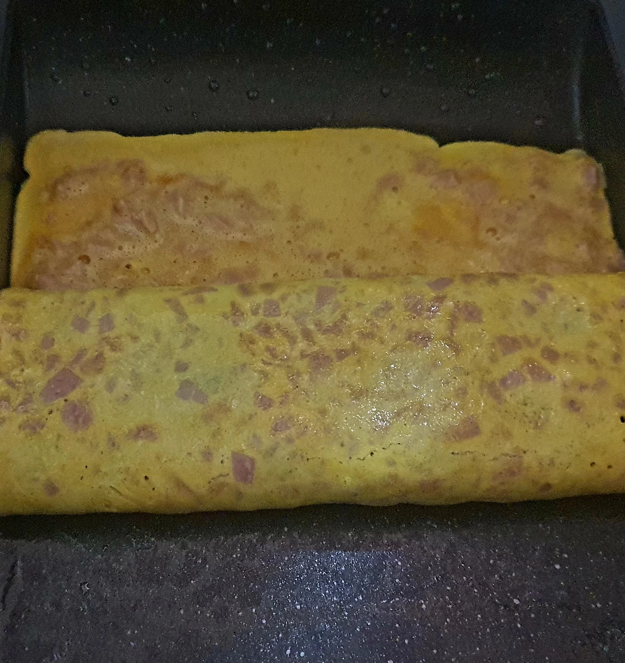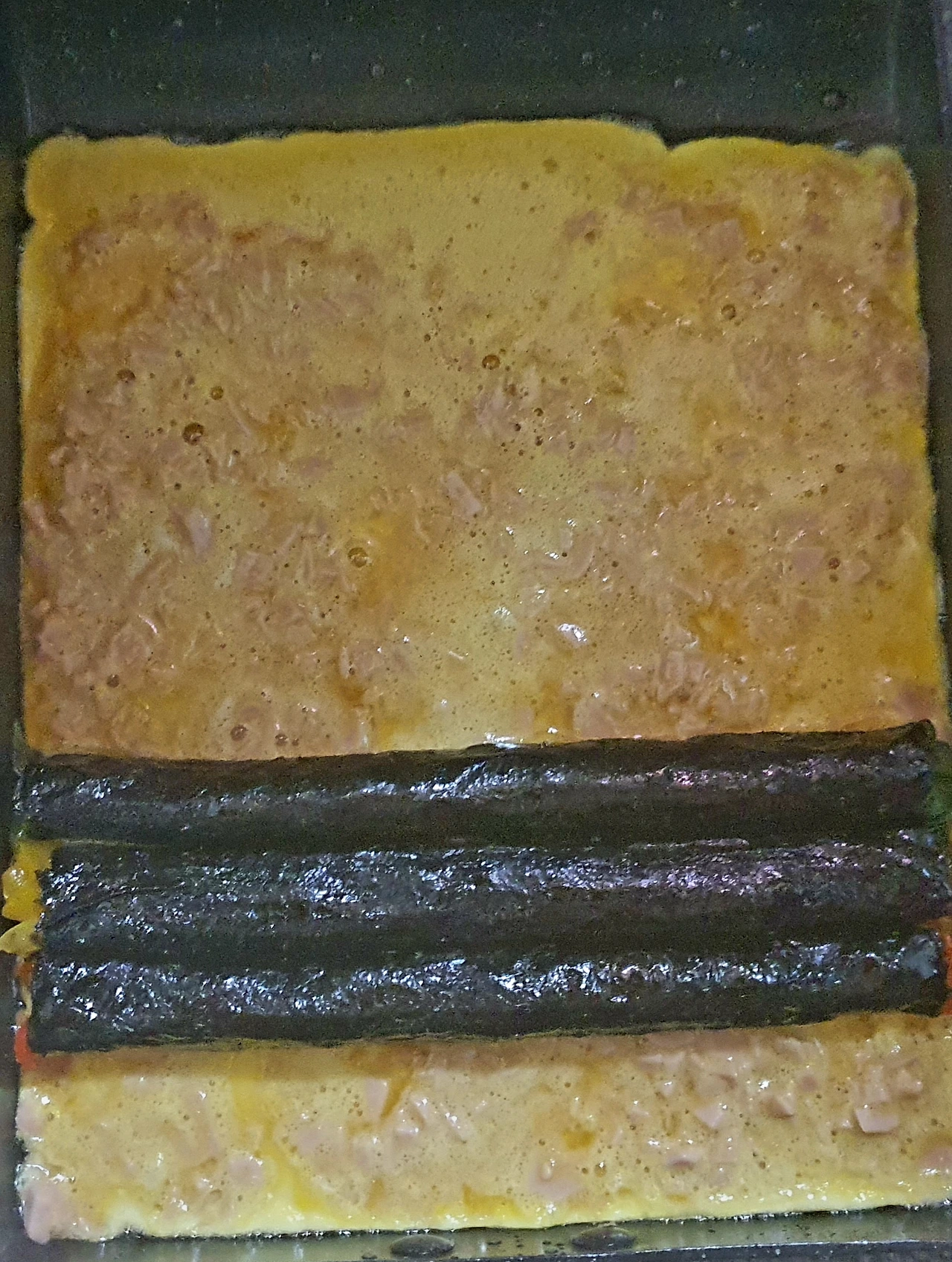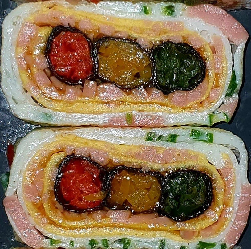 ▪︎팬에 식용유를 고루 발라준 다음 노른자를 부어주고, 이때 미리 말아둔 빨강.노랑.초록 김말이를 가지런이 올려주고 계란말이를 한다.