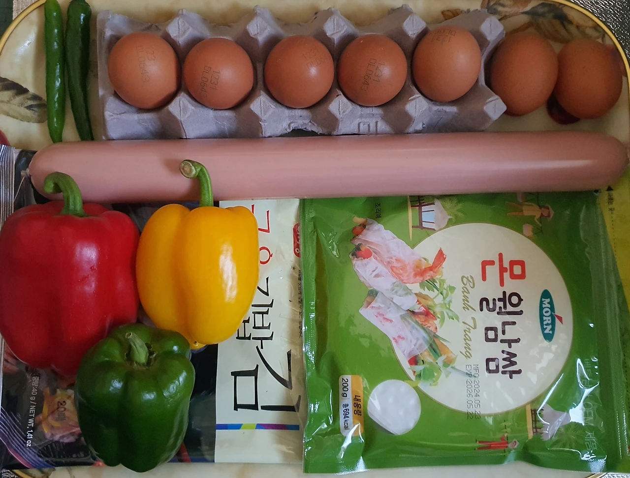 ● 재료 : 달걀7개. 분홍소시지½개. 청양고추2개. 김1½장. 라이스페이퍼1½장. 노.빨 파프리카각½개씩. 피망½개. 소금. 식용유