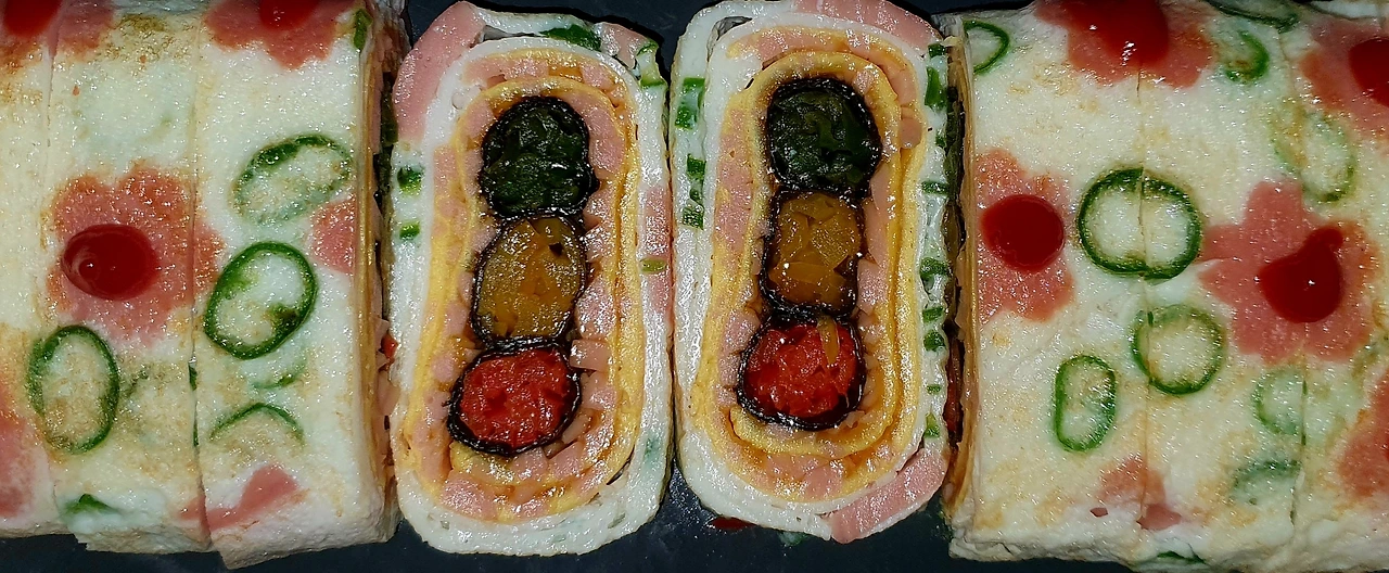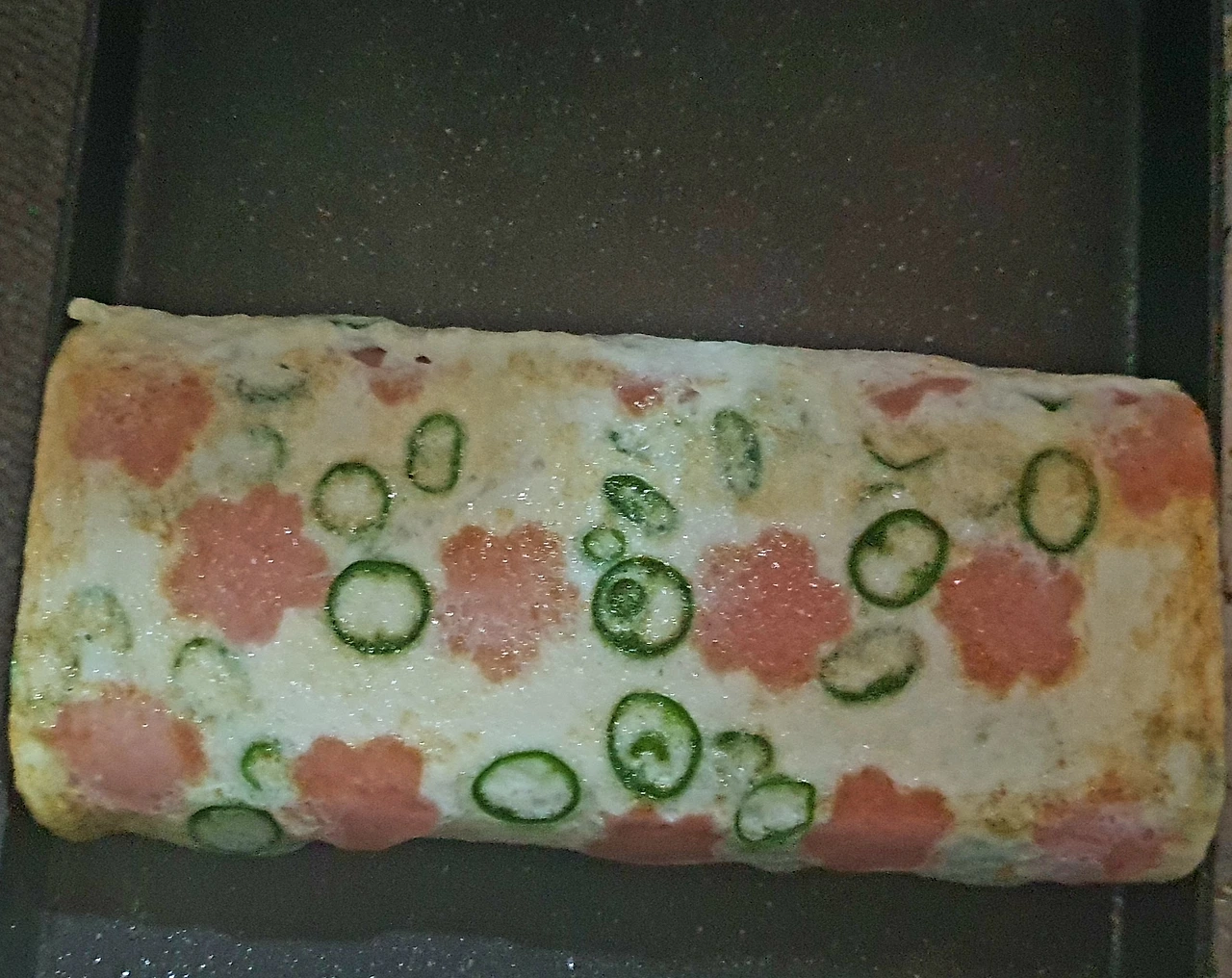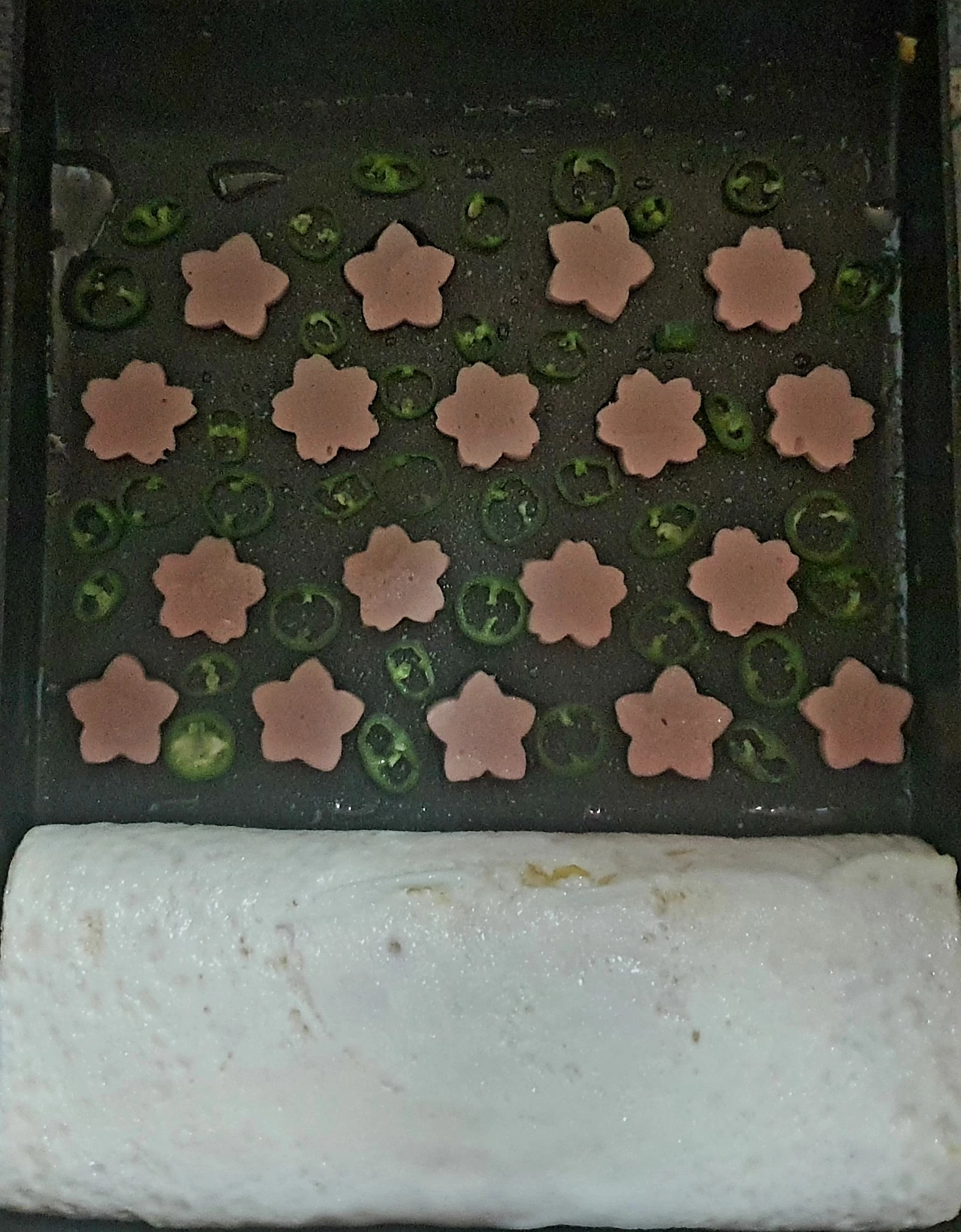 ▪︎노른자 계란말이가 완성 되면 팬 한쪽 끝에 두고 꽃모양 소시지와 청양고추를 보기 좋게 펼쳐 모양을 내준다.