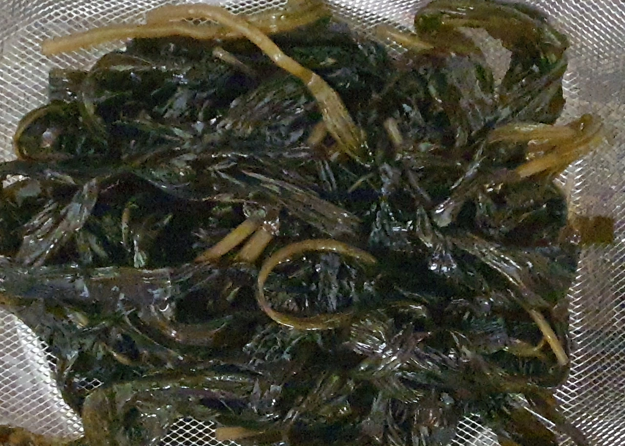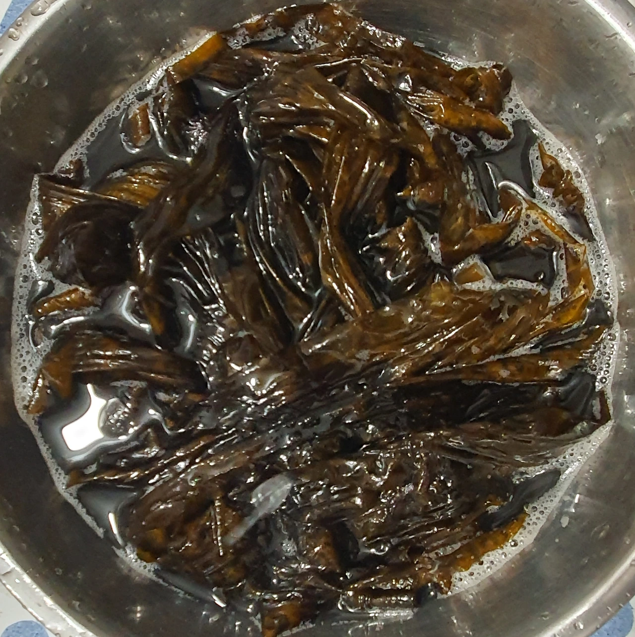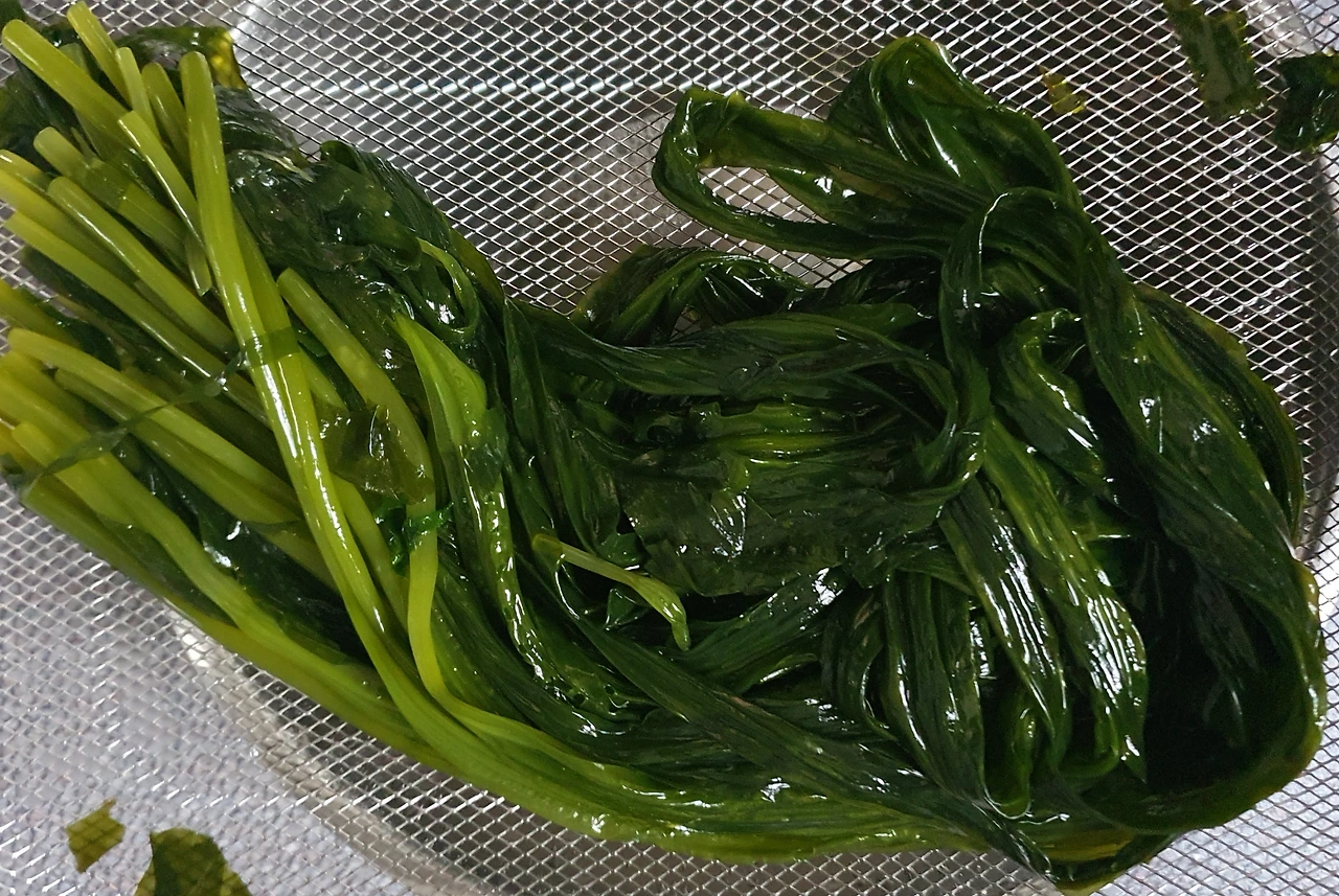 • 끓는 물에 소금을 한큰술 넣고 곰피를 데쳐준다. 갈색 곰피가 초록색으로 변하면 건져 찬물에 식힌후에 수분을 빼고 먹기 좋은 크기로 썰어 둔다.