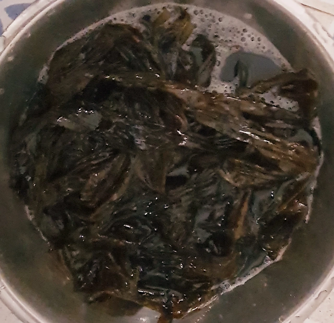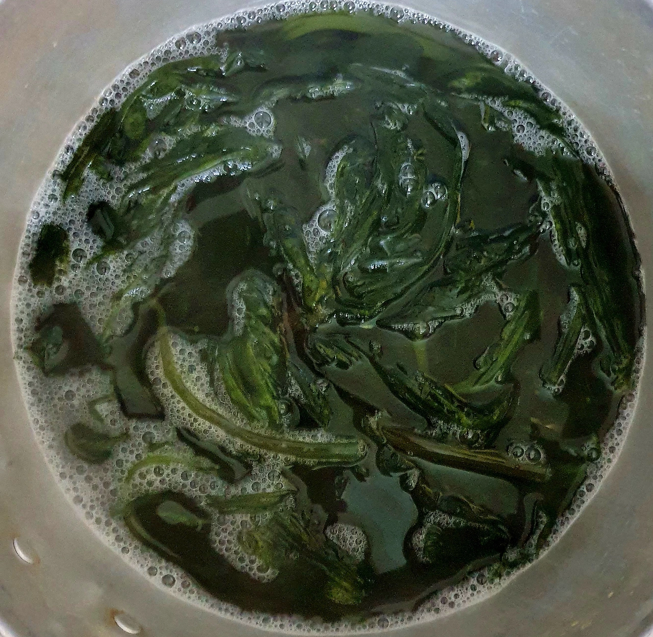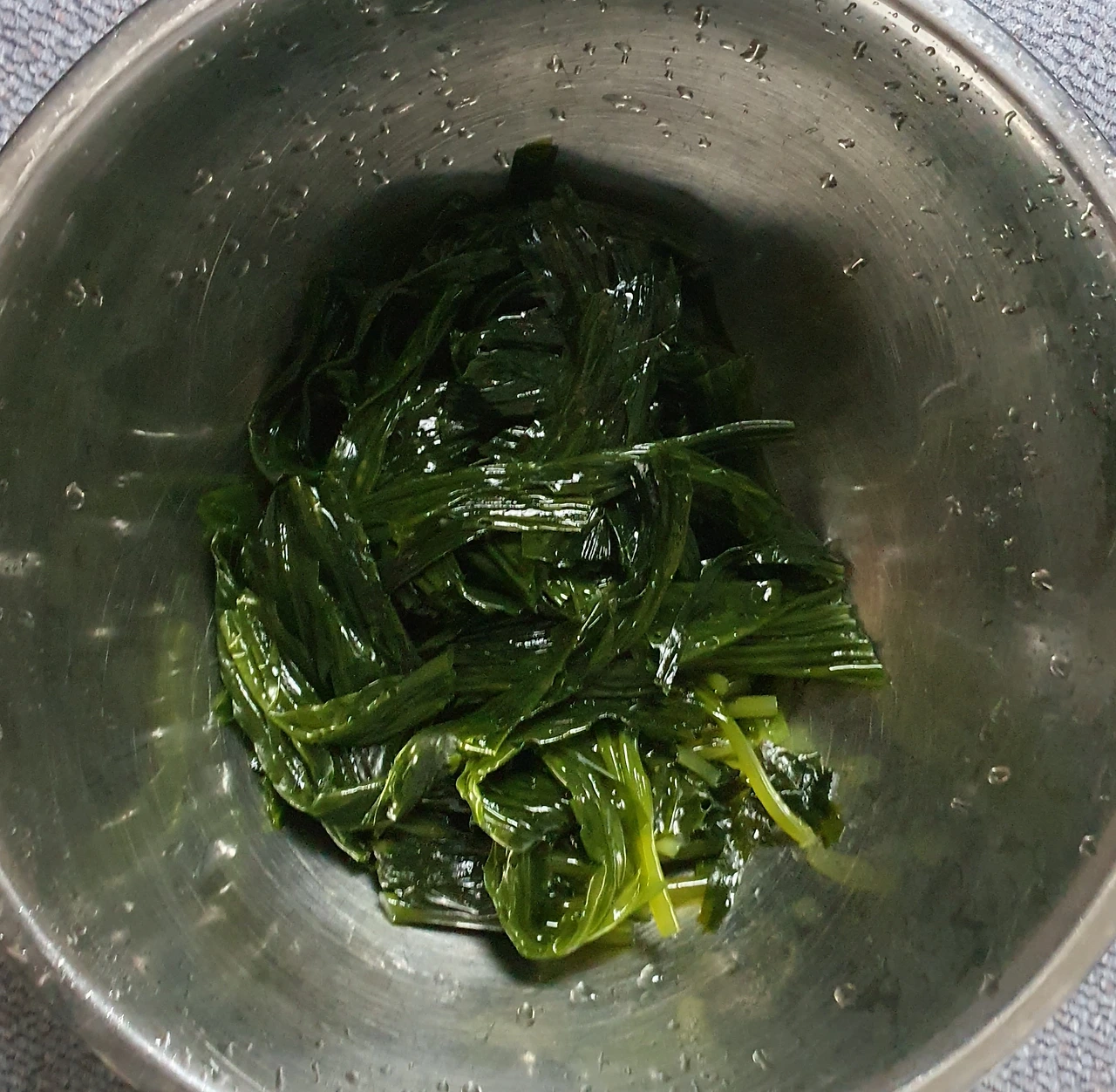 • 끓는 물에 소금을 한큰술 넣고 곰피를 데쳐준다. 갈색 곰피가 초록색으로 변하면 건져 찬물에 식힌후에 수분을 빼고 먹기 좋은 크기로 썰어 둔다.