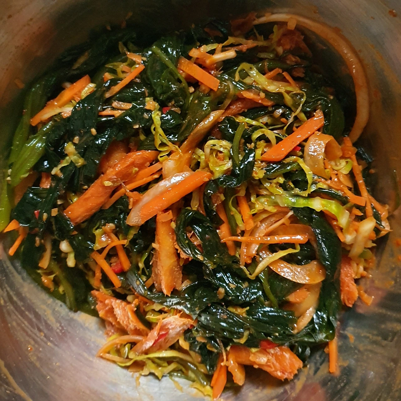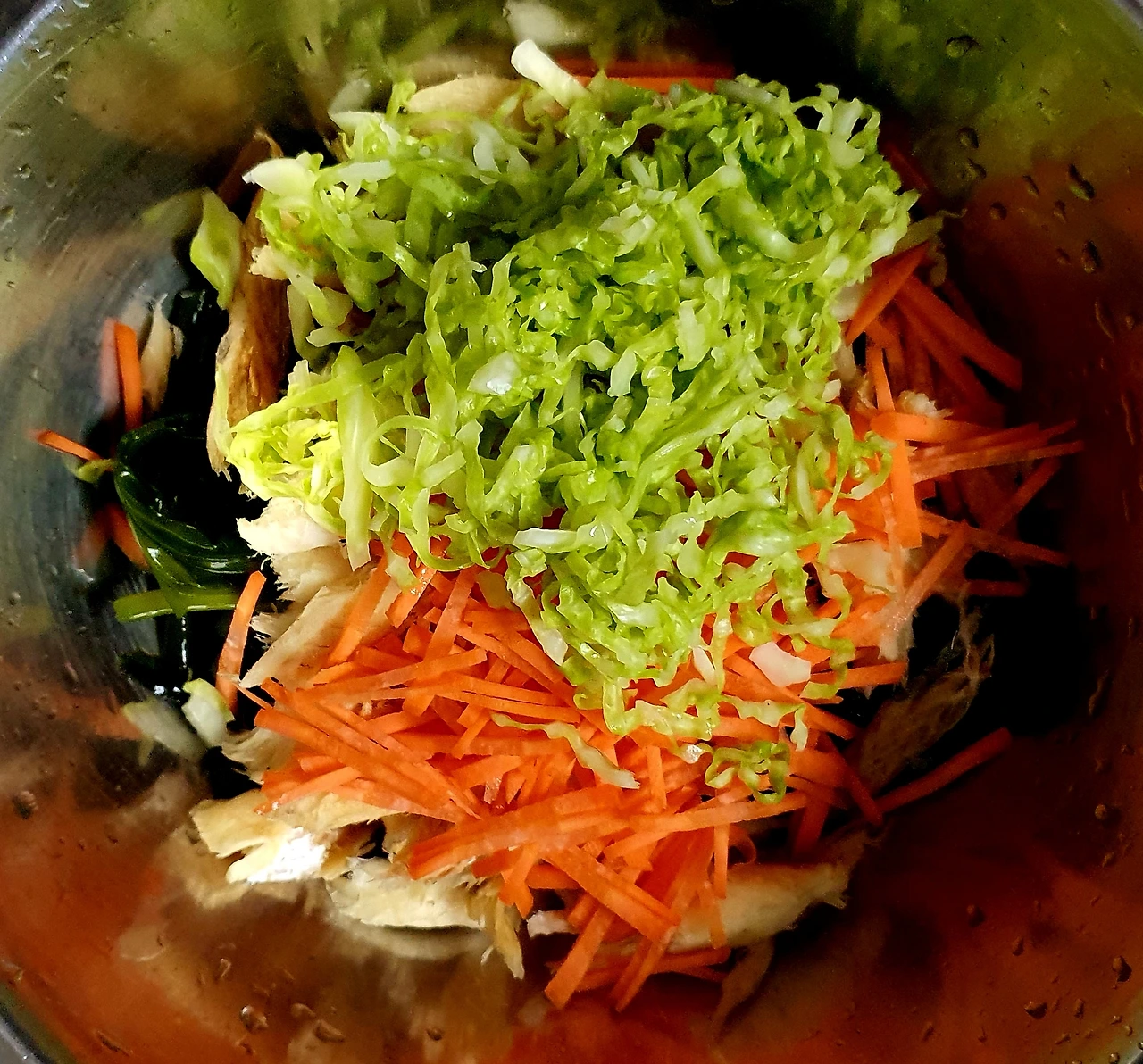• 모든 재료가 준비되면 볼에 곰피와 황태채를 펼쳐서 넣어주고 위에 양배추와 양파를 올리고 준비한 초고추장의 ⅔만 넣고 버무려준 다음 맛을보고 남은 양념으로 간을 해준다.