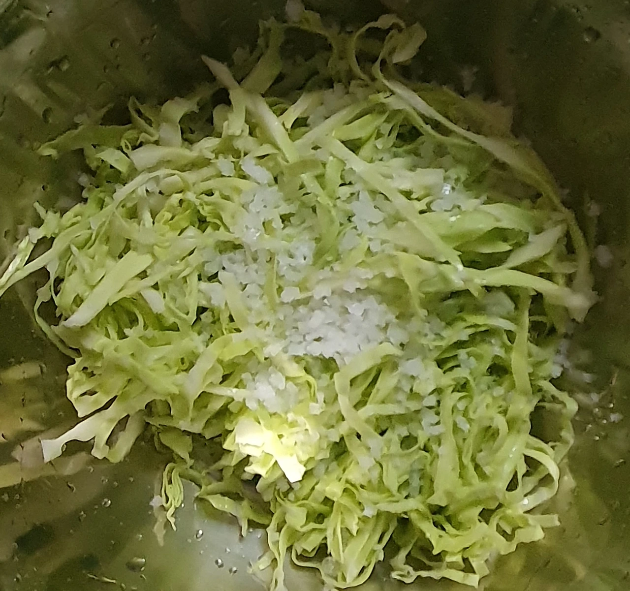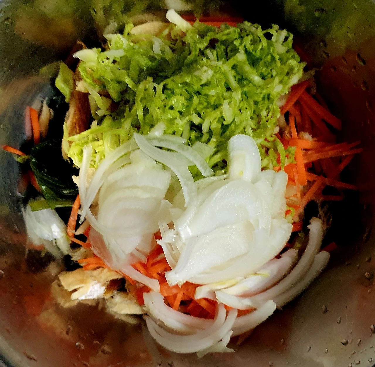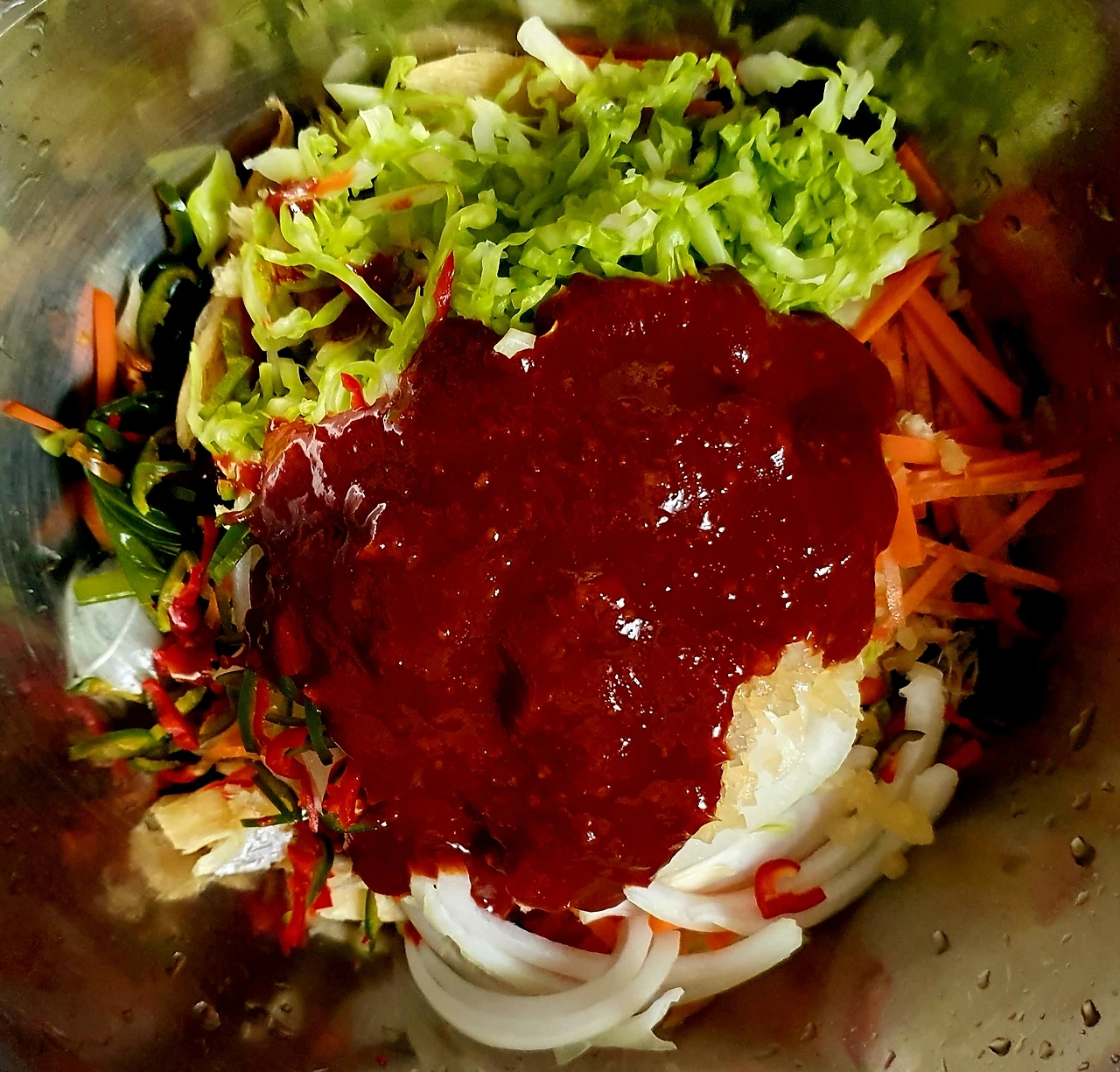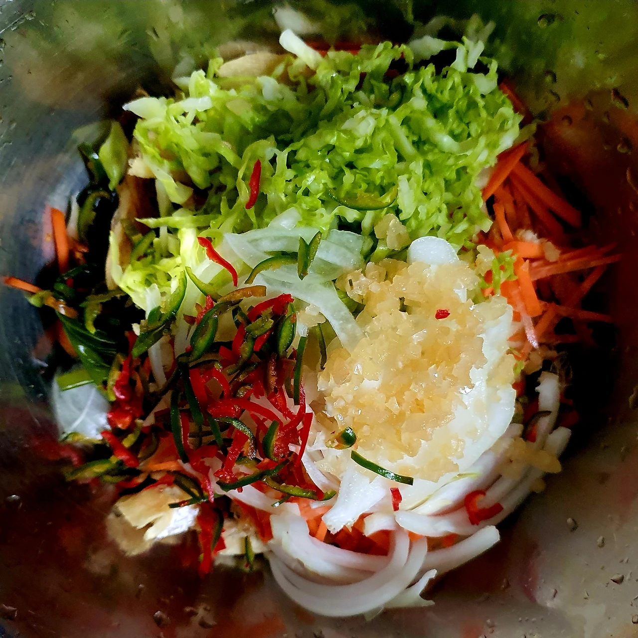 • 양배추는 채를 썰어 소금에 살짝 절여서 준비하고, 당근. 양파도 채를 썰어 준다. 청양고추는 쫑쫑 썰어 둔다.