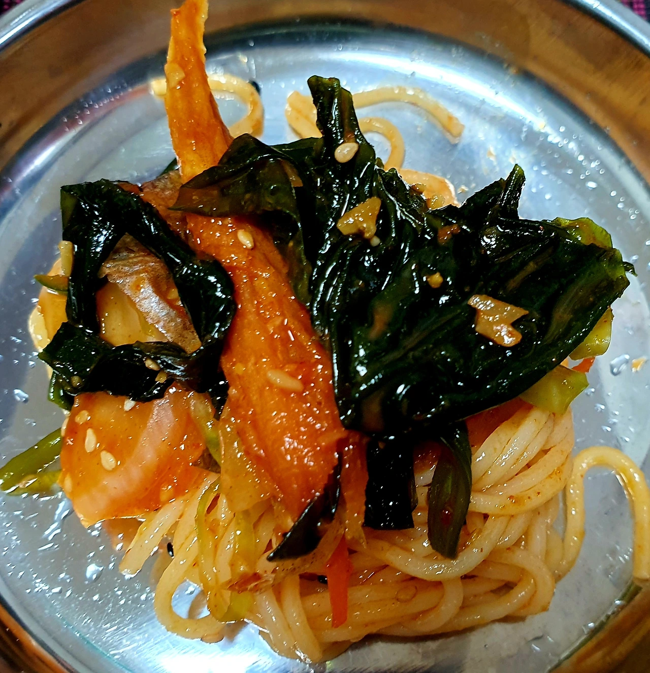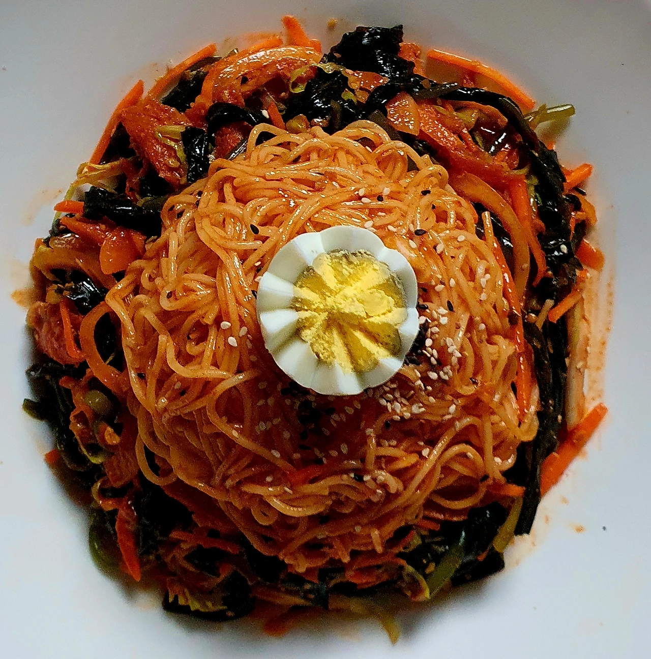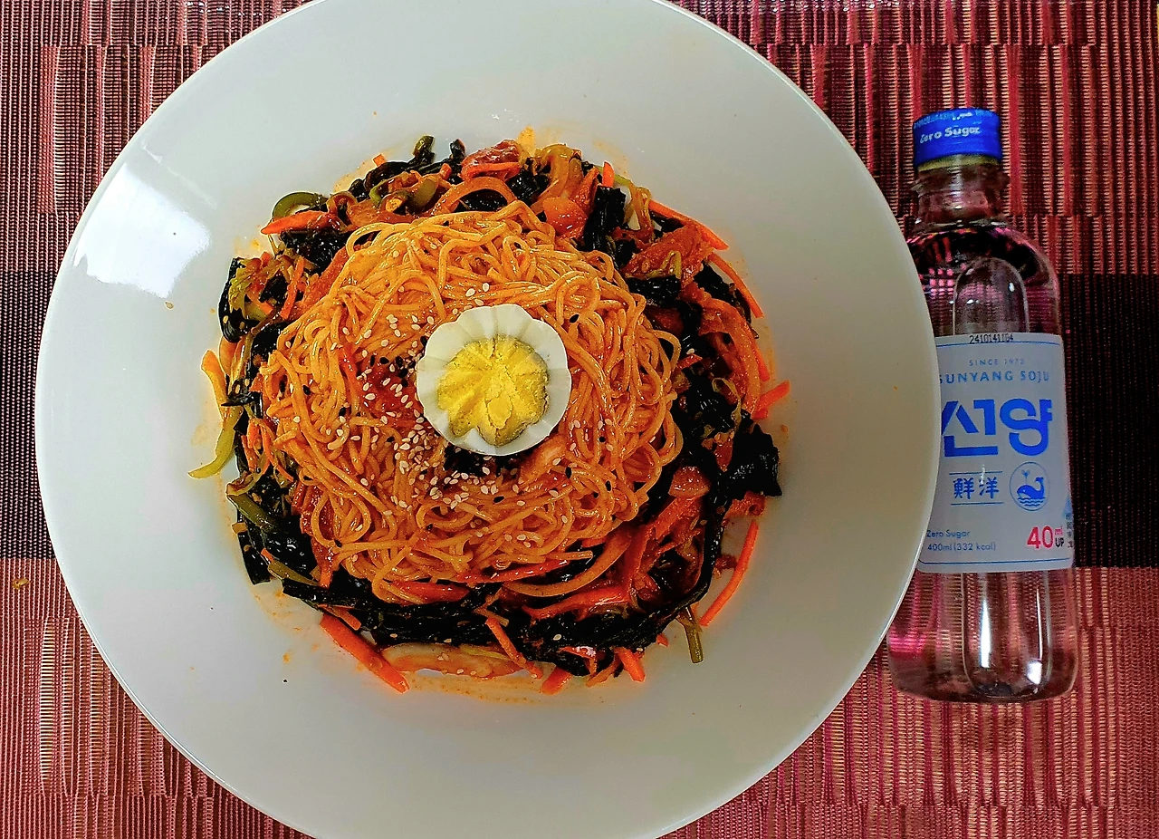 • 완성접시에 곰피무침과 비빔국수를 올리고 썰어 놓은 청양고추와 통깨로 마무리를 해주면 완성.