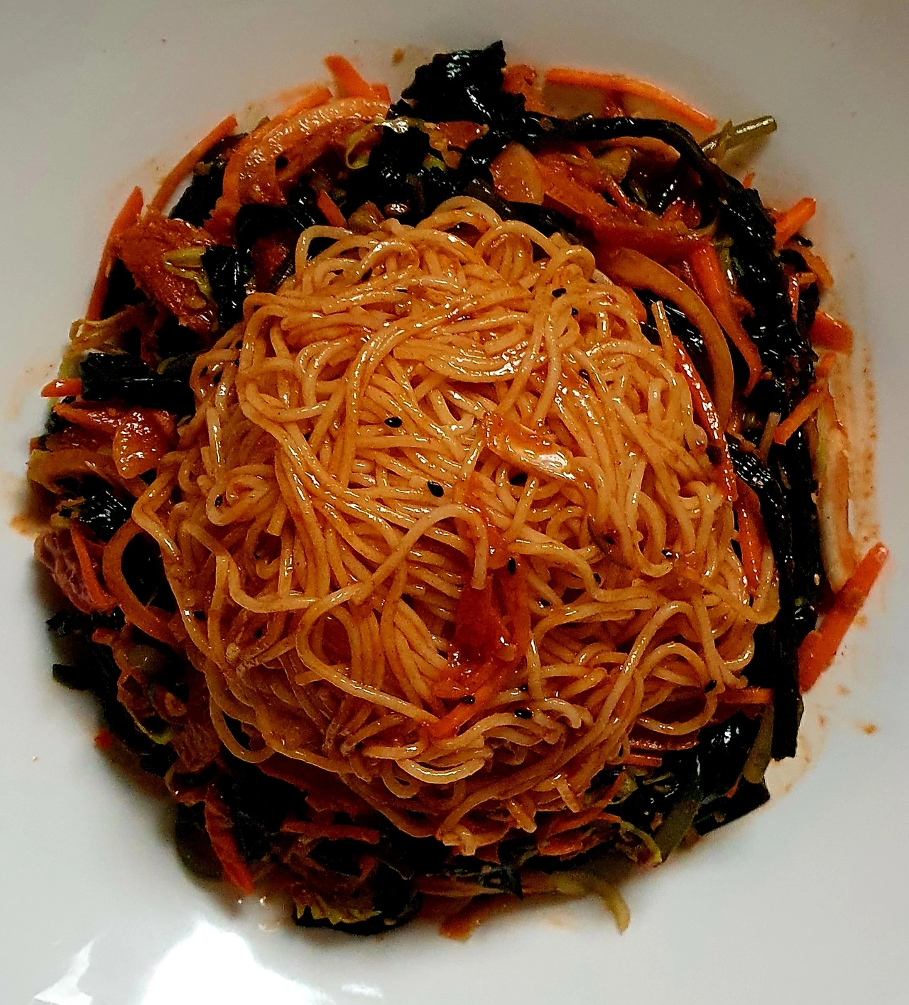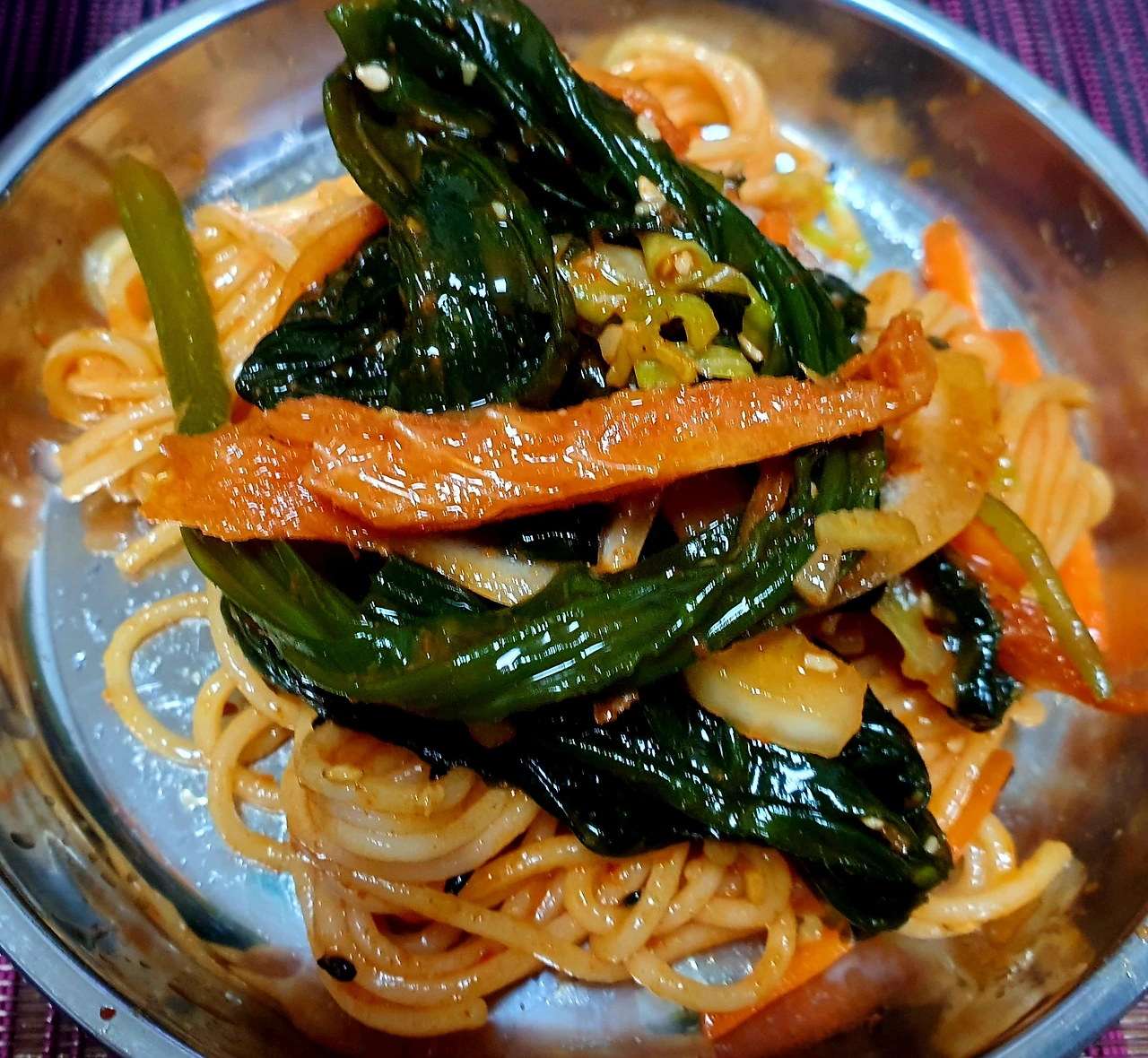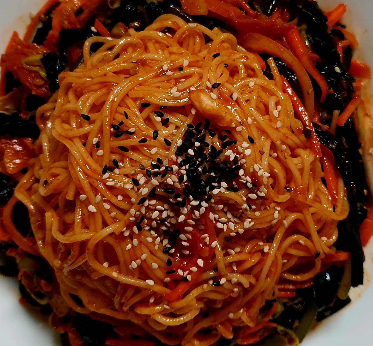 • 완성접시에 곰피무침과 비빔국수를 올리고 썰어 놓은 청양고추와 통깨로 마무리를 해주면 완성.