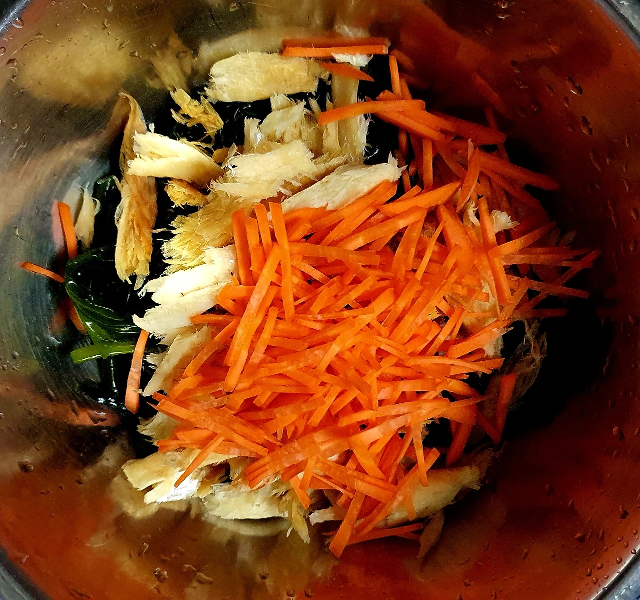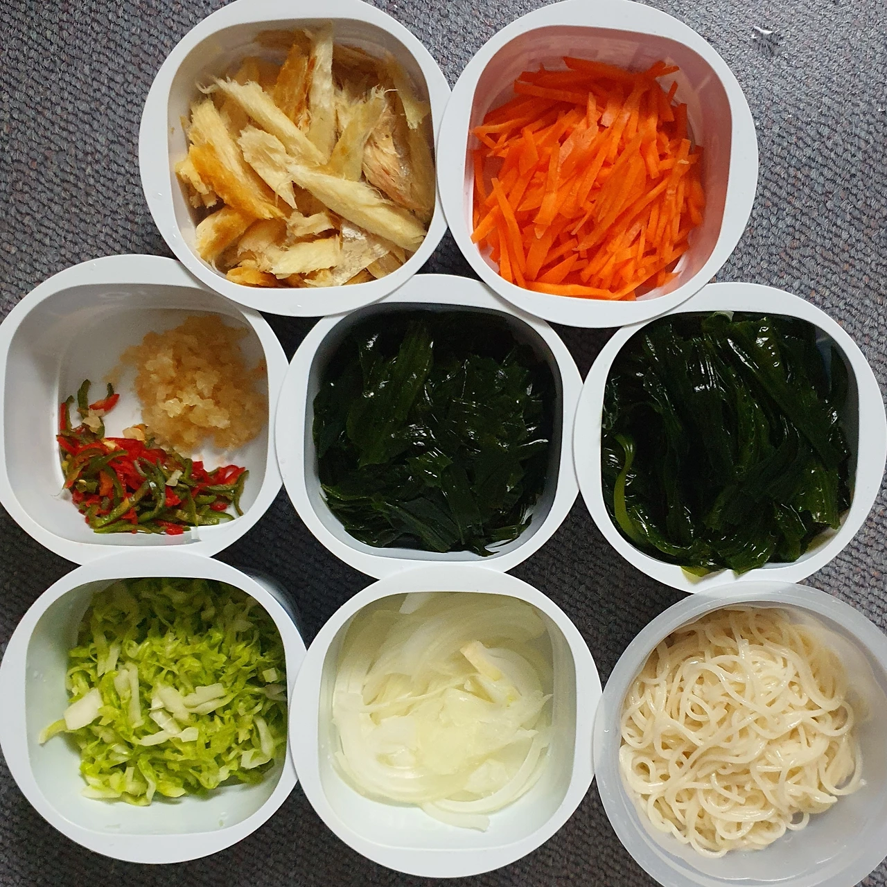 ● 재료 : 곰피2컵. 황태채1컵. 양배추½컵. 당근½컵. 양파⅓컵. 청양고추2개. 중면⅔인분