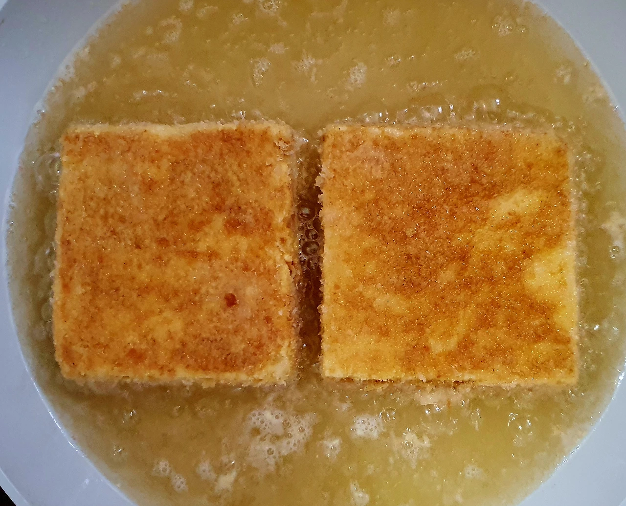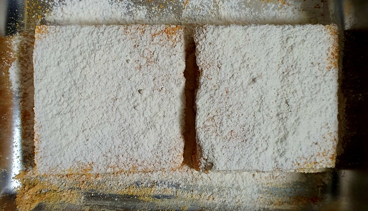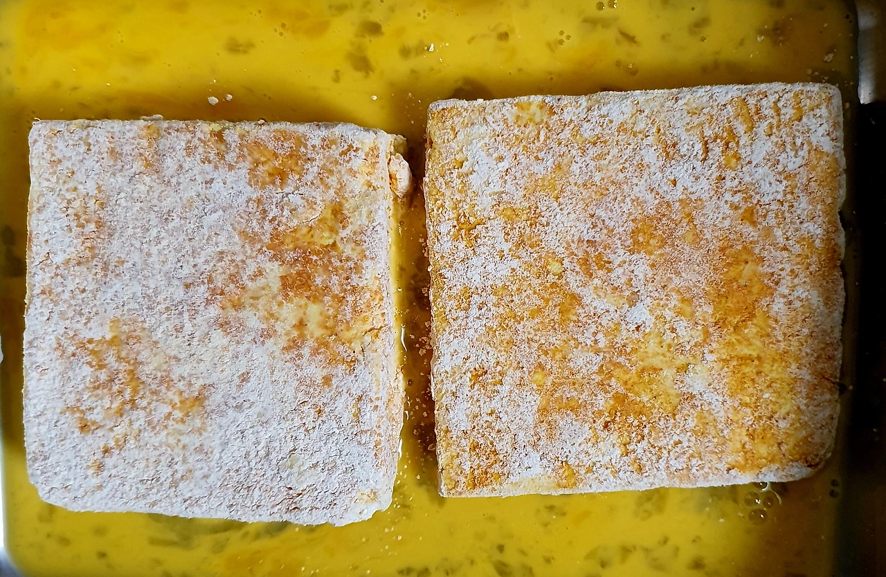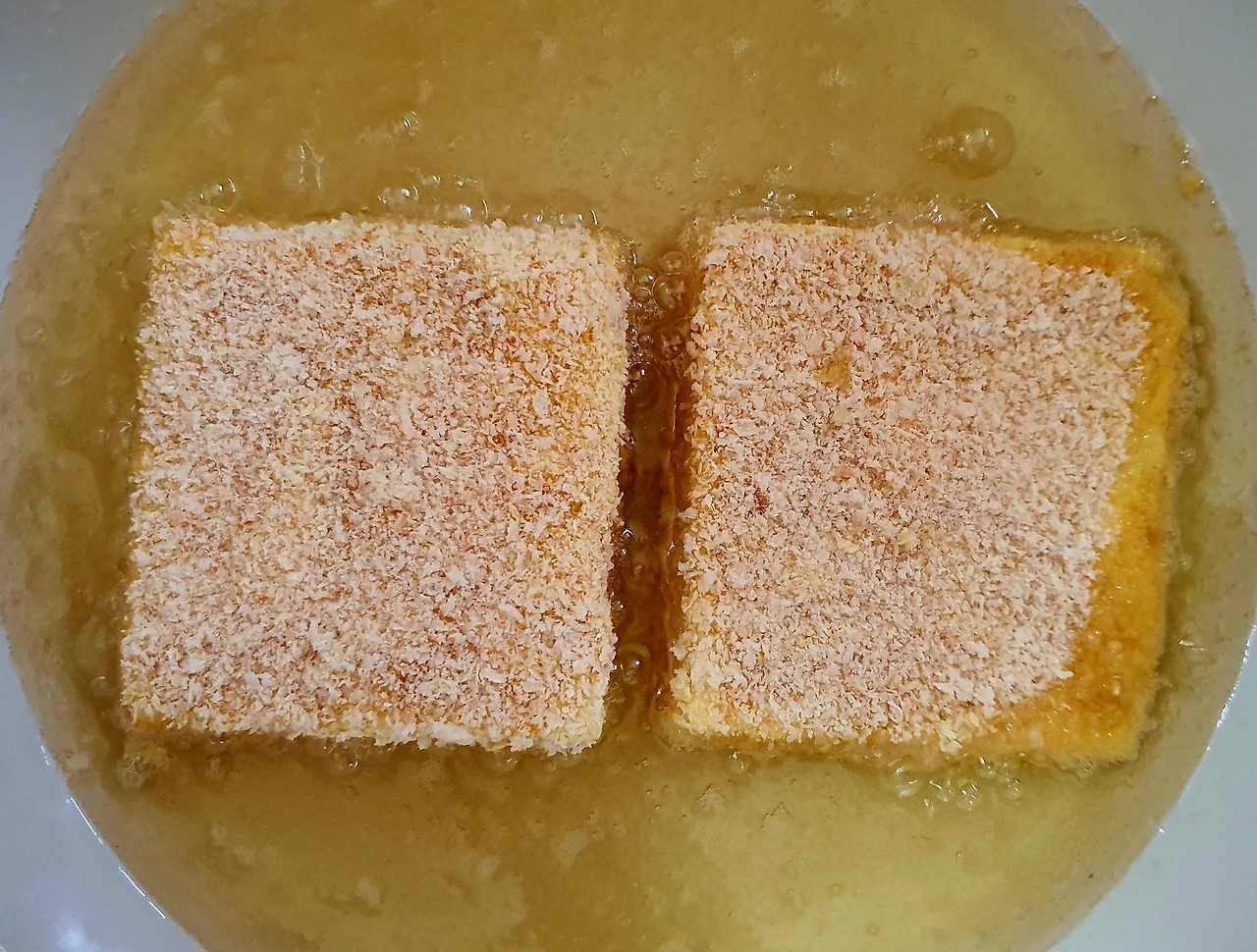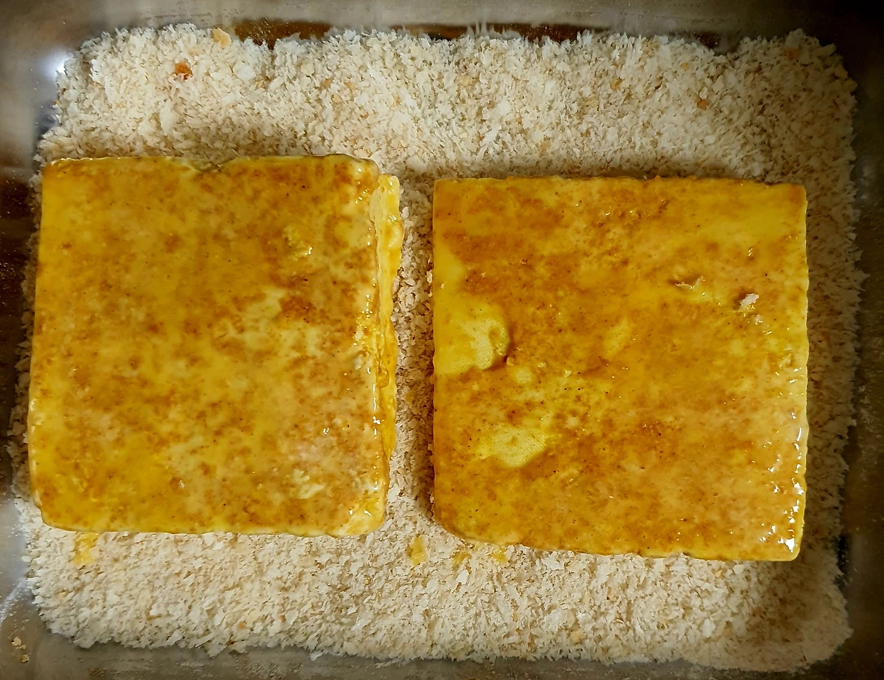 • 두부는 얇게 반으로 잘라 소금과 후추를 뿌리고 키친타월로 수분을 제거하고 카레가루를 톡톡 뿌려 기본 간을 하고 전분가루를 입혀 준다. 달걀은 잘 풀어 달걀물을 준비하고, 빵가루도 준비한다.