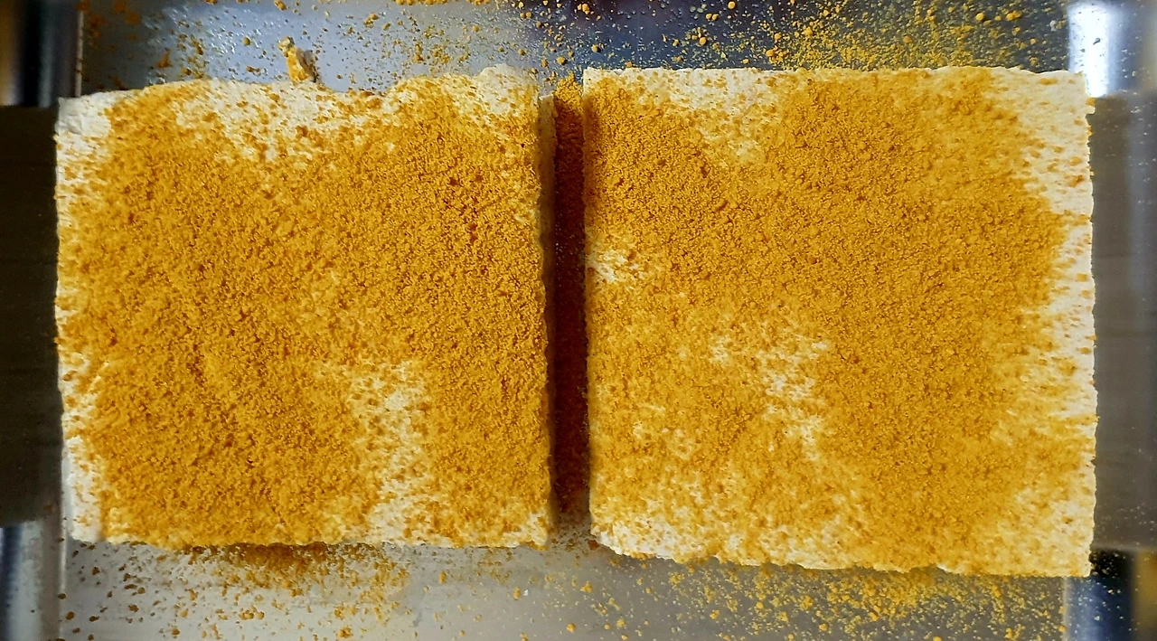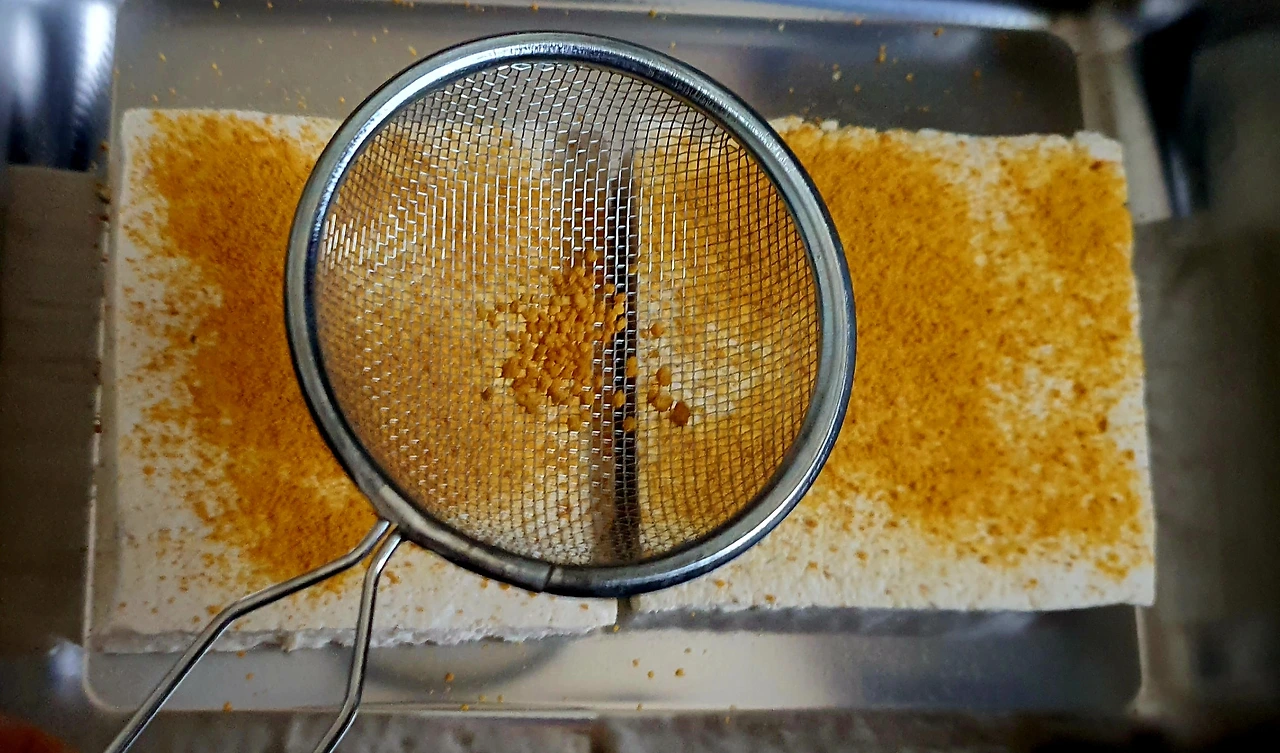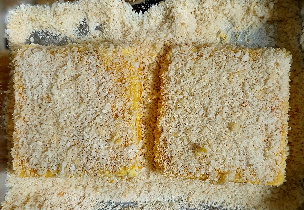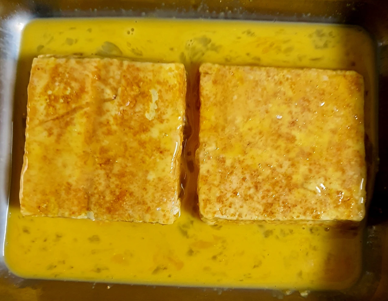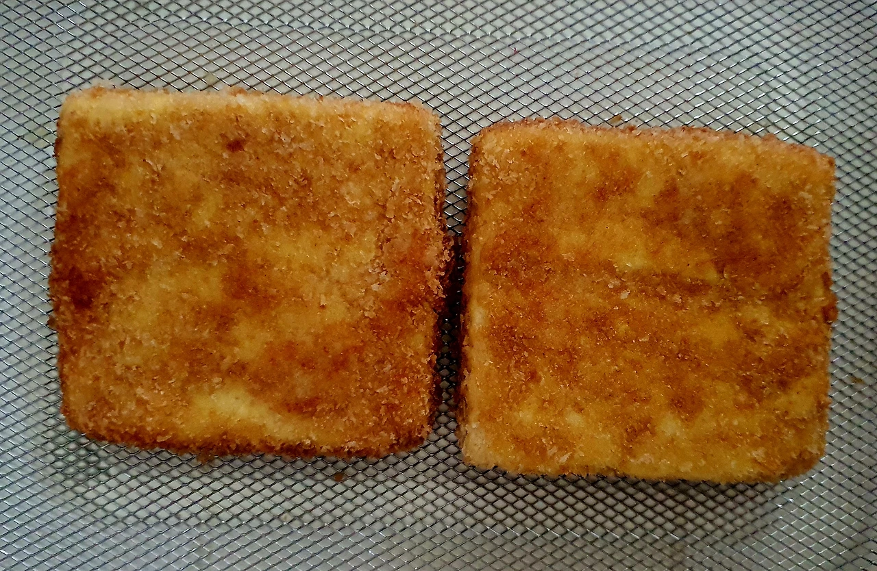 • 두부는 얇게 반으로 잘라 소금과 후추를 뿌리고 키친타월로 수분을 제거하고 카레가루를 톡톡 뿌려 기본 간을 하고 전분가루를 입혀 준다. 달걀은 잘 풀어 달걀물을 준비하고, 빵가루도 준비한다.