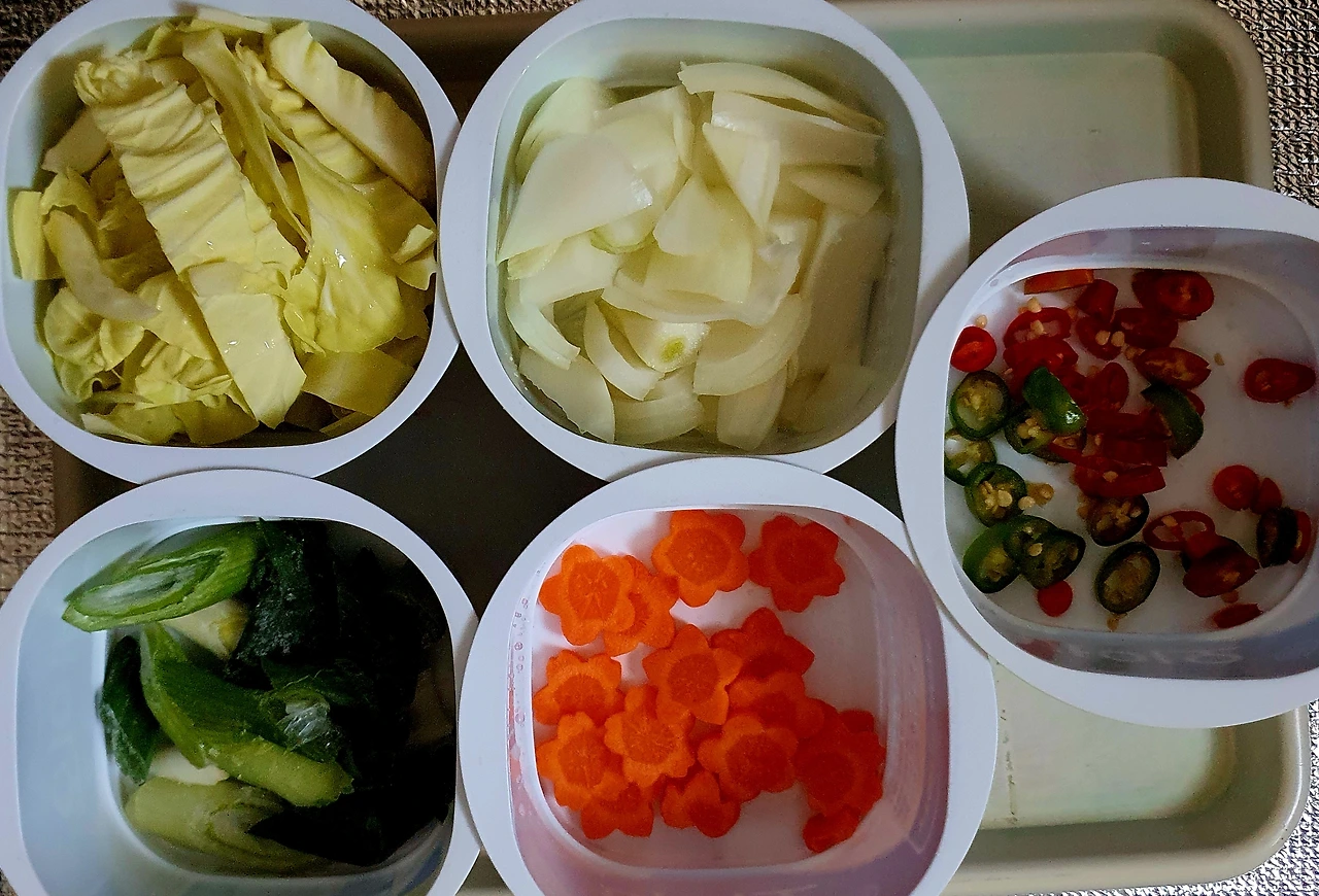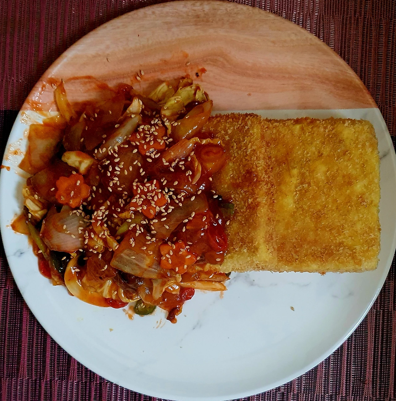 • 기름을 넉넉히 두르고 전분을 입힌 두부를 달걀물을 바르고 빵가루를 입혀 앞뒤로 노릇하게 튀겨준다. 대파와 청양고추는 쫑쫑 썰고, 양파와 양배추. 당근은 보기 좋게 썰어 둔다.