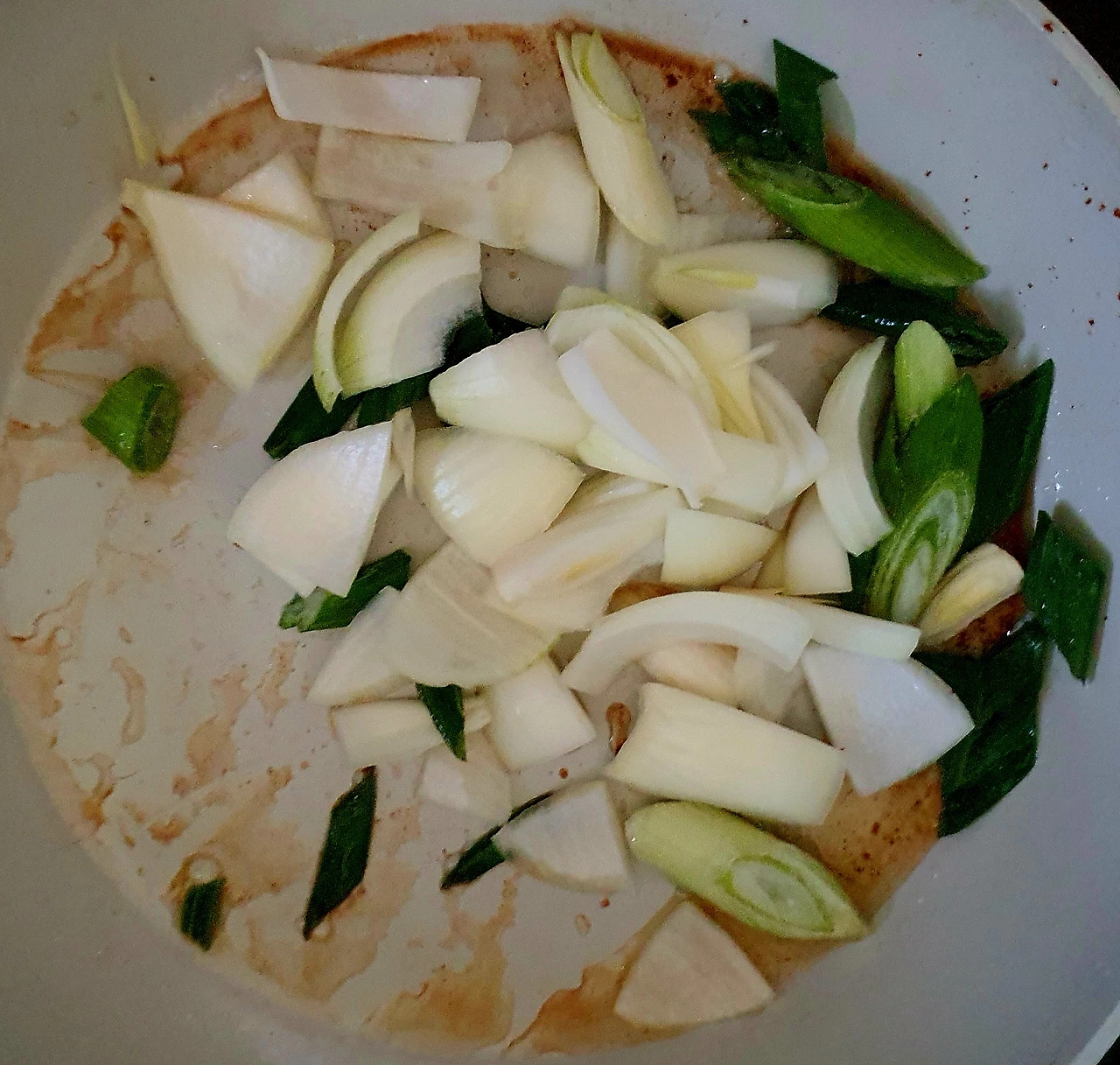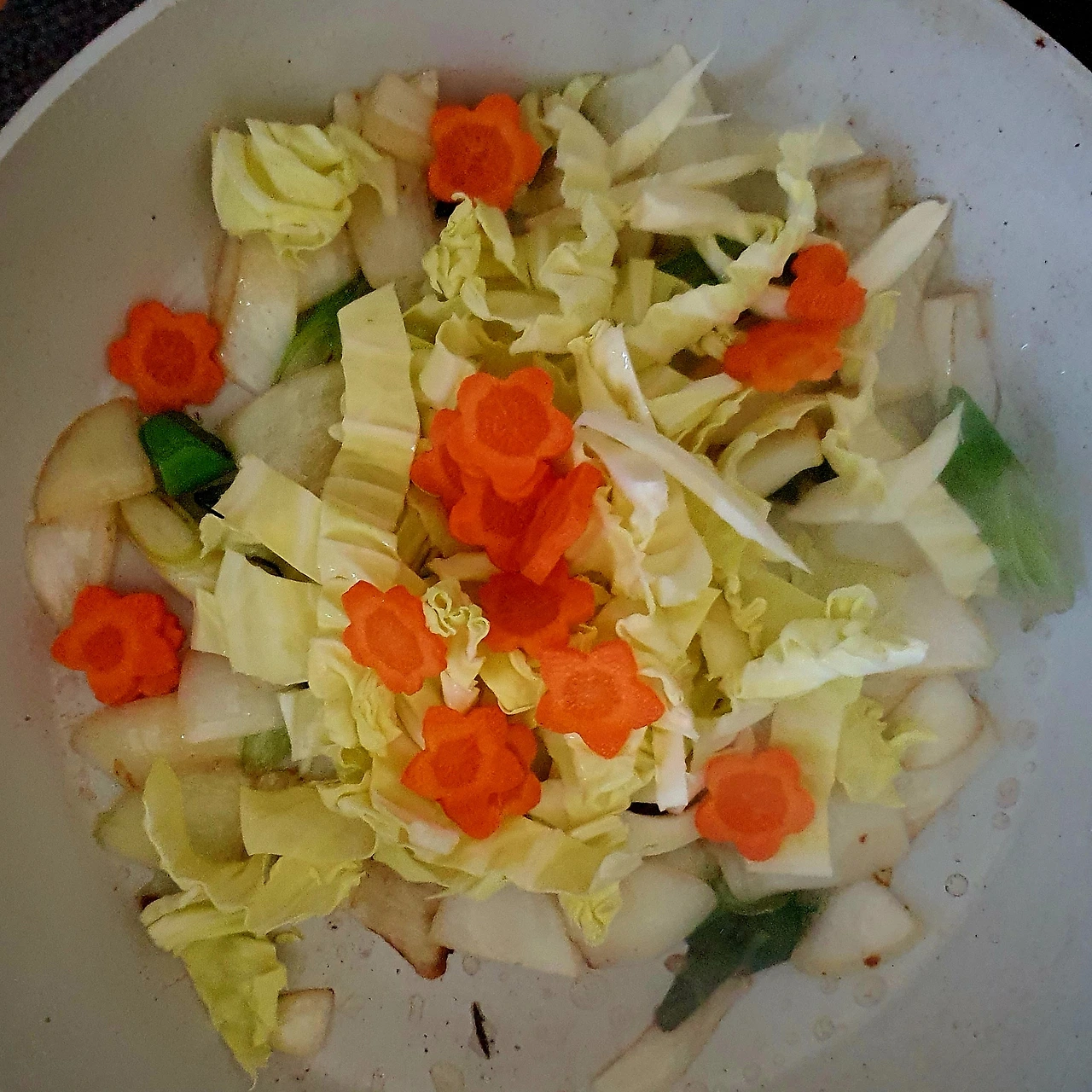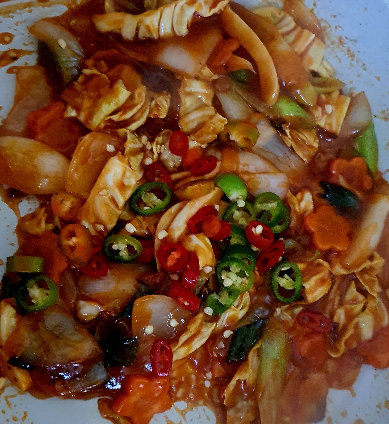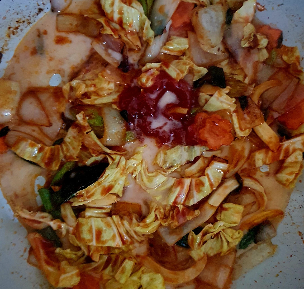 • 노릇하게 튀겨진 두부는 건져내고 남은 기름을 따라 내고 대파. 양파를 넣고 볶다가 양배추와 당근. 양념재료를 넣고 끓이듯 볶아준다.
