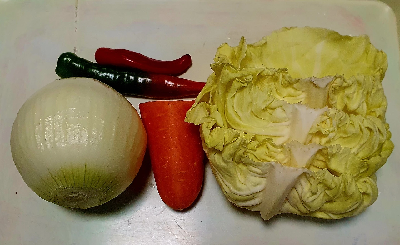 ■ 재료 : 두부 1모(카레가루. 전분가루. 달걀. 빵가루). 대파⅓대. 양파½개. 양배추 1컵. 당근¼개. 청양고추 2개. 통깨