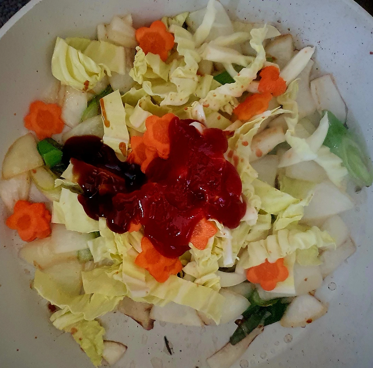 • 양배추가 숨이 죽으면 불을 끄고 청양고추를 넣고 잔열에 살짝만 볶아준다.