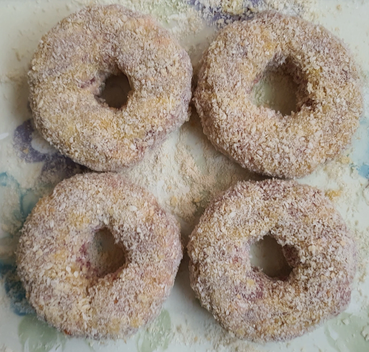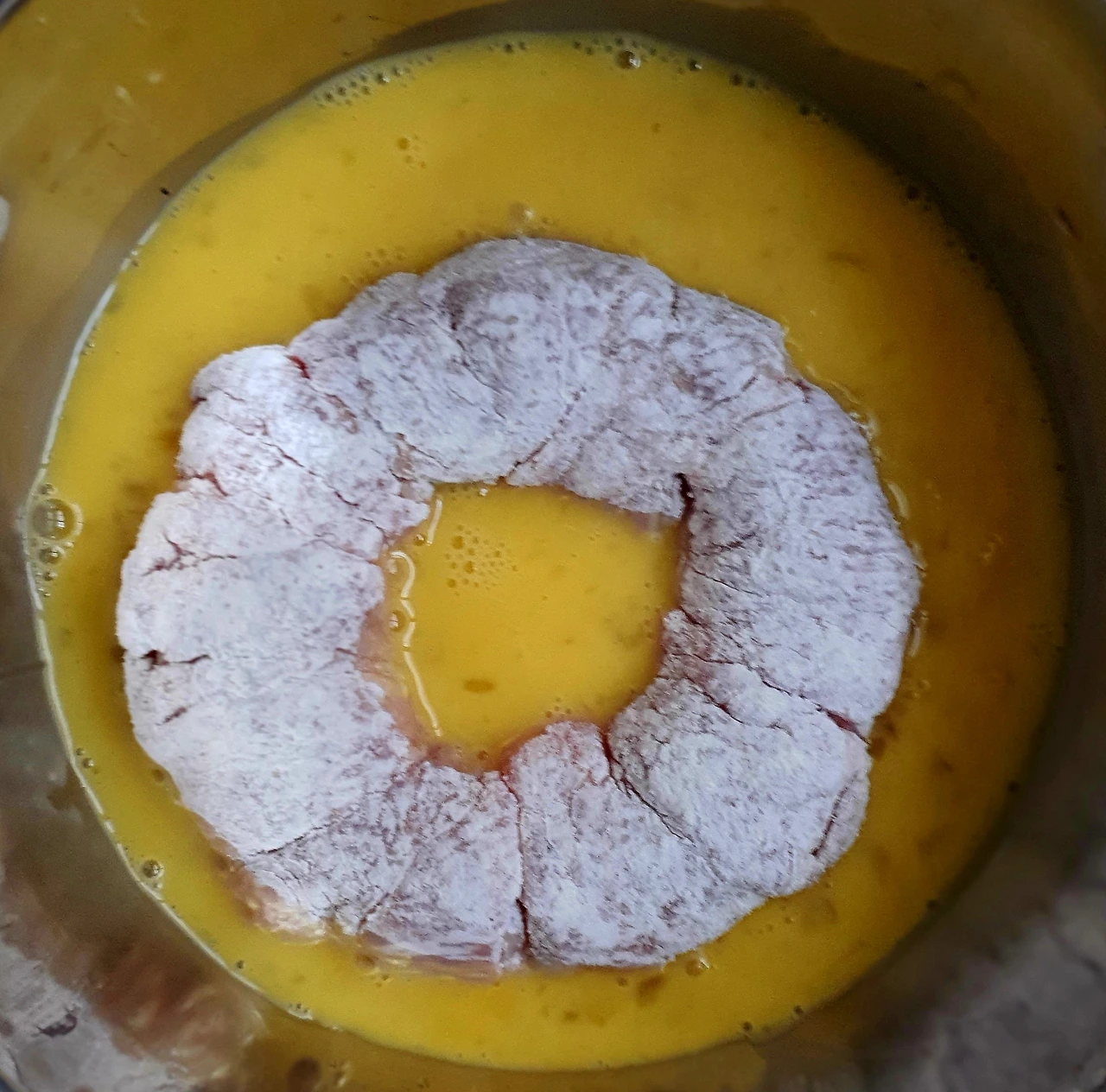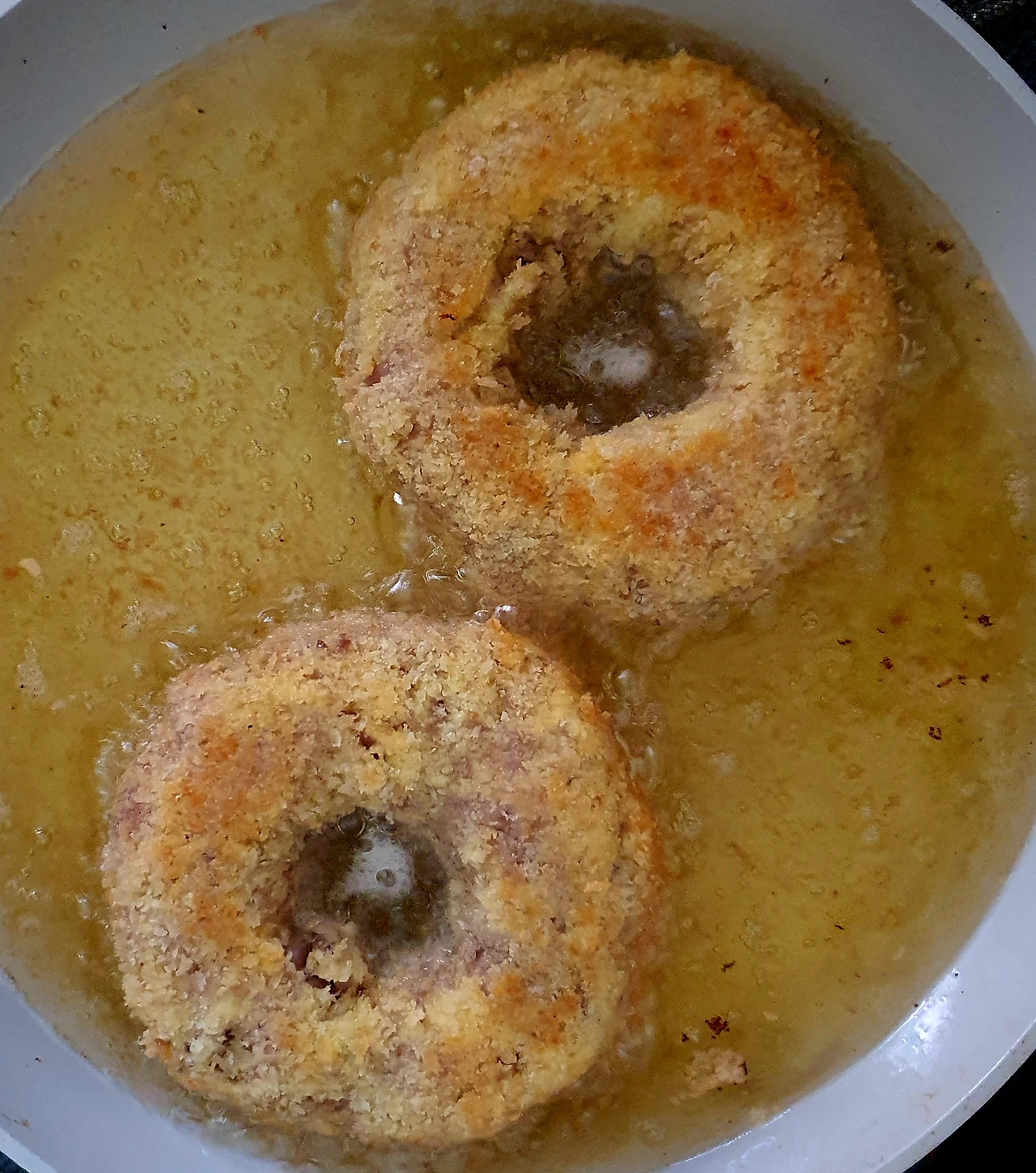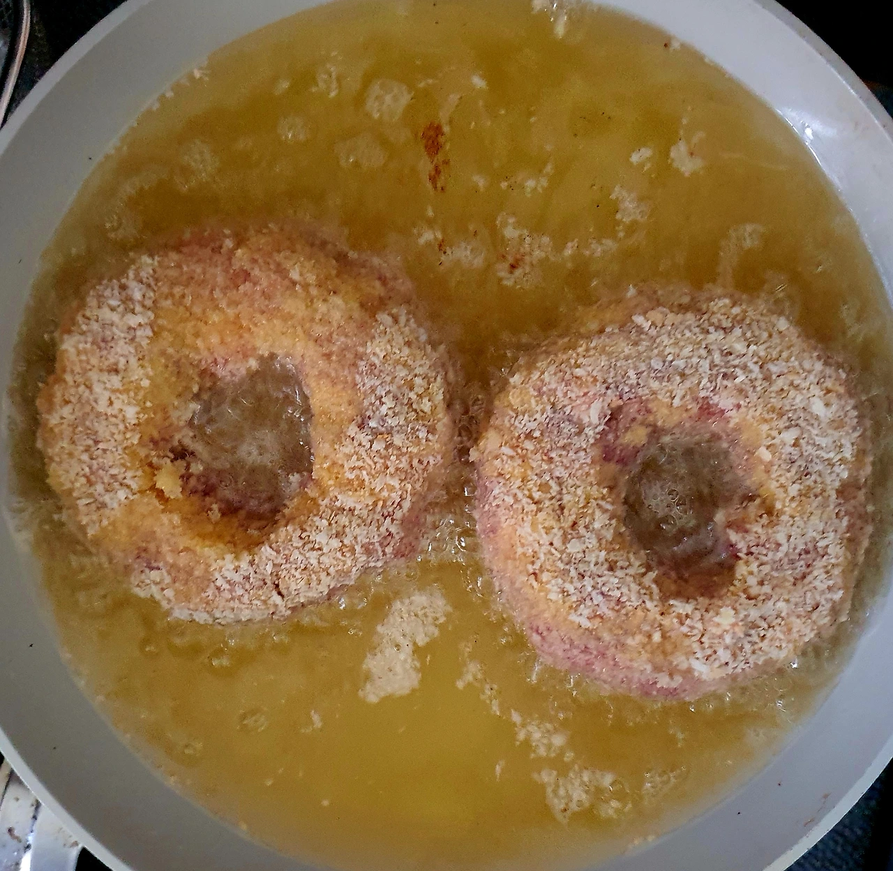 • 준비한 돼지고기를 달걀물에 담갔다가 빵가루를 꼭꼭 눌러 입혀준 다음 앞뒤로 노릇하게 튀겨준다.